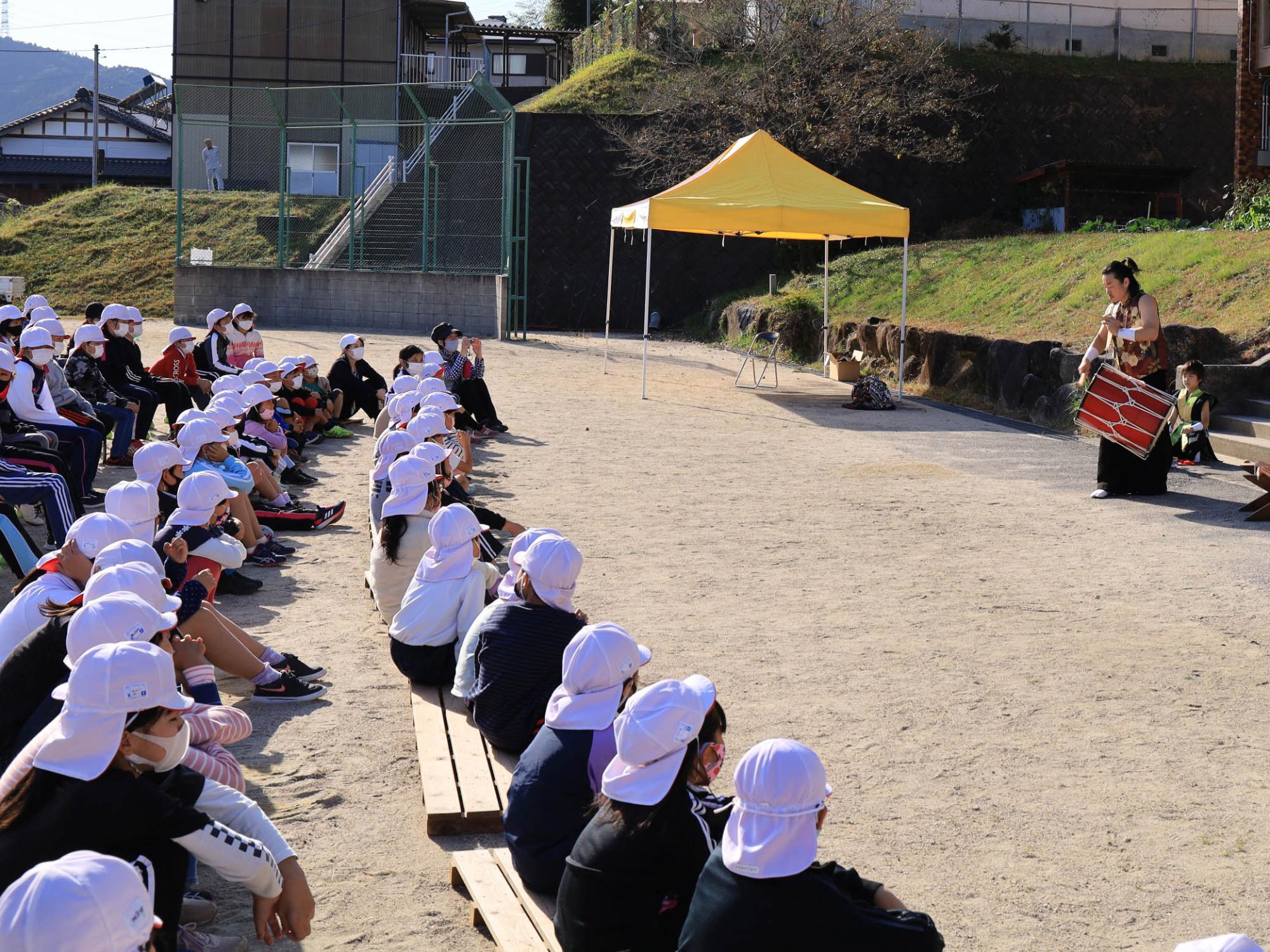 11月4日、秋晴れの中野方小学校グラウンドで、第21回中野方町ほたるコンサートが開催され、同校の全校児童と地域住民合わせた約100人が参加しました。このコンサートは本来6月に開催し、大井町出身で和太鼓奏者の加藤拓三さんが演奏する予定でしたが、今年はコロナ禍のため6月の開催を断念。しかし、加藤拓三さんの演奏を聴きたいと、町民からの強い要望を受け実現しました。