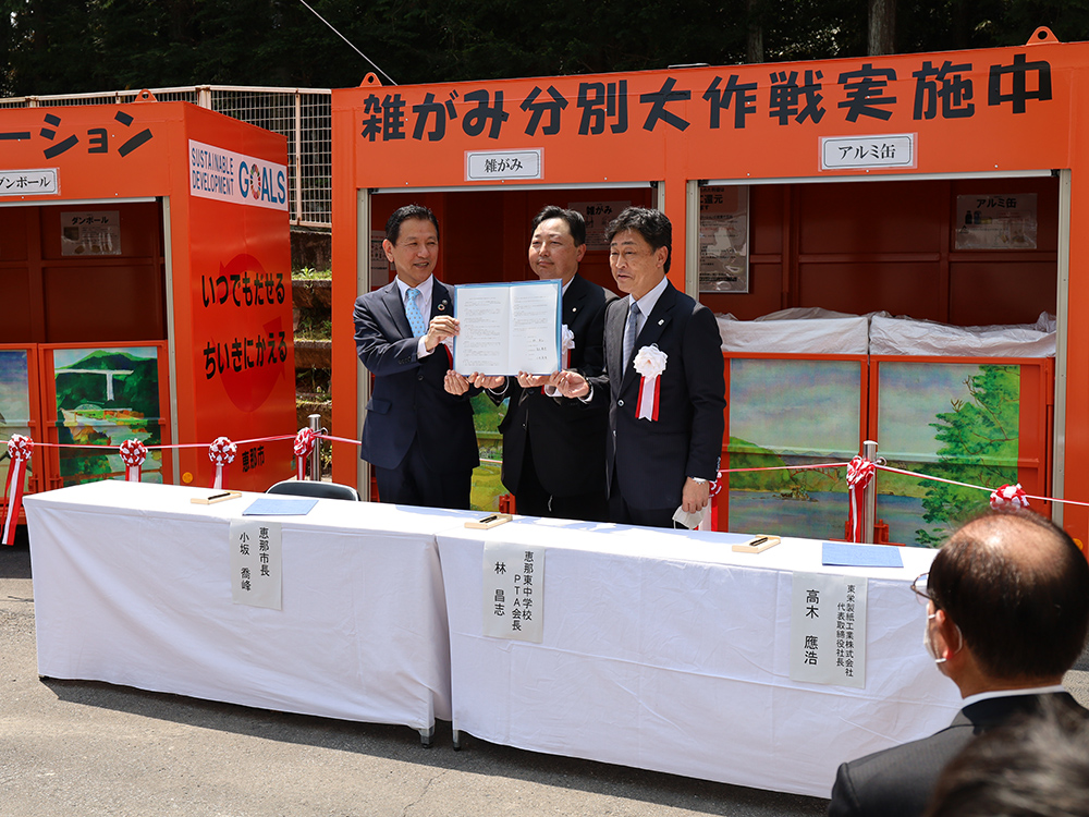 恵那東中学校PTA、東栄製紙株式会社、市による覚書への署名を披露