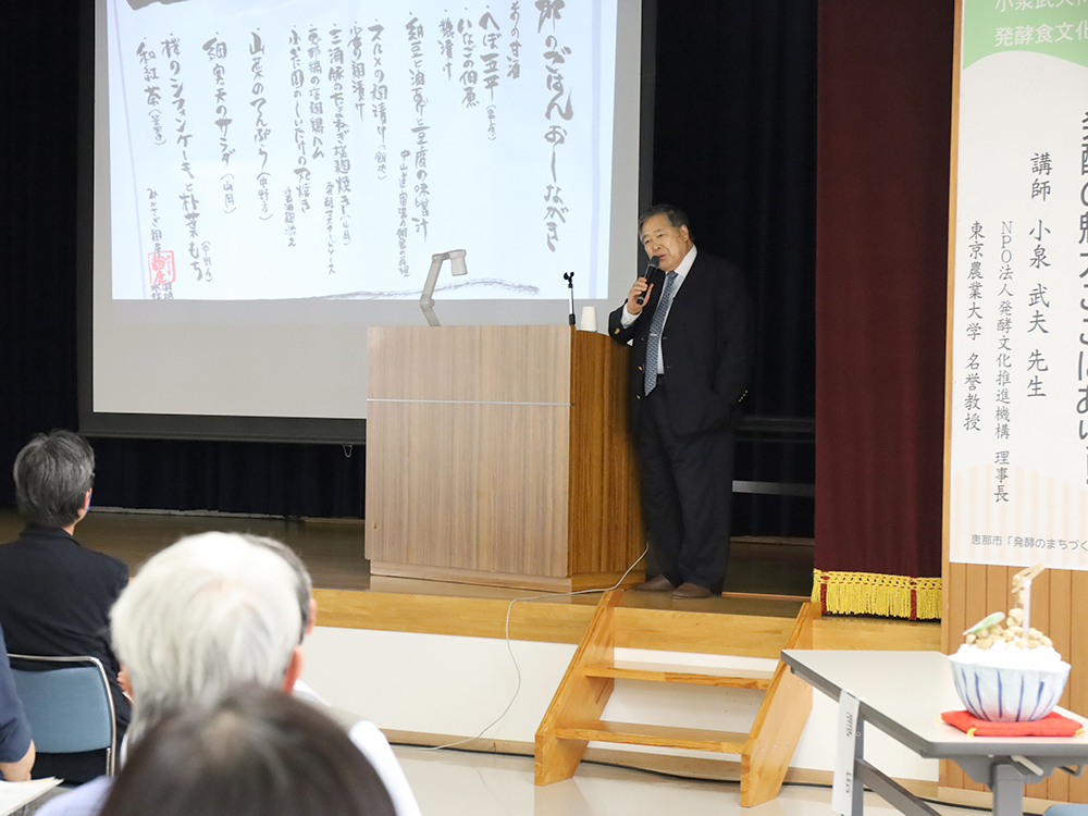 4月23日、市たべる推進協議会のアドバイザーである小泉武夫氏を講師に招き、「発酵で健康」をテーマに発酵食文化セミナーが開催されました。