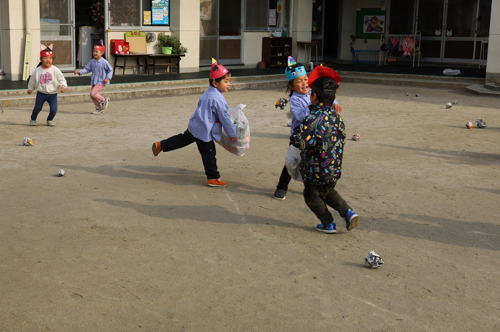 園庭で豆を投げる練習をしていた2月3日、突然赤鬼と緑鬼がやってきました。泣き出したり怖がったりして逃げてしまう園児もいましたが、年長児たちは勇気を振り絞って「鬼は外、福は内」と大声で叫びながら豆を投げました。たくさんの豆を投げられた鬼は、すっかり観念して笠置山に帰っていきました。