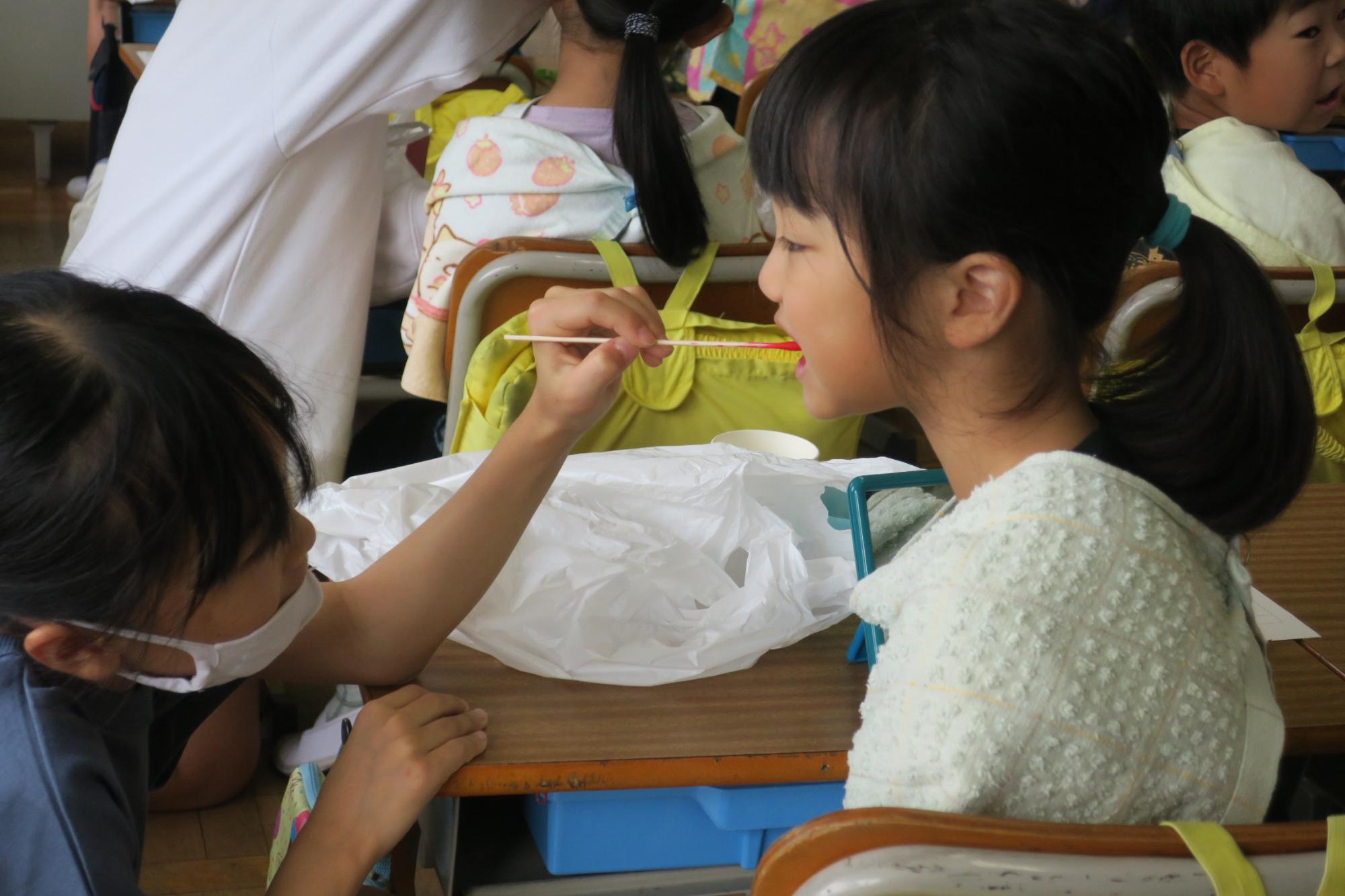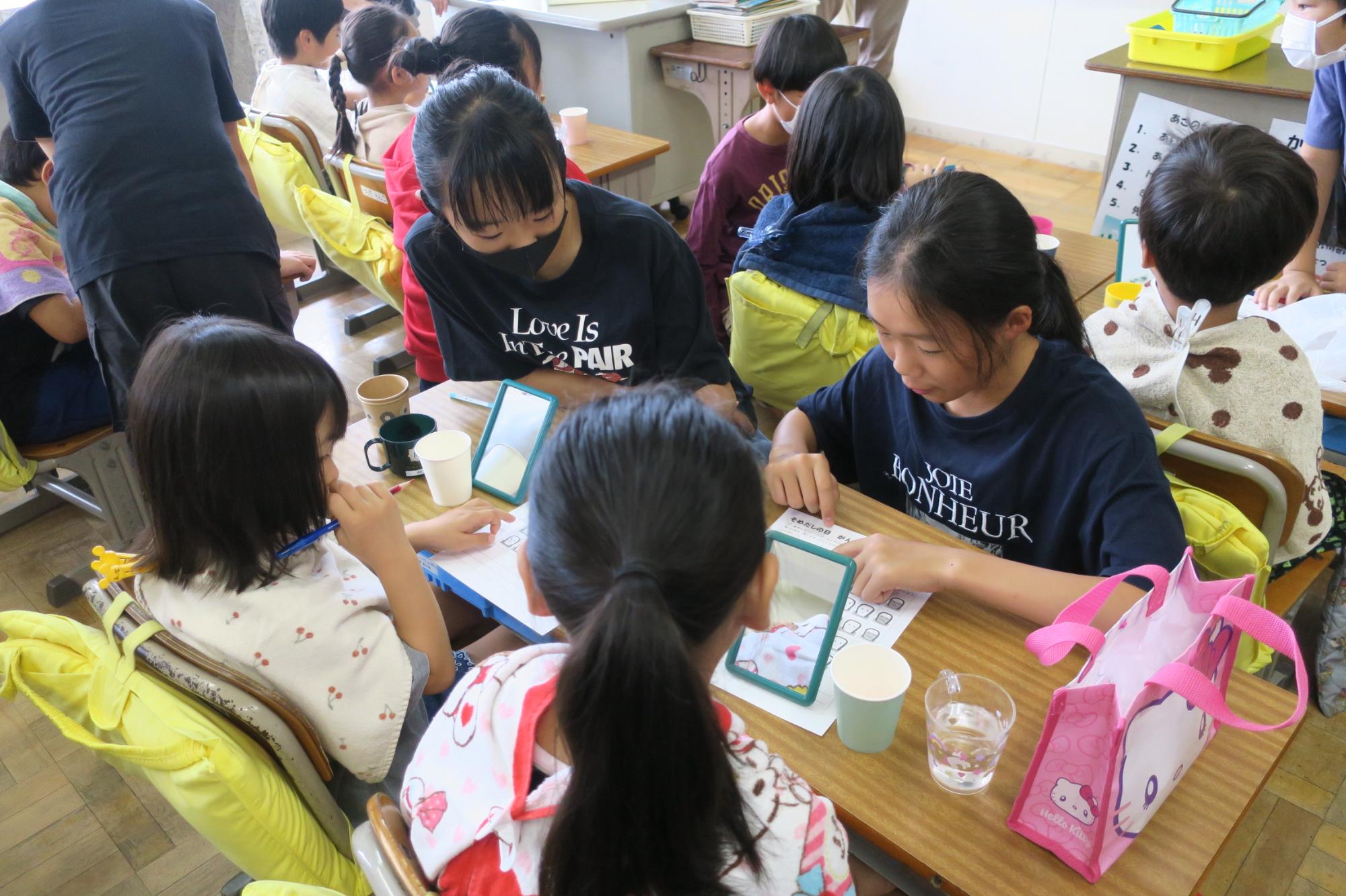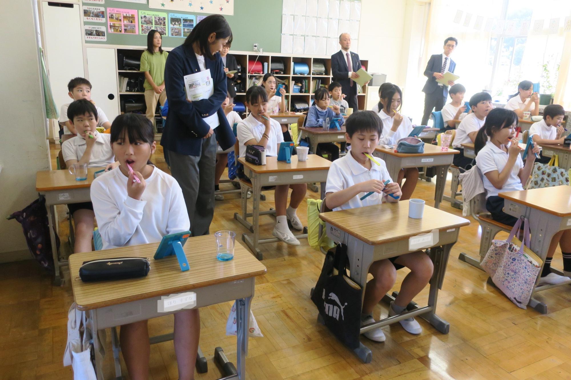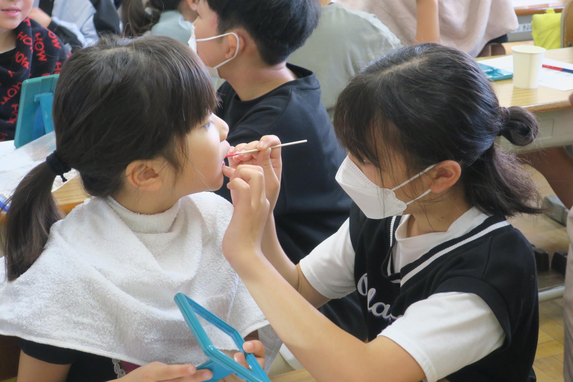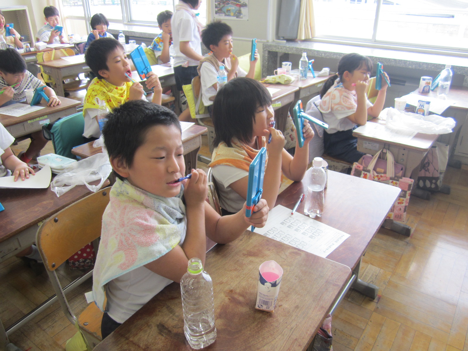 小学生の時期の「歯と口の健康」は、一生に関わります。乳歯から永久歯に生えかわる、12歳臼歯まで生えそろうという時期であるだけでなく、歯みがきや口腔内の健康に関する知識を増やして自分のやり方や生活習慣について見直し、実践する力を高めていく時期でもあります。実地審査では、これまでの実践の説明の後、実際に代表の学年が歯みがきや「あいうべ体操」の様子を見ていただきました。また、松村学校歯科医様、伊藤家庭教育委員長様もお越しくださって、説明を助けてくださいました。歯の染め出しなど、ご家族の皆様にもご協力をいただき、ありがとうございます。大事な歯と口腔内の健康が保たれるよう、今後も学習を続けて参ります。