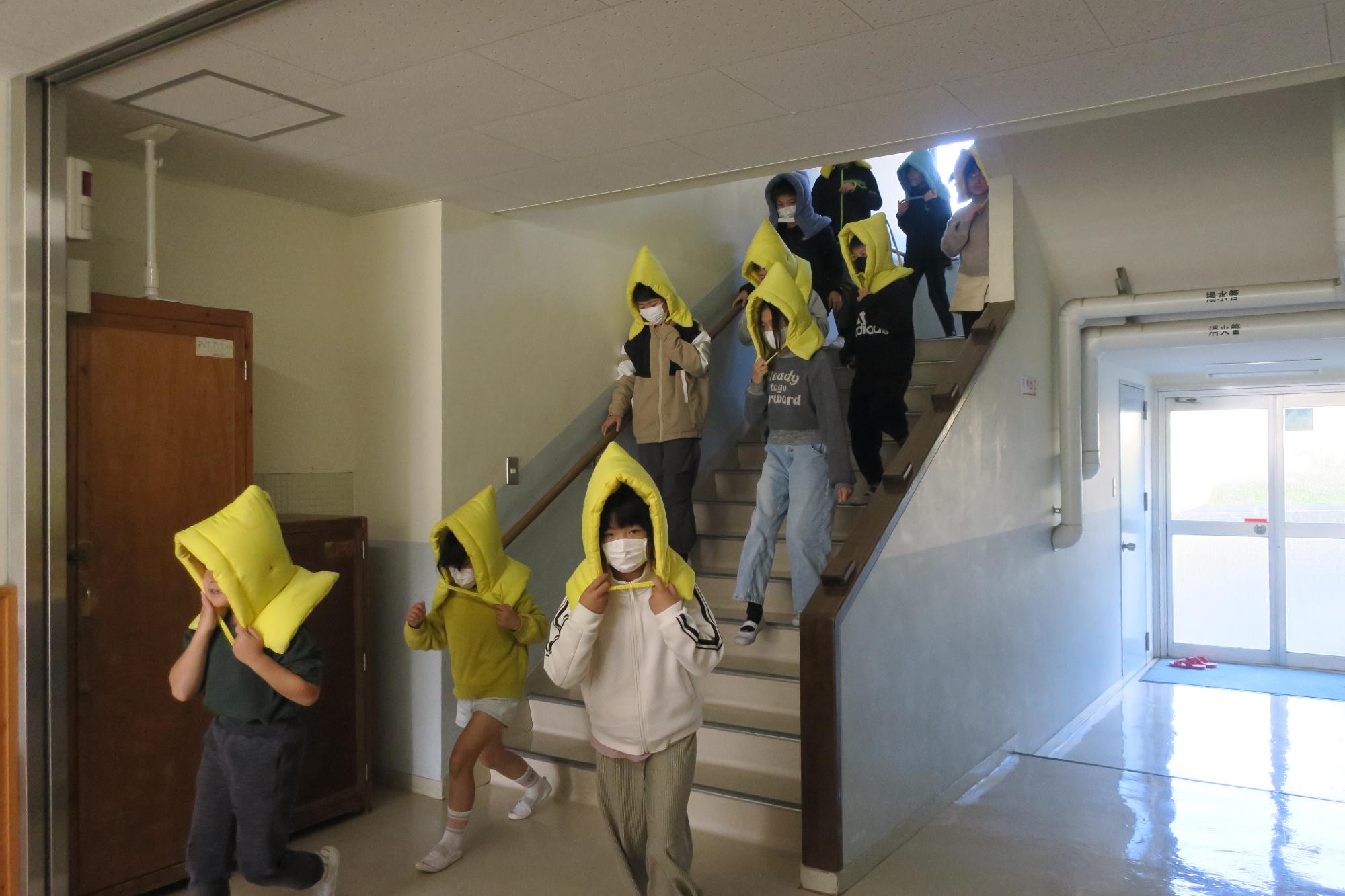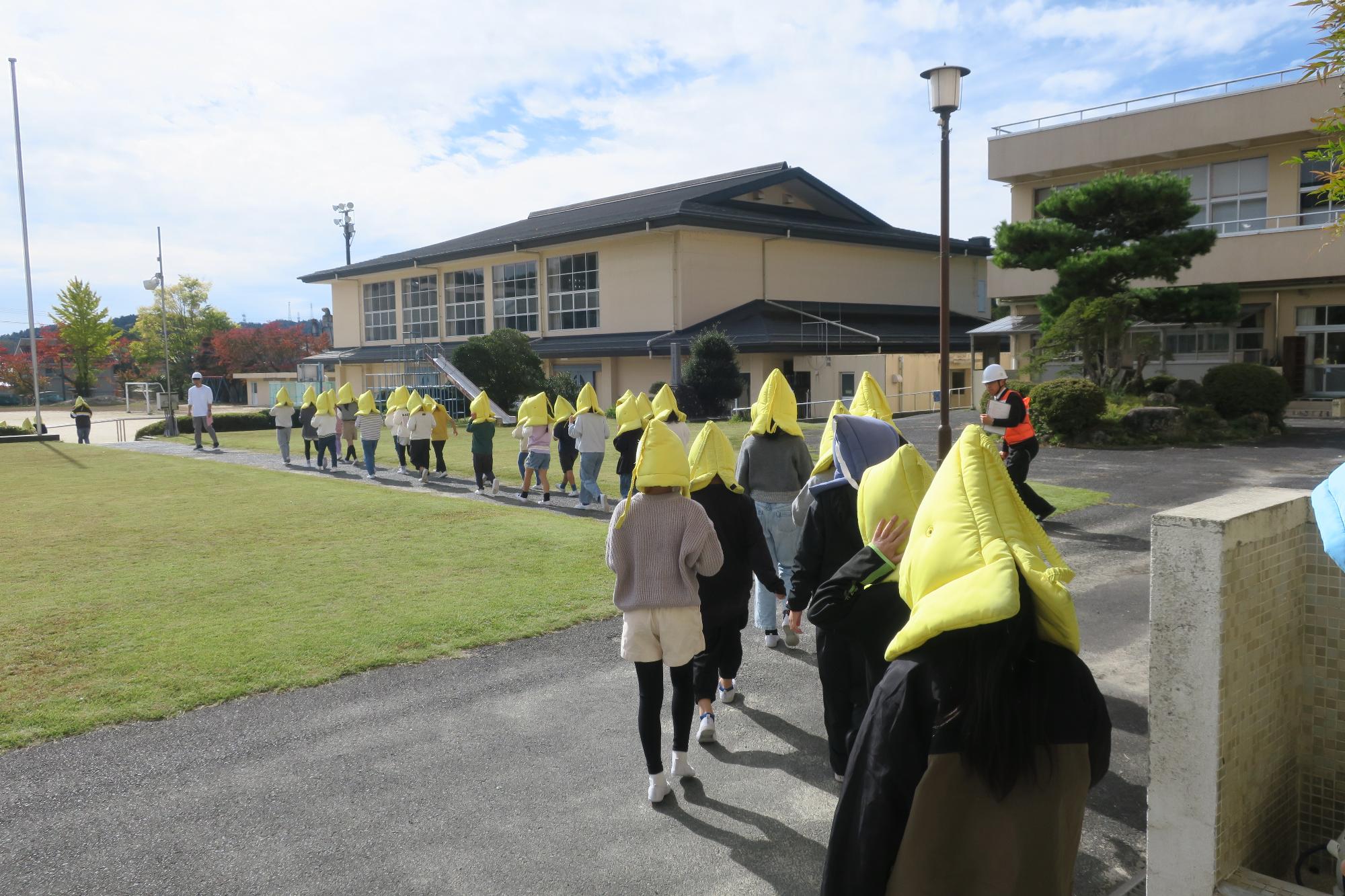 外に出てからも走らずに落ち着いて避難します