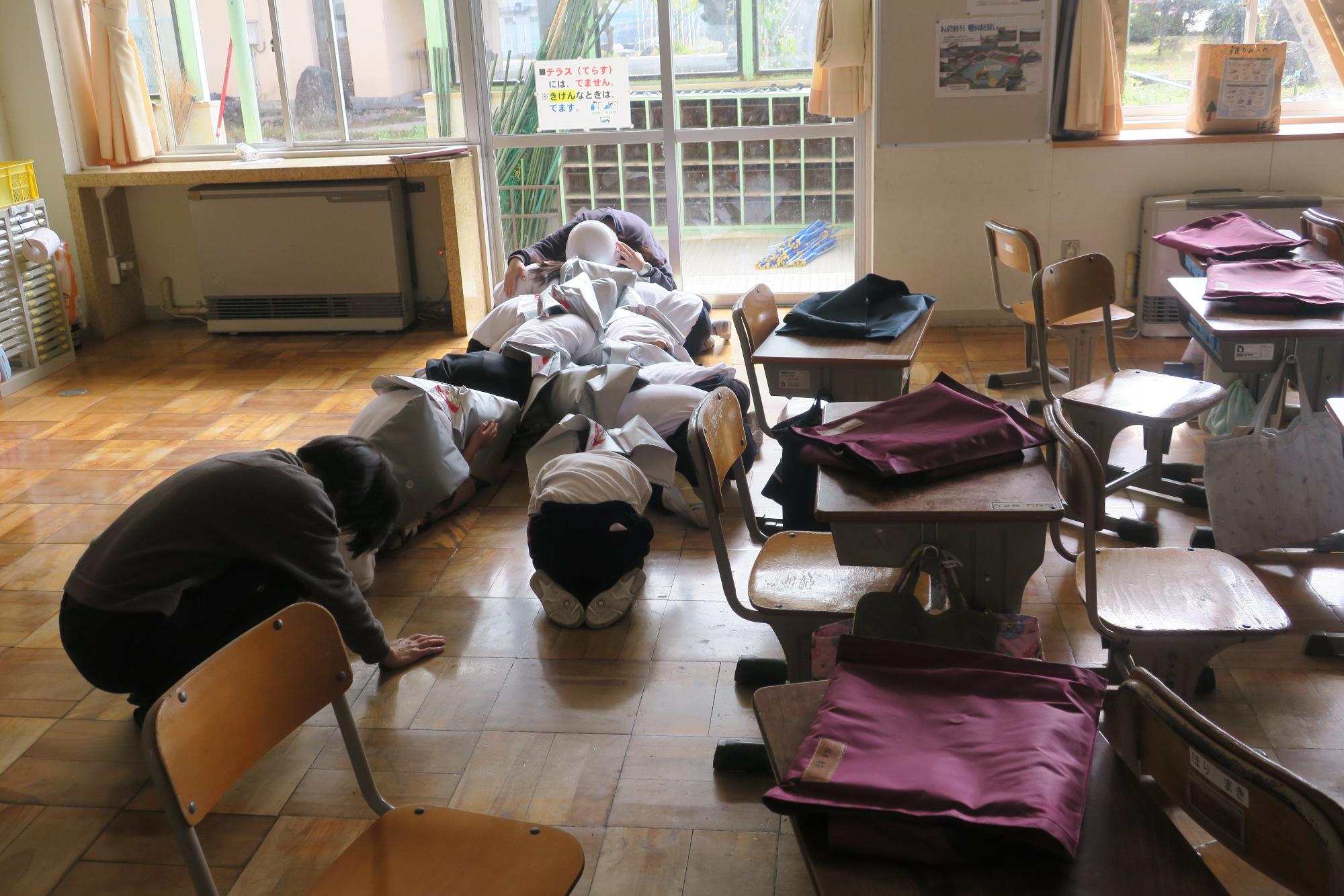 11月の命を守る訓練の様子です。今回の訓練では、実際に地震が起こってしまったことを想定し、一回目の揺れで長く机の下に身を隠しました。その後、避難しかけたところで再度大きな揺れが来たという放送が入り、頭を守る動きをしました。更に、先生方が救助活動をしていて人数確認ができないことを想定し、外に出て並んでからは子供たちが当日のクラスの人数と避難状況を報告する練習を行いました。実際に災害が起こってしまうと、大人は救済活動や消火活動に行かなくてはならない場面がありますので、子供たちが自分たちで命を守るための次の動きができるとよいなと考えています。