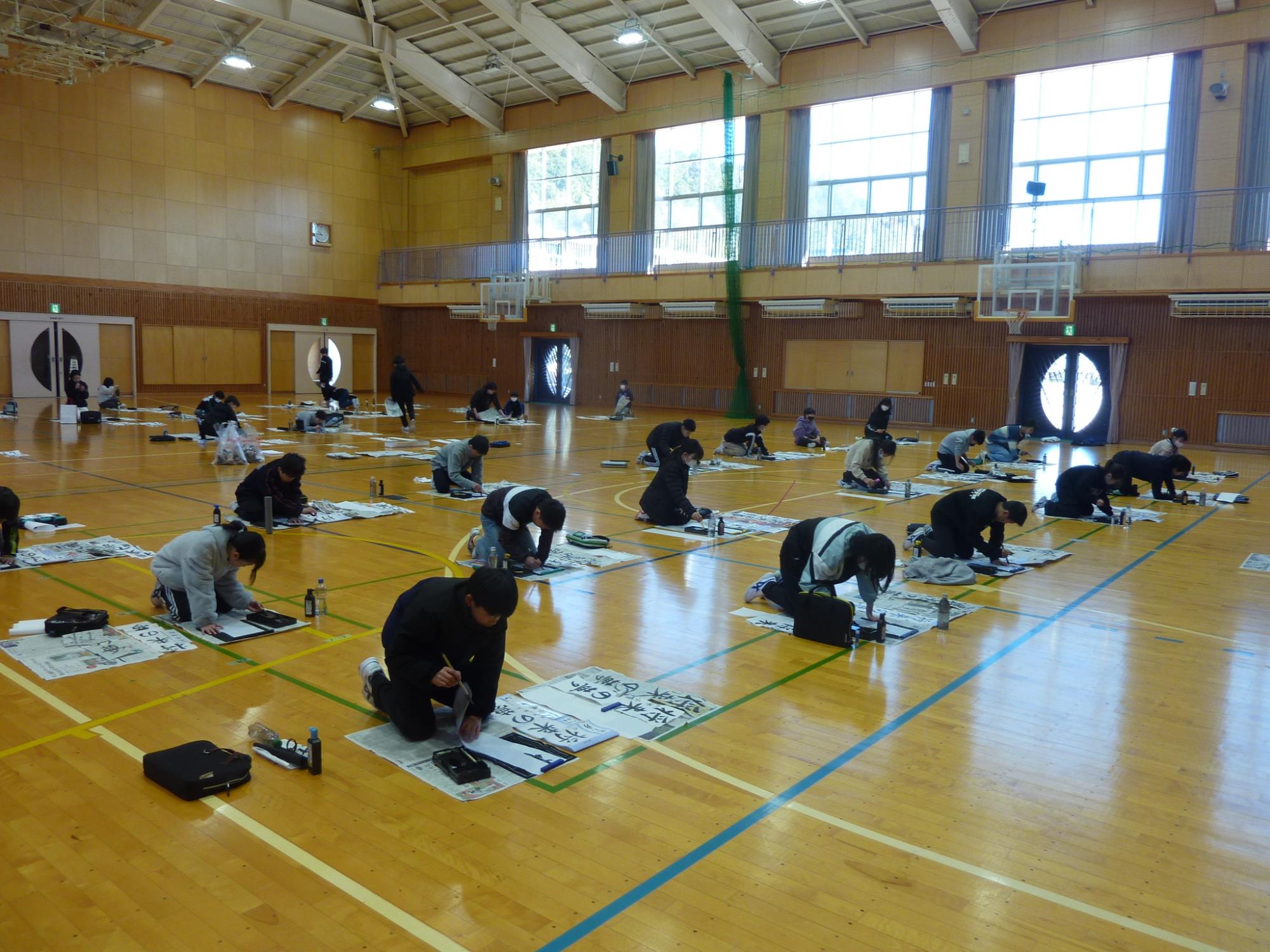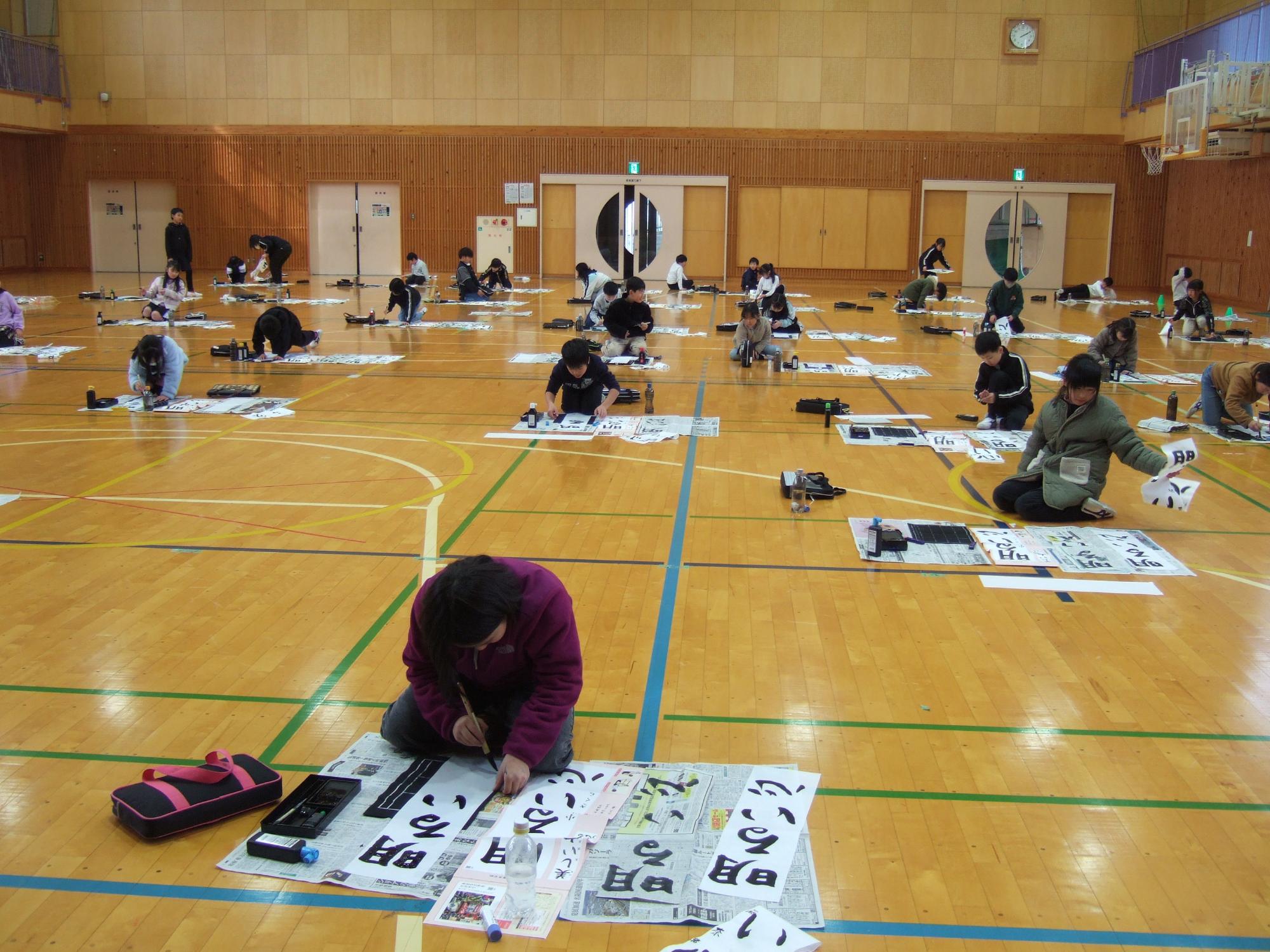 本番の書き初め大会は体育館で行いました。エアコンが使えるので、よい環境で集中して書くことができました。1・2年生は硬筆の書き初めを行いました。どの学年も、一文字ずつよく見て丁寧に慎重に本番の書き初めを行っていました。6年生の事前指導の様子と体育館での書き初めを紹介します。