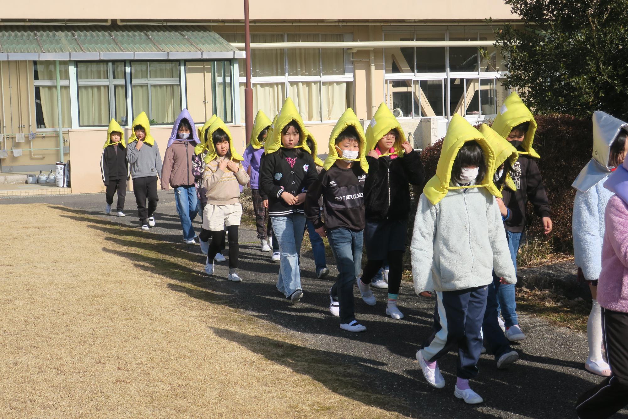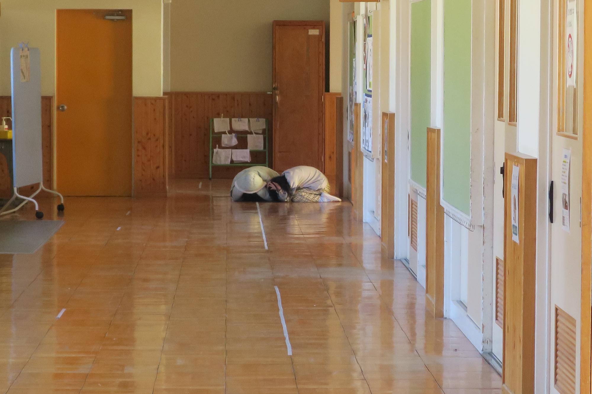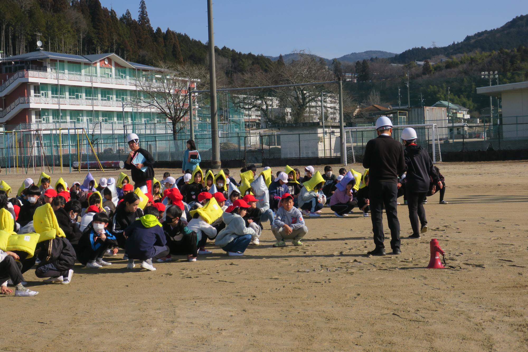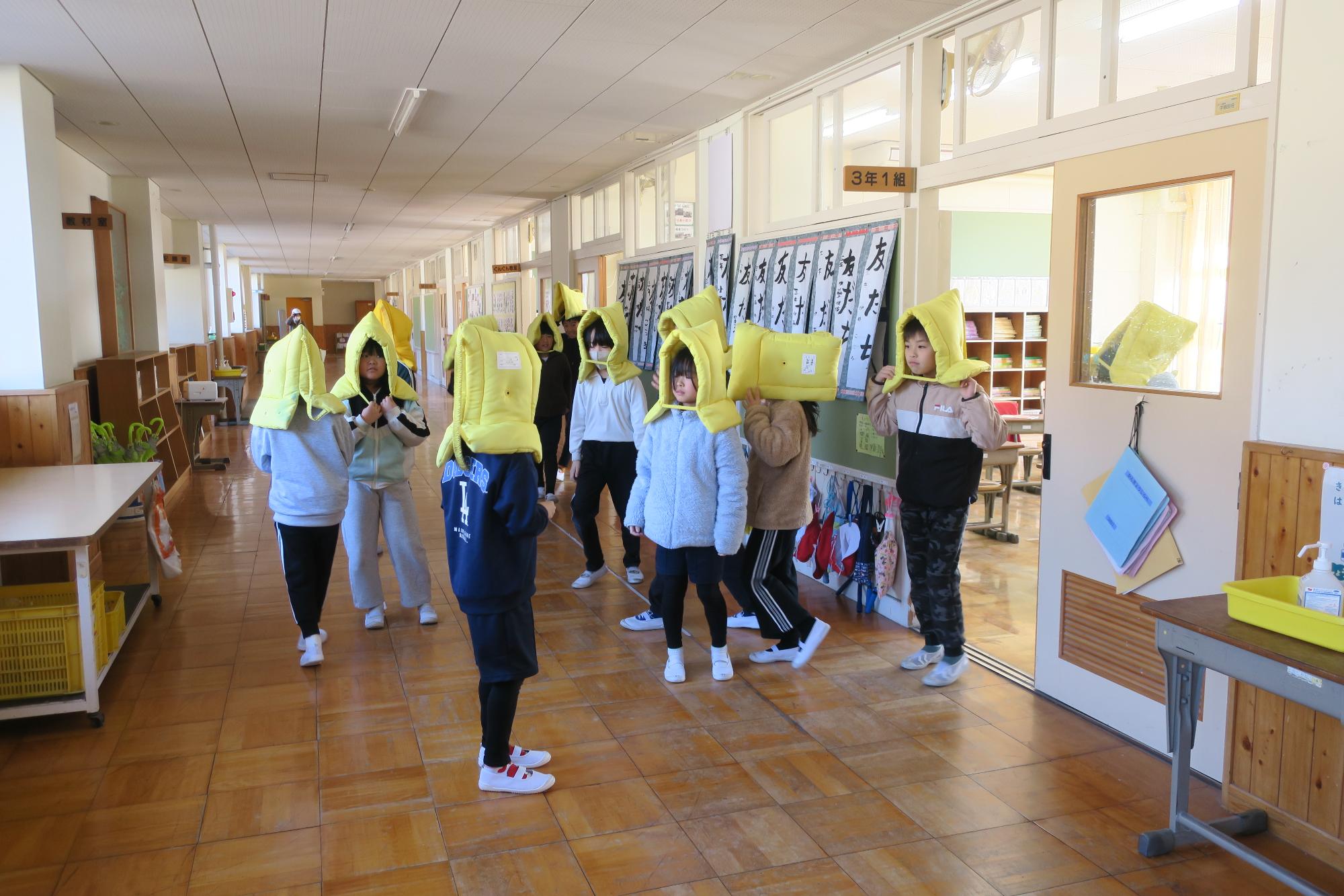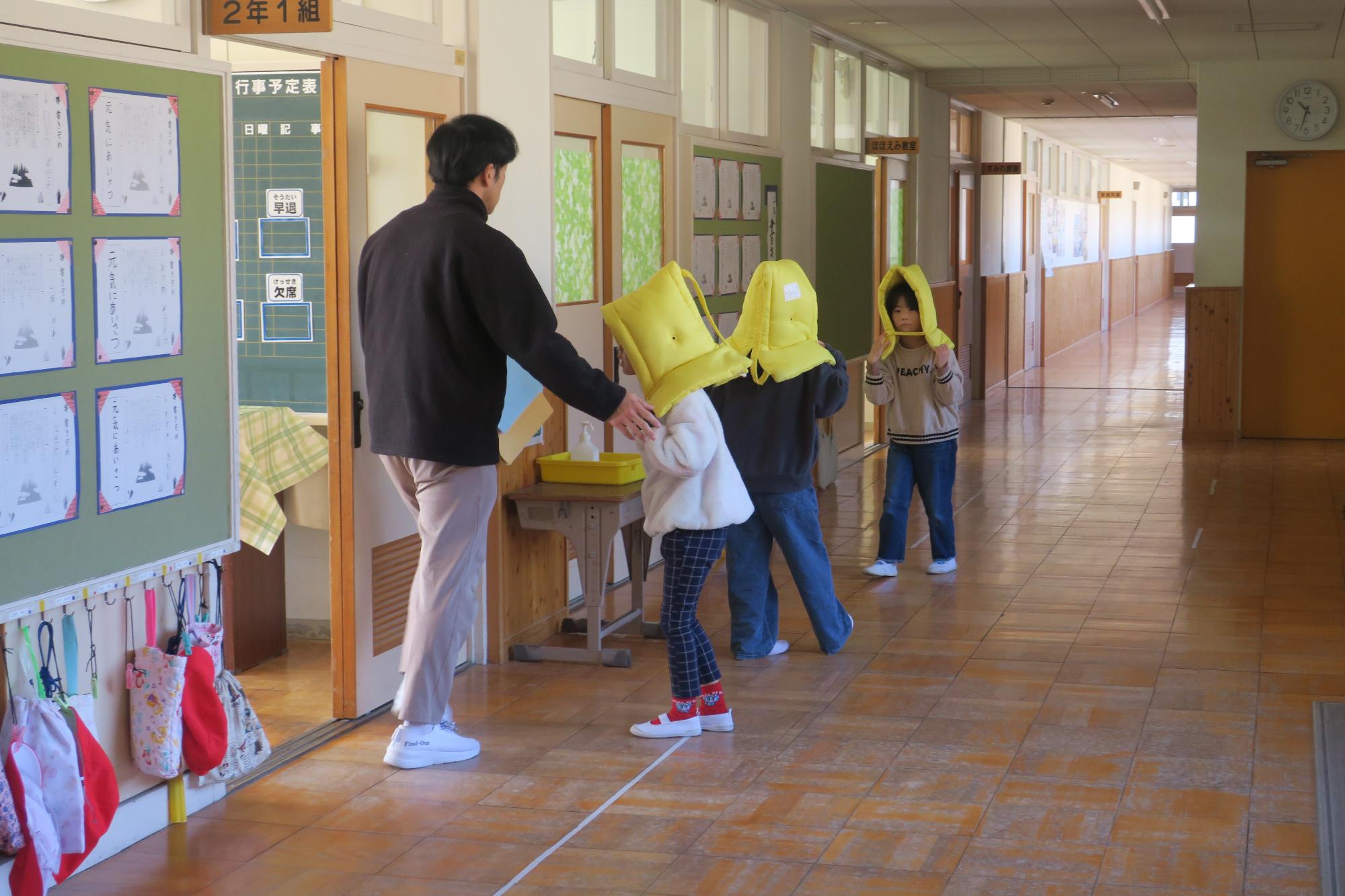 1月19日(月曜日)に、命を守る訓練を行いました。今回は、今日命を守る訓練をやることは子供たちに知らせてあるけれど、何時にどんな設定で行うのかはシークレットでした。20分休みに入って5分たったとき、放送を合図に訓練が始まりました。トイレに入っていた子、教室にいた子、遊びに行く途中の廊下にいた子・・・たまたま一人でいる時に訓練が始まった子もいました。しかし、とりあえず頭を守って体を伏せたり近くの机にもぐったりして、これまでの訓練を活かして対応していました。そして、教室にいた子たちは防災頭巾をかぶり、近くにいる子と一緒に外に避難しました。これまでの訓練では、実際の災害の場では先生たちが近くにいられない場合もあるので、第一避難場所では子供たちも自分たちのクラスの仲間が全員そろっているのかどうか確認する練習をしています。