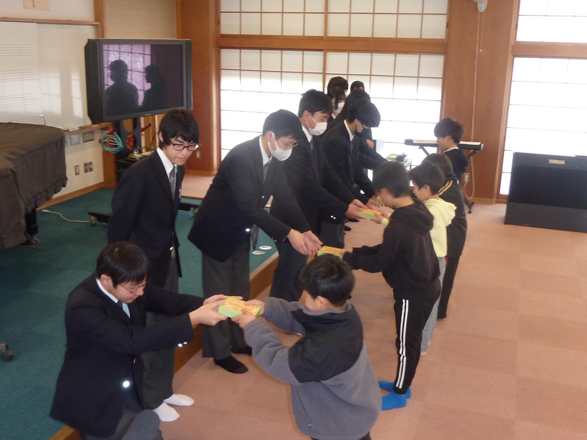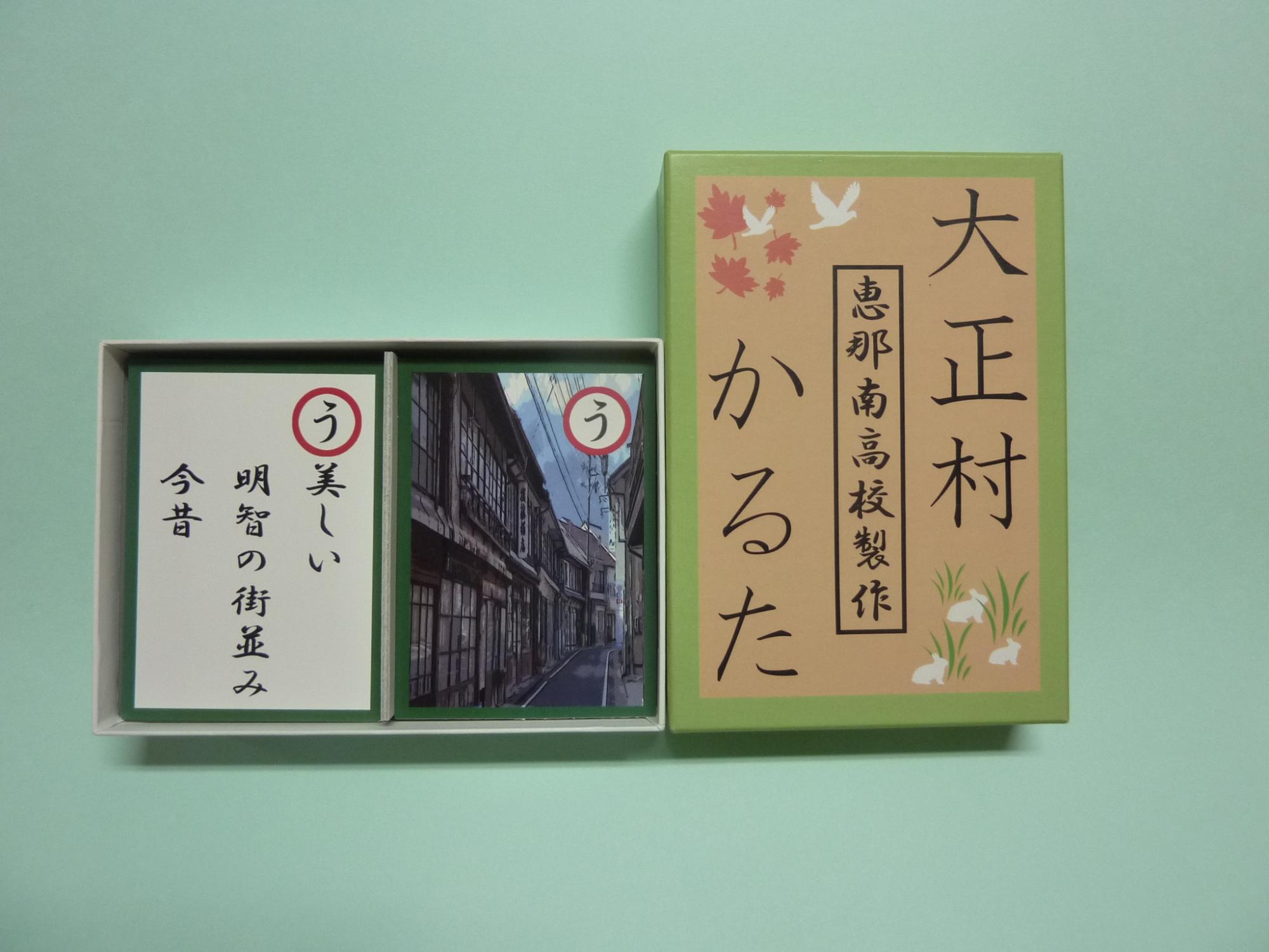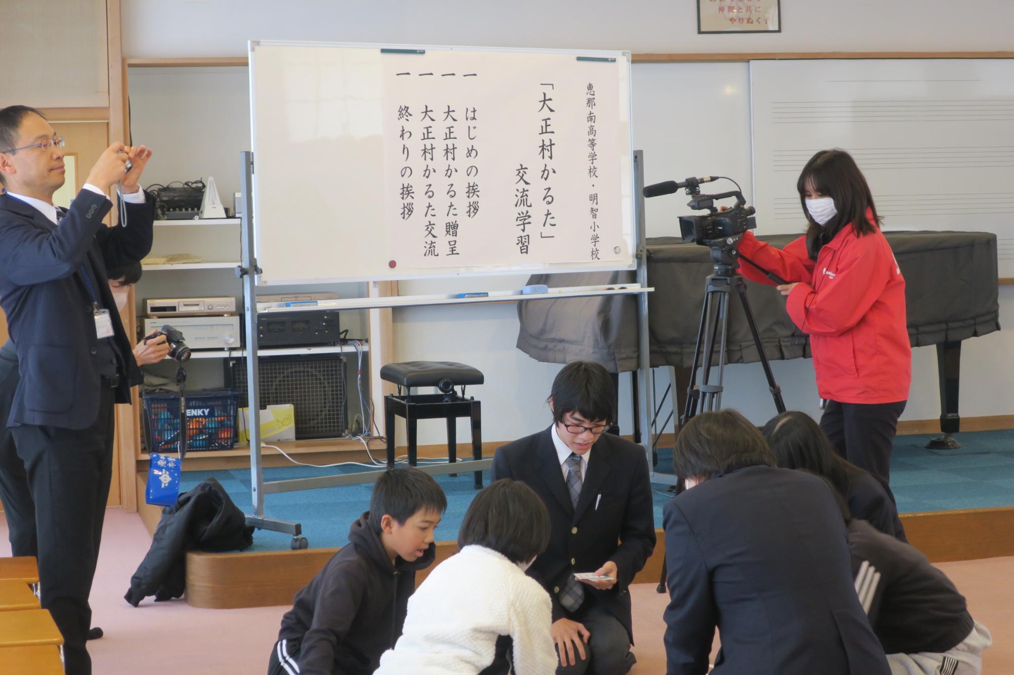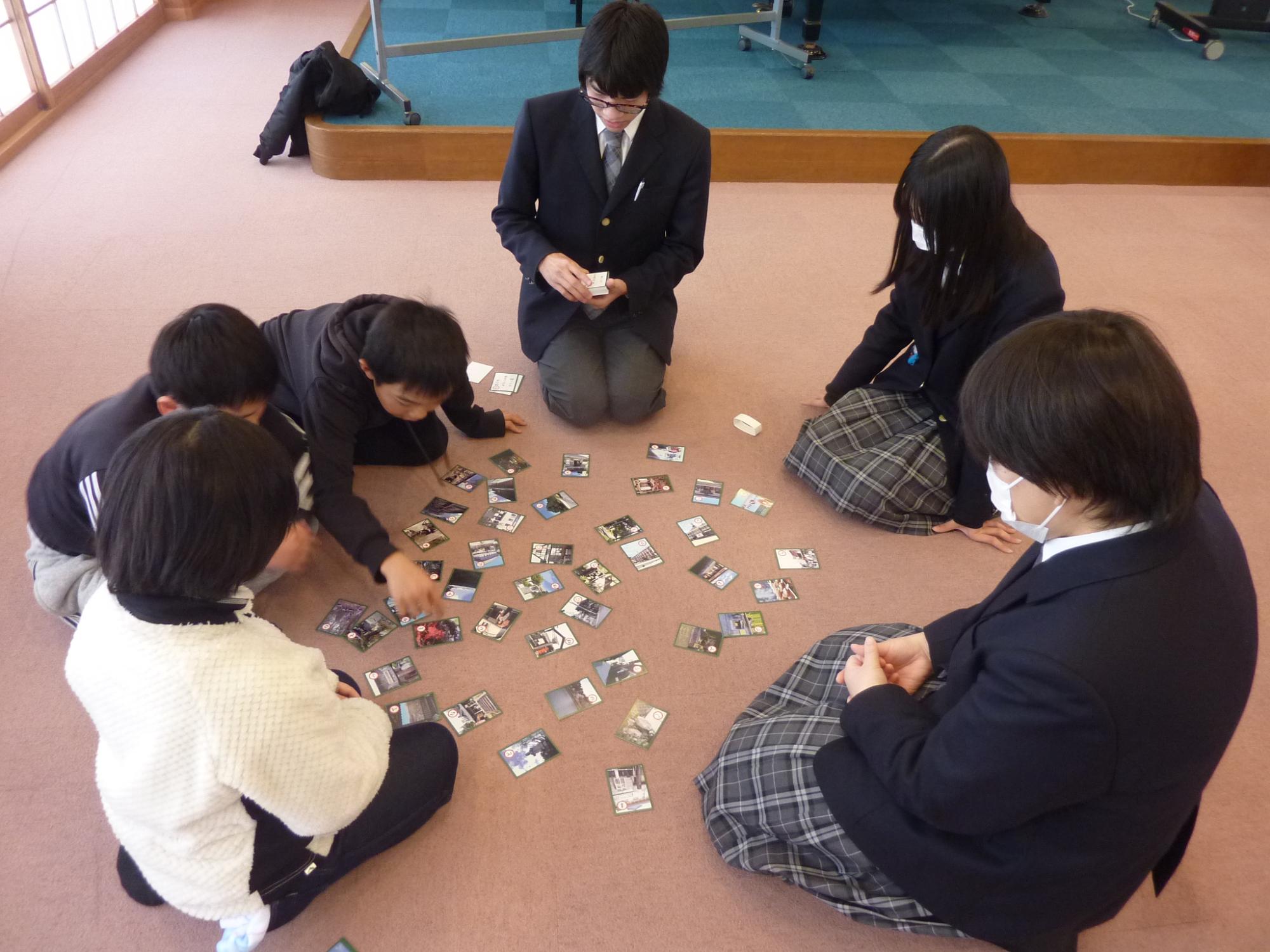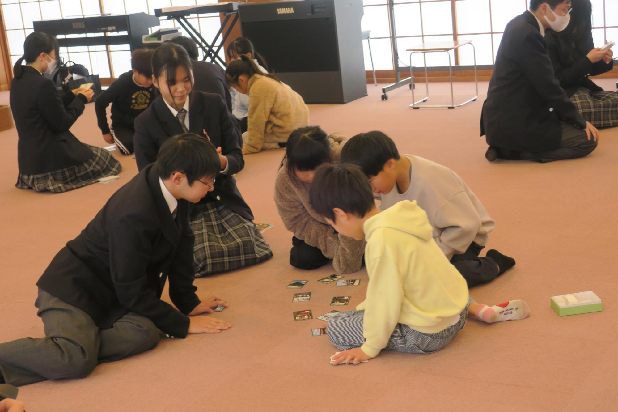 1月20日(火曜日)に3年生が、恵那南高等学校3年生の皆さんと交流しました。恵那南高の国語表現の授業を選択されている3年生の生徒さんが作られた「大正村かるた」5セットをプレゼントしてくださり、5つのグループに分かれて実際に高校生の皆さんが読み手となって対戦をしました。明智町の地域のことや歴史のことなどについて学習を始めている明智小の3年生、絵を見ながら、「はーい!」と元気よくかるたを取っていました。