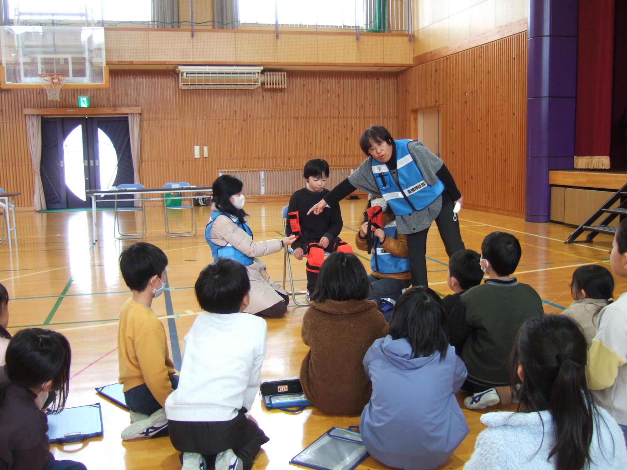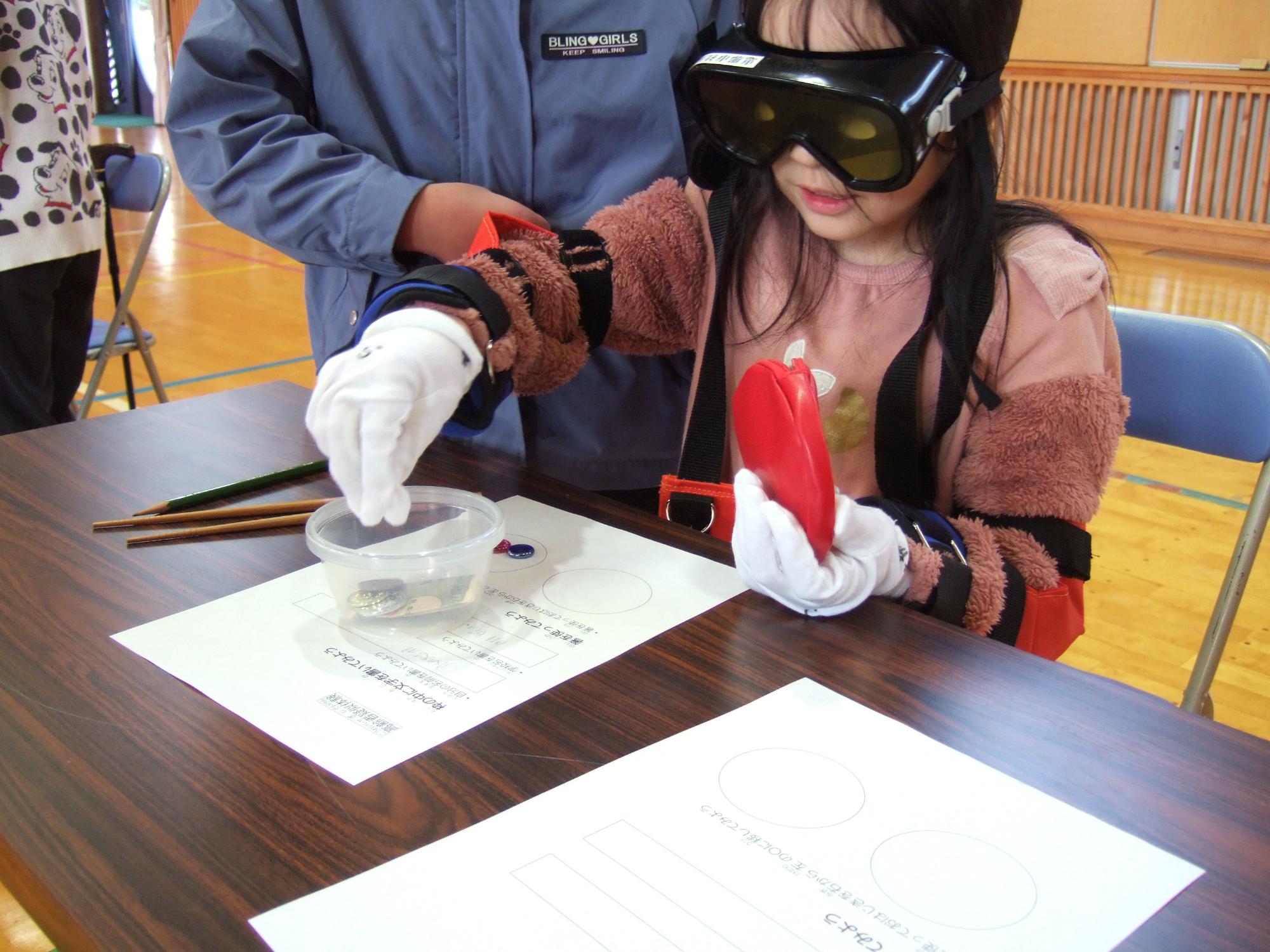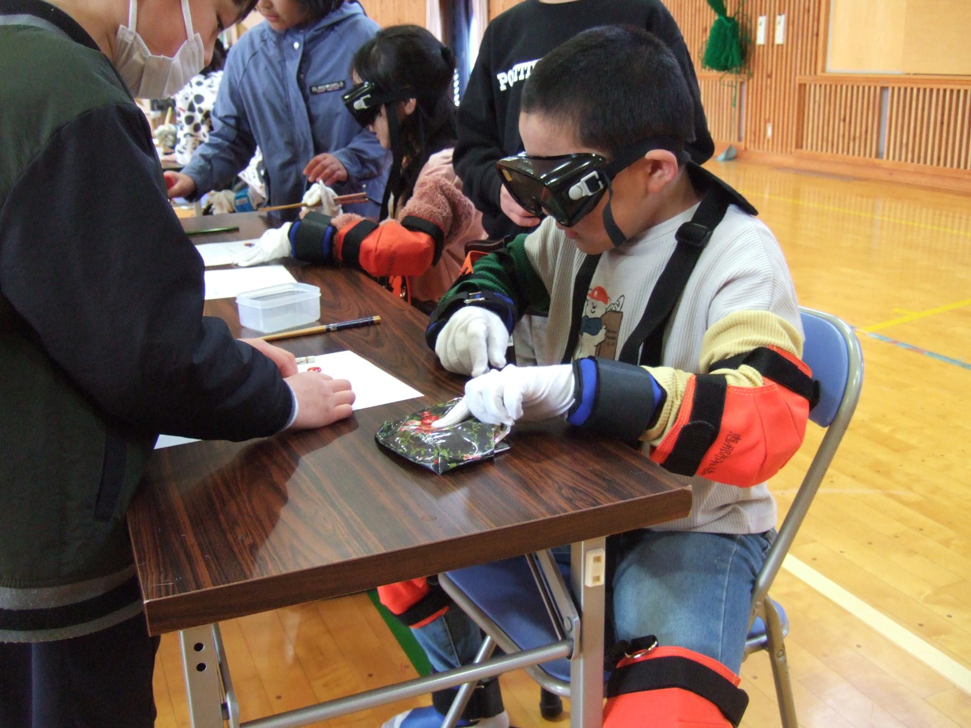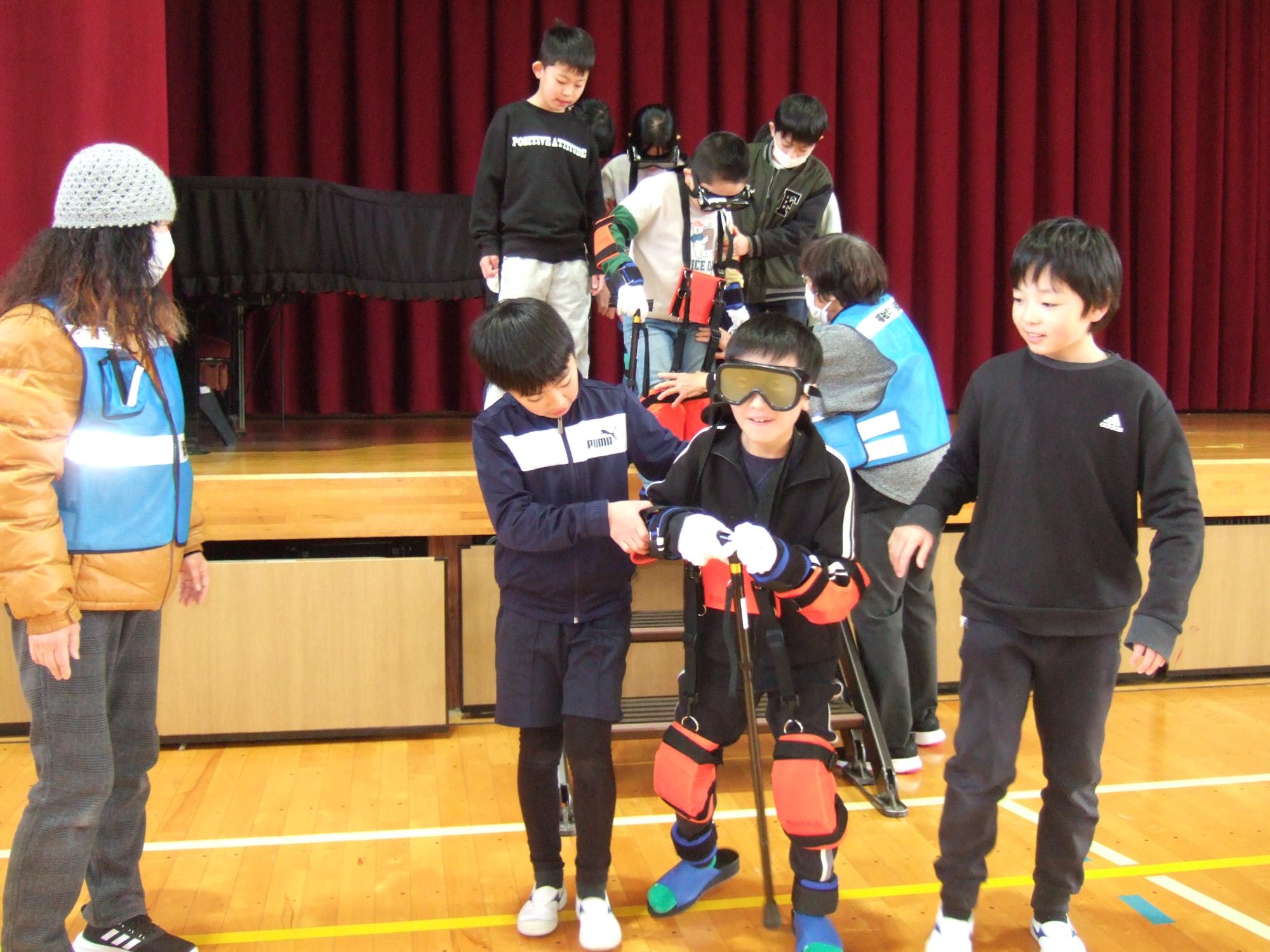 1月27日(火曜日)に4年生が見出しの学習を行いました。総合的な学習の時間の福祉に関わる学習の一環として、社会福祉協議会の方にご協力をいただき、説明を聞いた後、実際に体験しました。高齢になってくると体の使い方はどんな様子なのかと、体におもりと視野が狭くなるゴーグルをつけて実際に階段を上ったり下りたりする体験を行いました。また、目の見え方も手の使い方も変化することを知るために、視野が狭くなるゴーグルをつけ、手袋をしてお金をつまんでみたり文字を書いてみたりしました。また、車いすを押すときの体験だけでなく、乗っている人が怖くないようにするためにはどんな声掛けが必要かも学習しました。これらの学習がすぐに役立つかは分かりません。しかし、やってみたからこそ分かる感覚があります。まずは身近な人の役に立てるといいなと思いました。