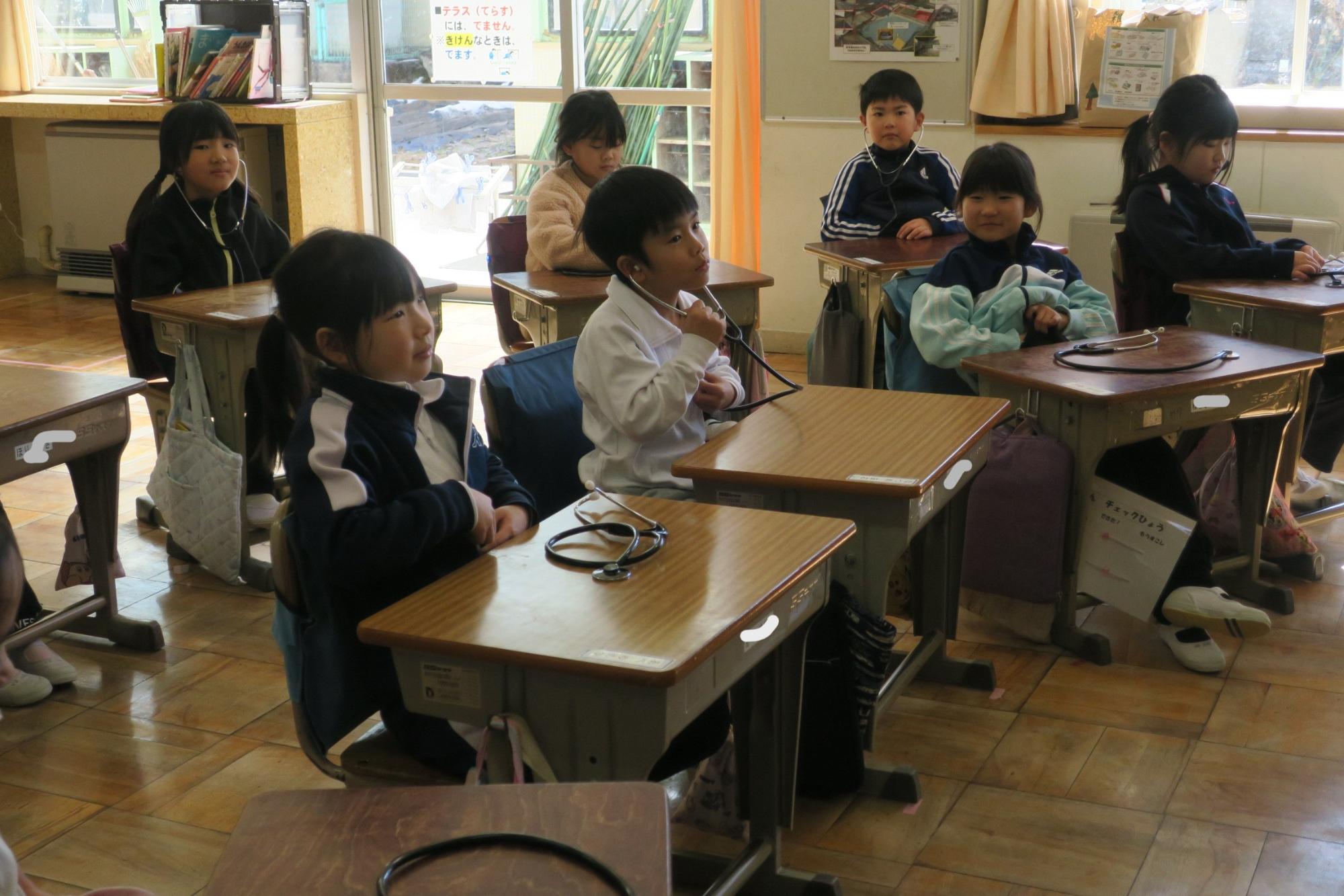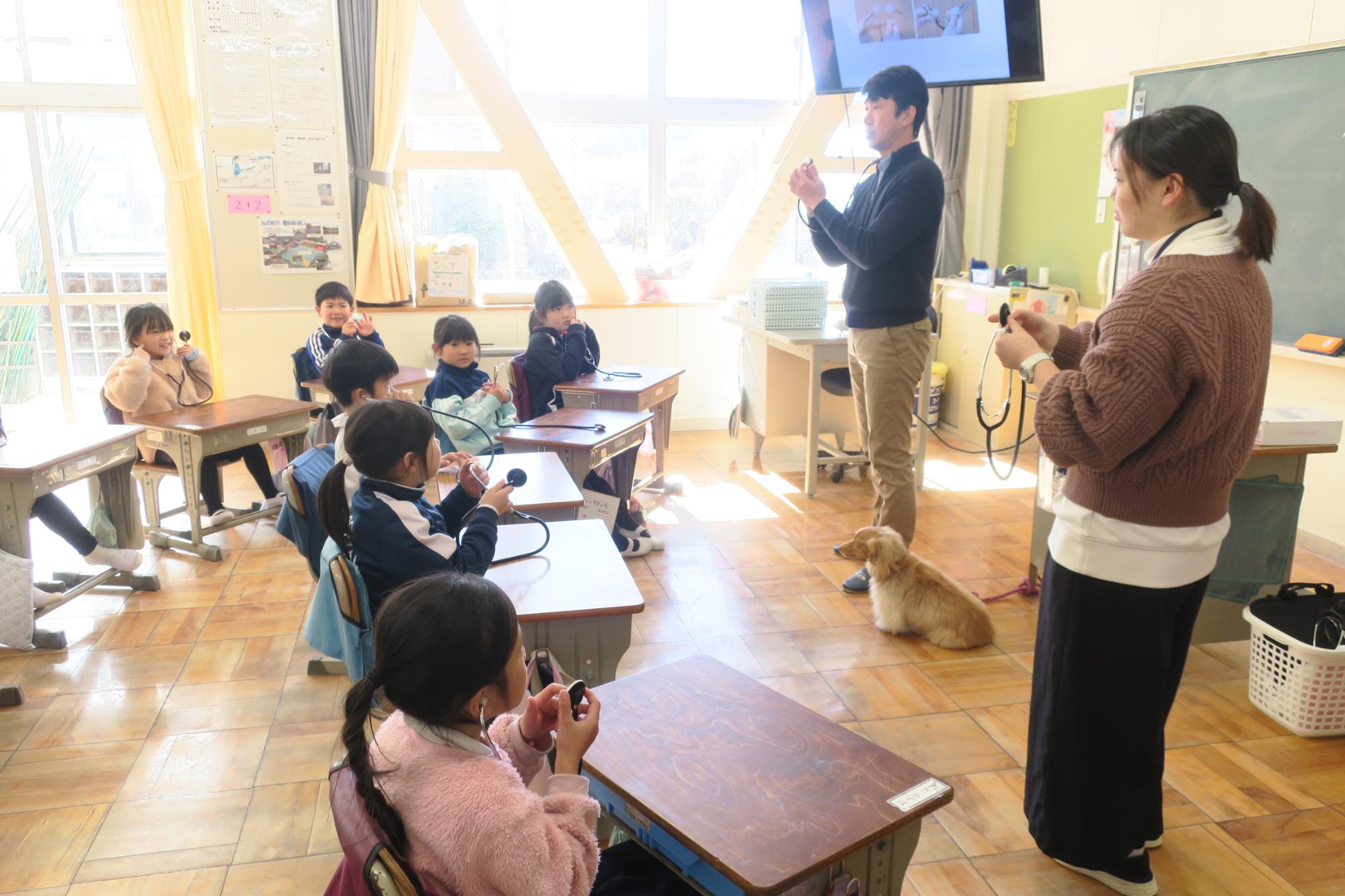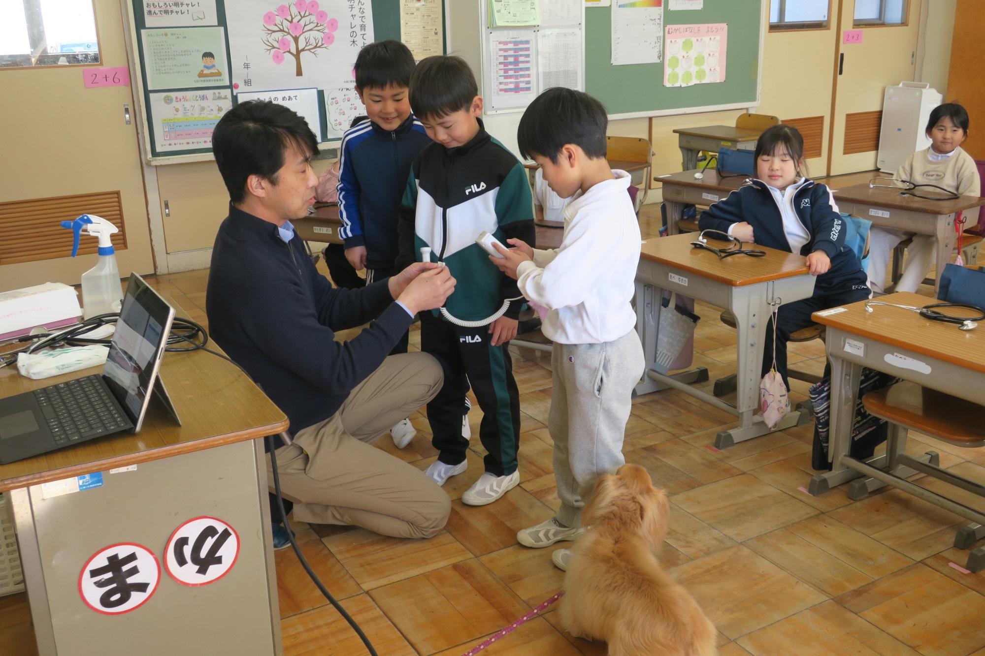2月3日(火曜日)に動物愛護センターから、かわいい保護犬の『ぐう』と指導員の方がお越しくださり、「命はみんな大事だよ」「心臓はこんなふうに動いているよ」という学習をしました。動物愛護センターは県内には一つしかありません。年間に何匹ぐらい犬や猫を保護するか、また、そのうち何匹ぐらいあたらいい飼い主がきまるかなどのお話を聞き、実際に聴診器を一人に一つずつお借りして、自分の心臓の音を聞いてみたり代表の子が『ぐう』の心臓の音を聞いたりしました。みんな同じように心臓が動いていて触ると温かく、大事な命です。そんなことを『ぐう』の様子を見ながら印象深く学習しました。