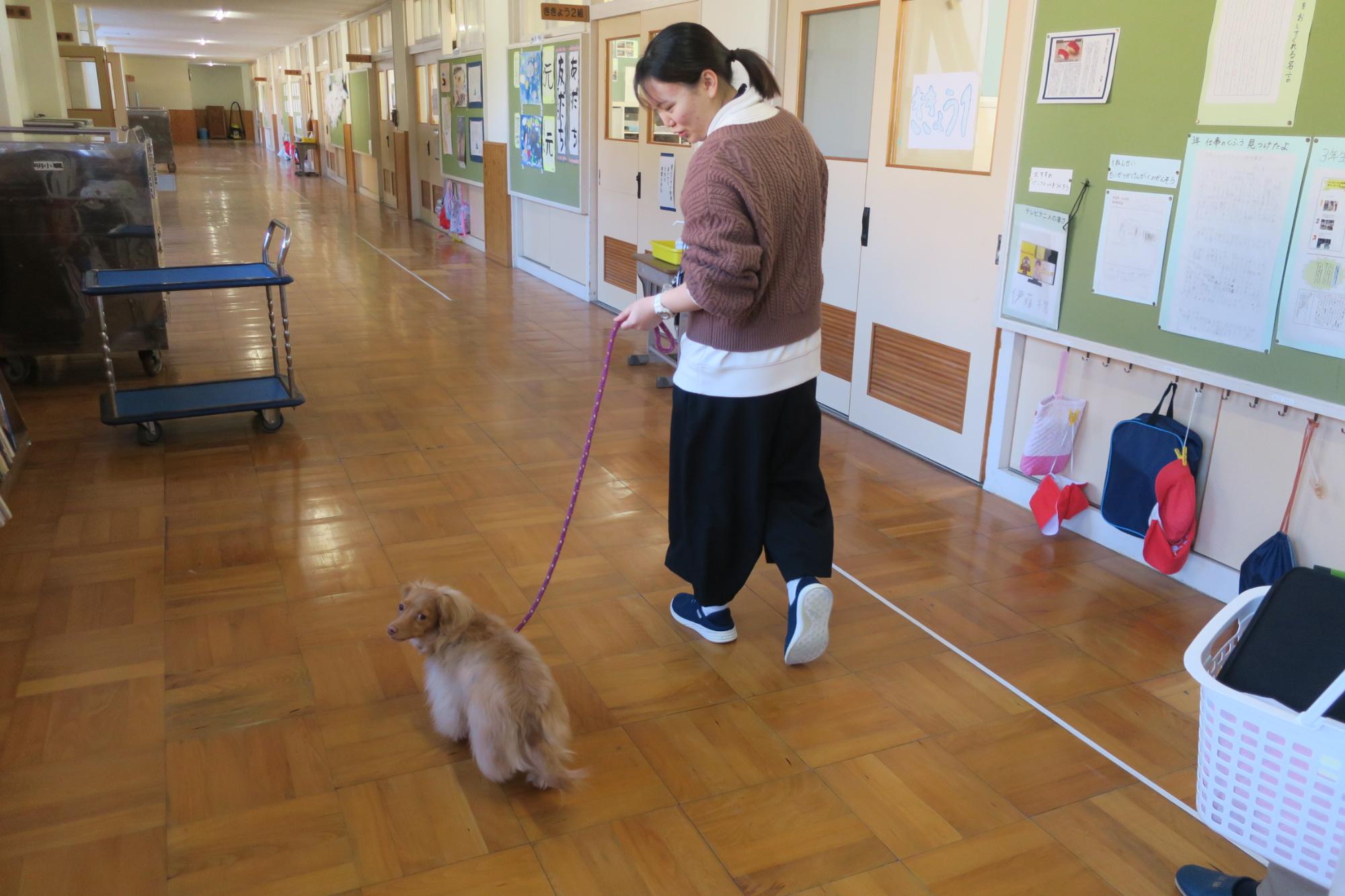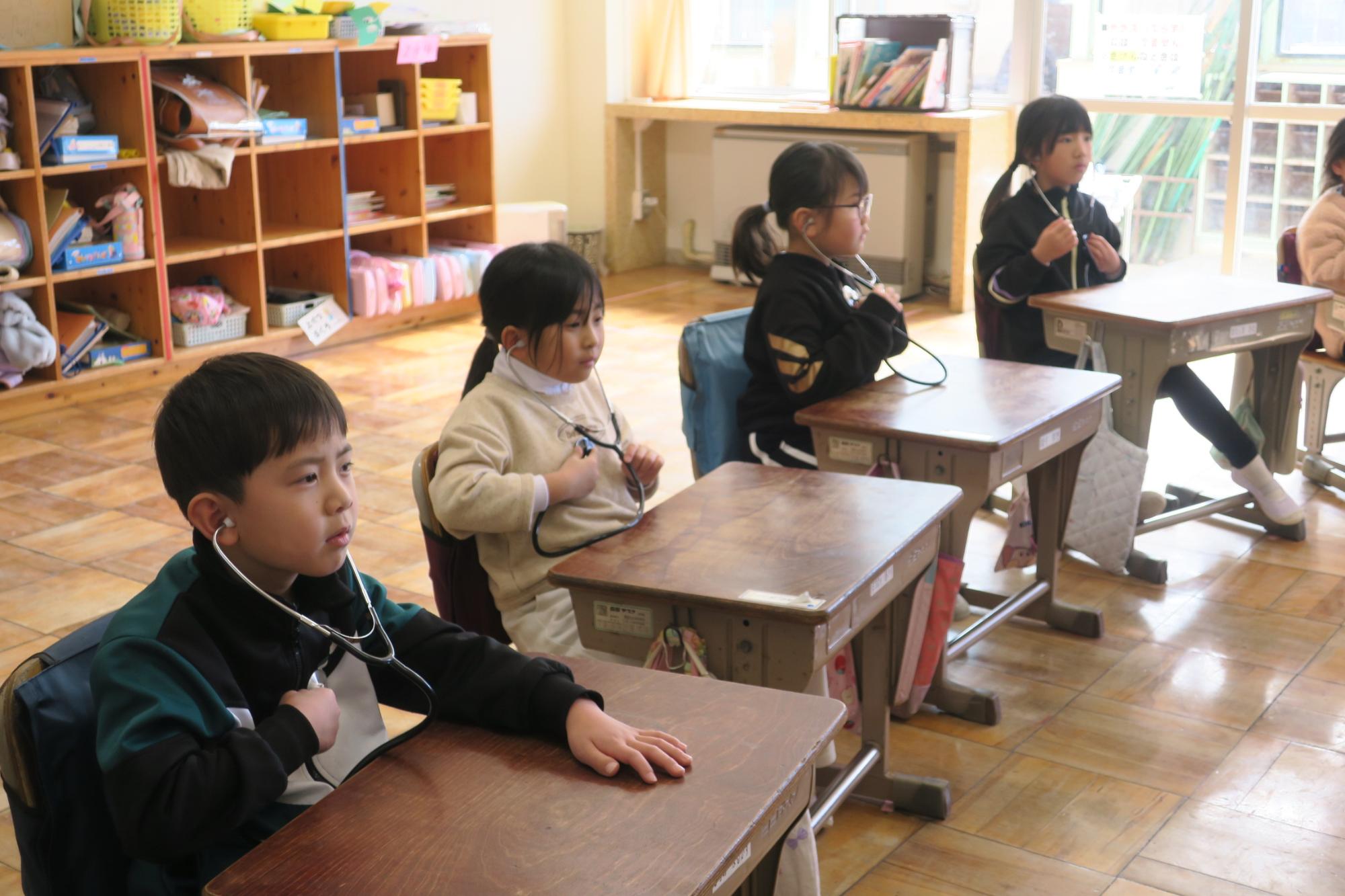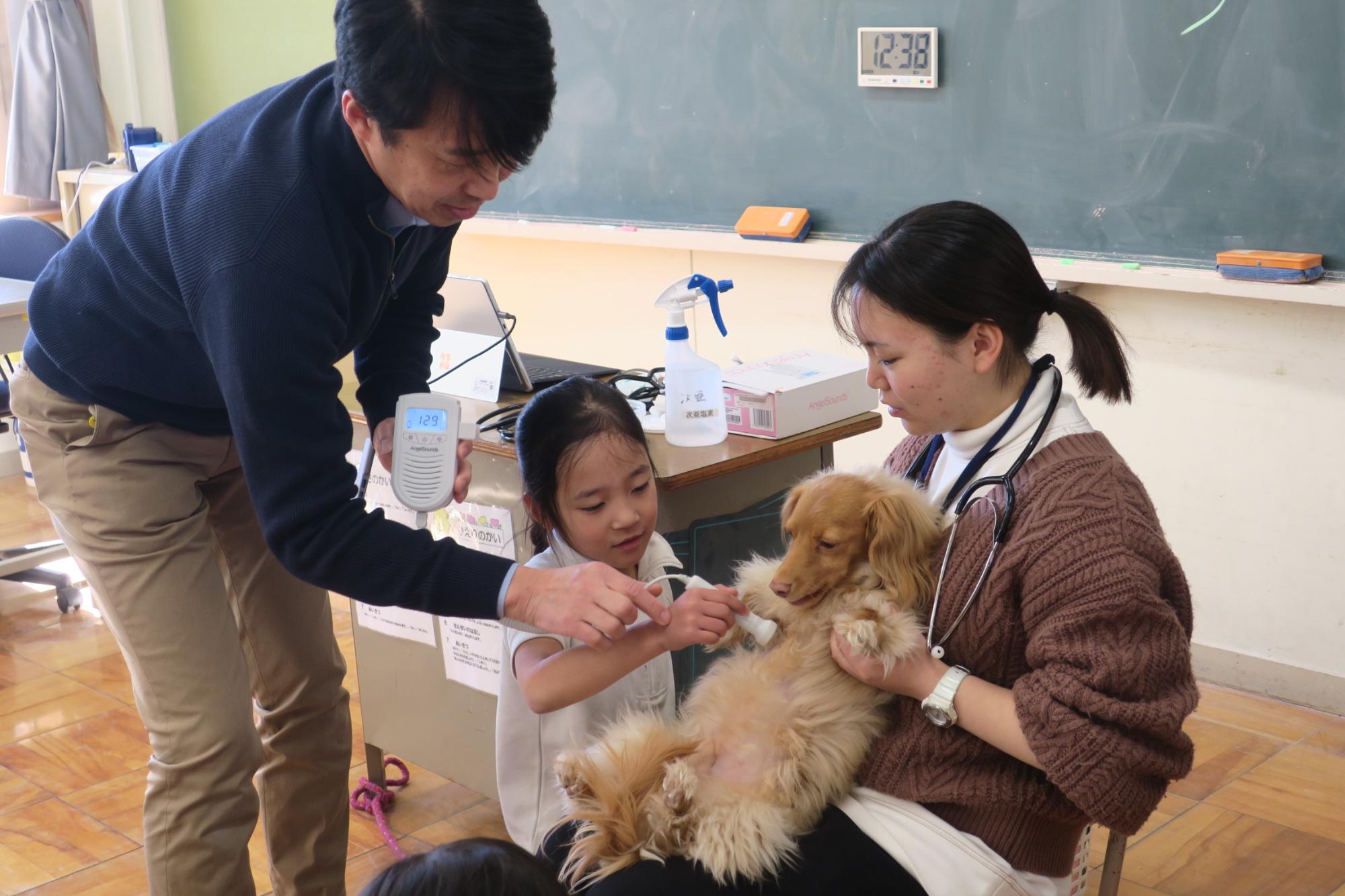 2月3日(火曜日)に動物愛護センターから、かわいい保護犬の『ぐう』と指導員の方がお越しくださり、「命はみんな大事だよ」「心臓はこんなふうに動いているよ」という学習をしました。動物愛護センターは県内には一つしかありません。年間に何匹ぐらい犬や猫を保護するか、また、そのうち何匹ぐらいあたらいい飼い主がきまるかなどのお話を聞き、実際に聴診器を一人に一つずつお借りして、自分の心臓の音を聞いてみたり代表の子が『ぐう』の心臓の音を聞いたりしました。みんな同じように心臓が動いていて触ると温かく、大事な命です。そんなことを『ぐう』の様子を見ながら印象深く学習しました。