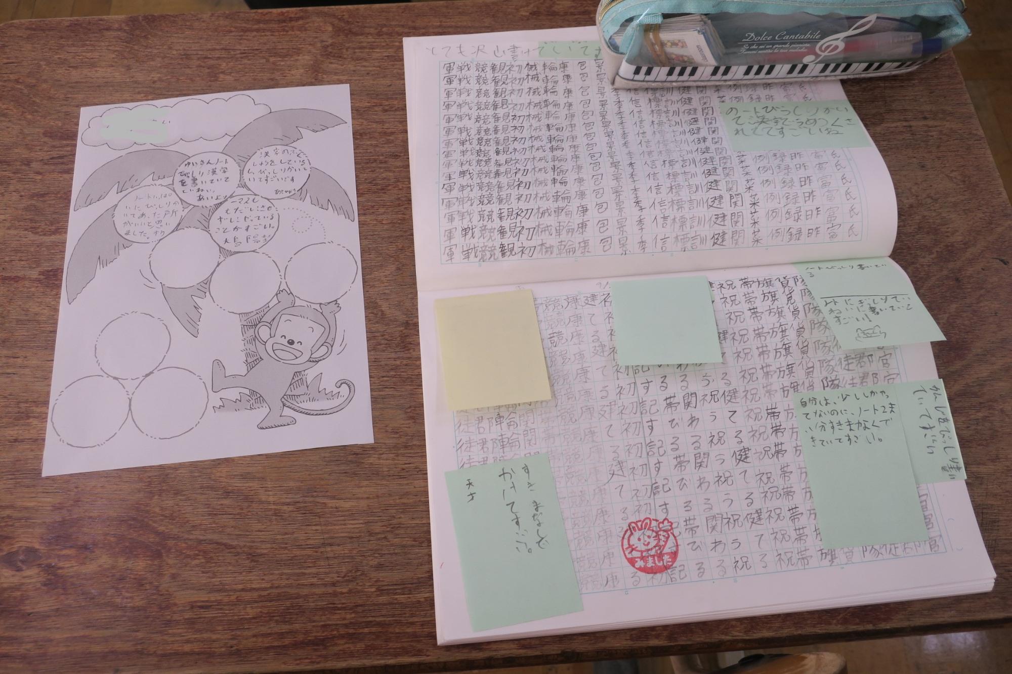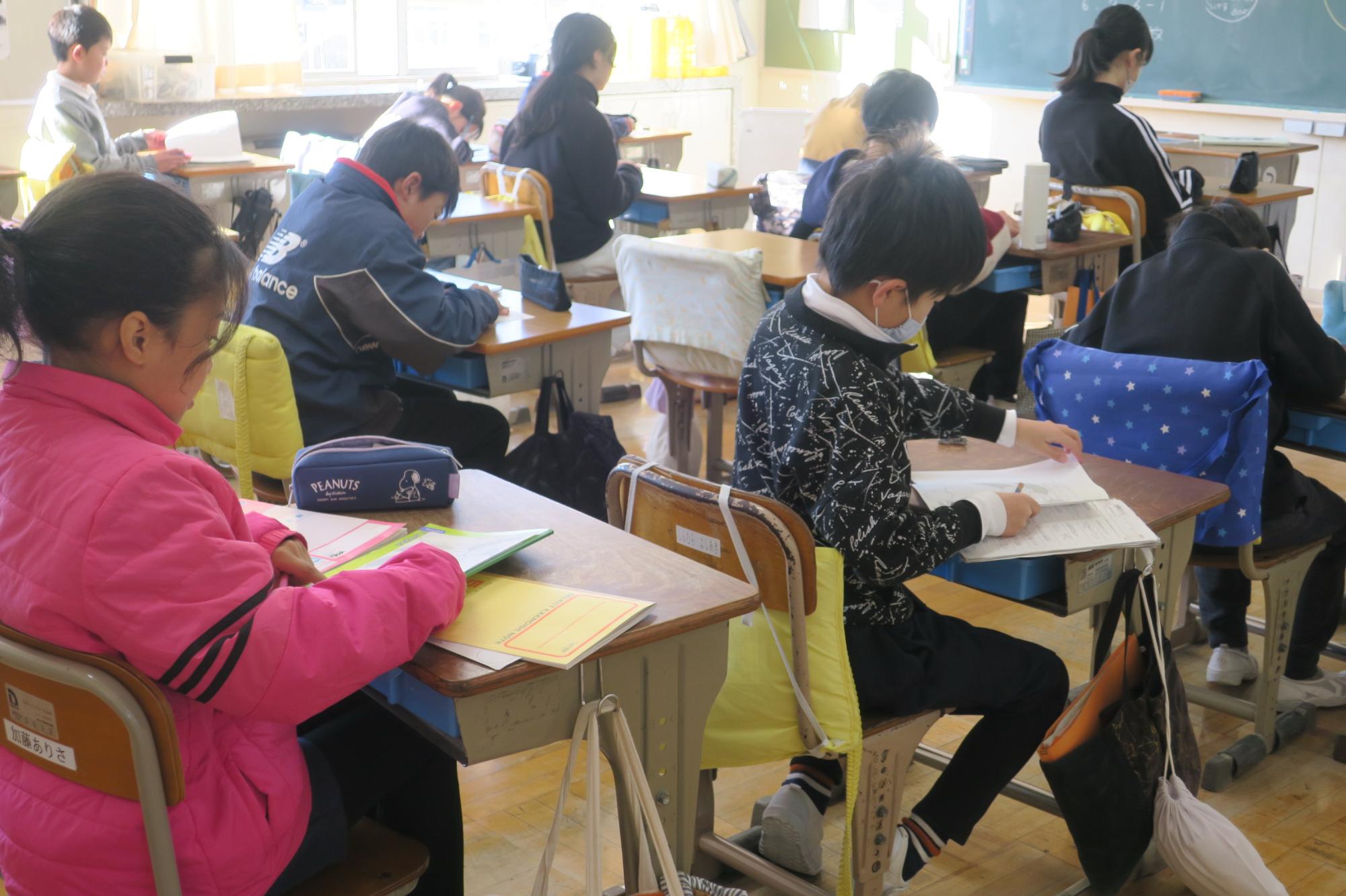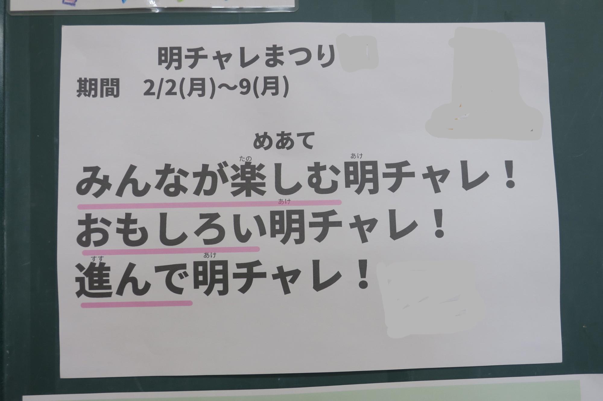 『明チャレ』とは「明智小学校チャレンジ」の略称で、自主学習のことです。担任や教科担任が授業に関連して毎日出す家庭学習とは違って、今の自分はどんな予習や復習などをやるとよいのかを考えたり、興味があることを楽しみながら主体的にやったりできるとよいと子供たちにすすめているものが『明チャレ』です。これらは片方だけでは十分ではなく、セットにしてやり切ると学力向上に効果的だと考えています。2月2日から、学習委員会を中心として「みんなが楽しむ明チャレ!面白い明チャレ!進んで明チャレ!」を目当てに明チャレまつりを行っていましたので、この期間が終わった10日に、全校でおすすめのページを見てお互いに学び合う交流会を行いました。3年生以下は担任と一緒に机上のおすすめのページを見て回り、4年生以上はコメントを書いていました。