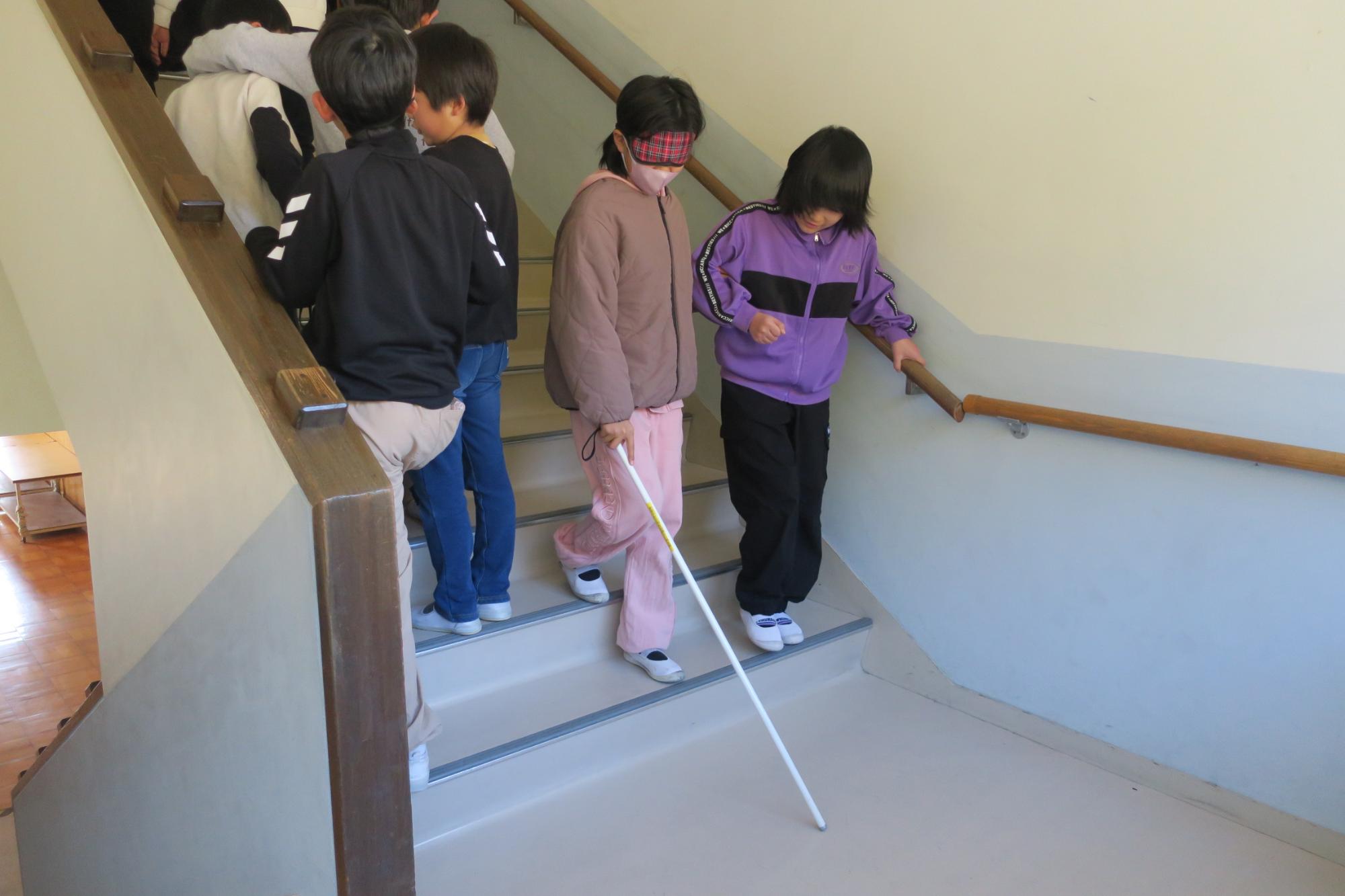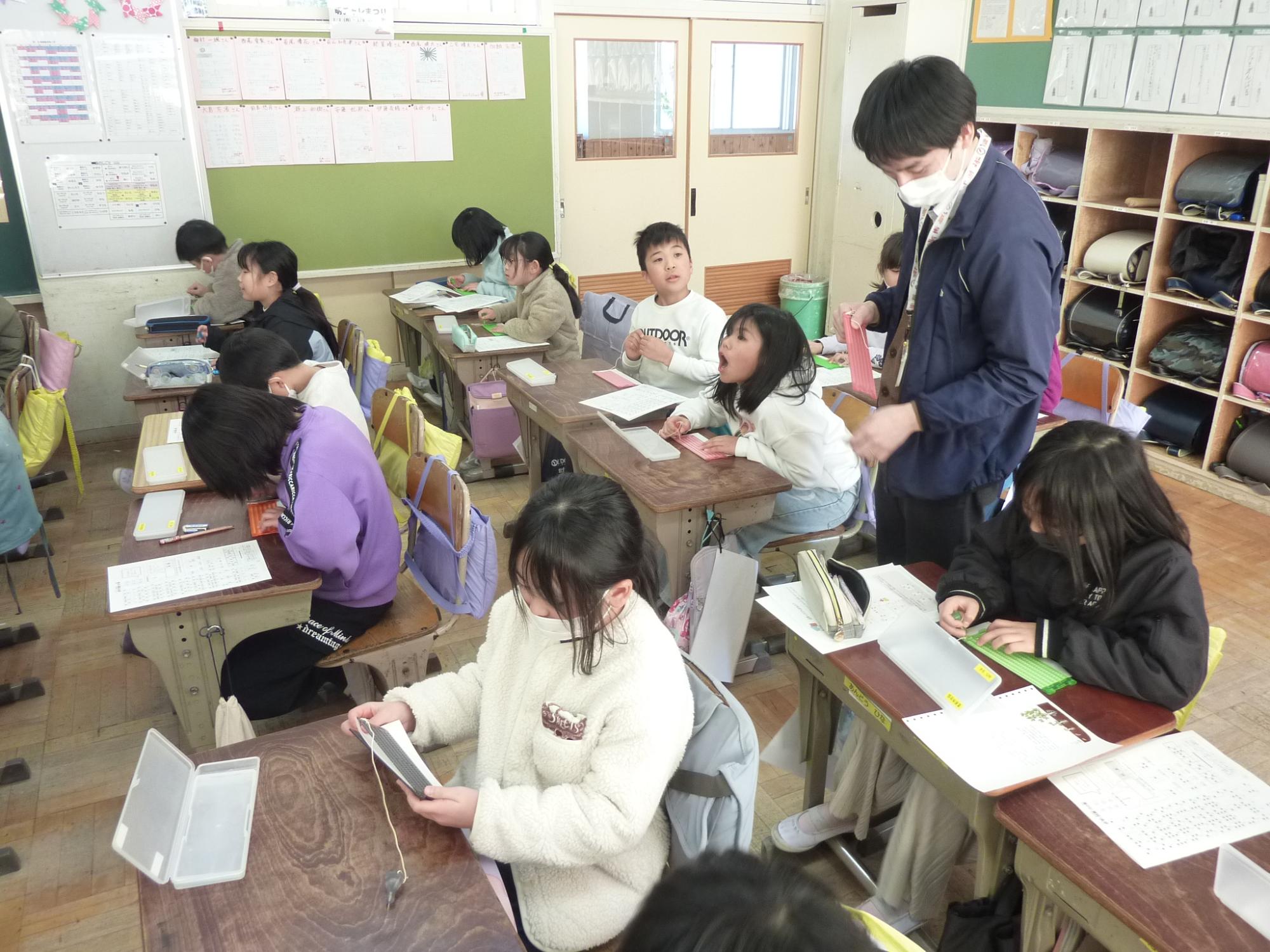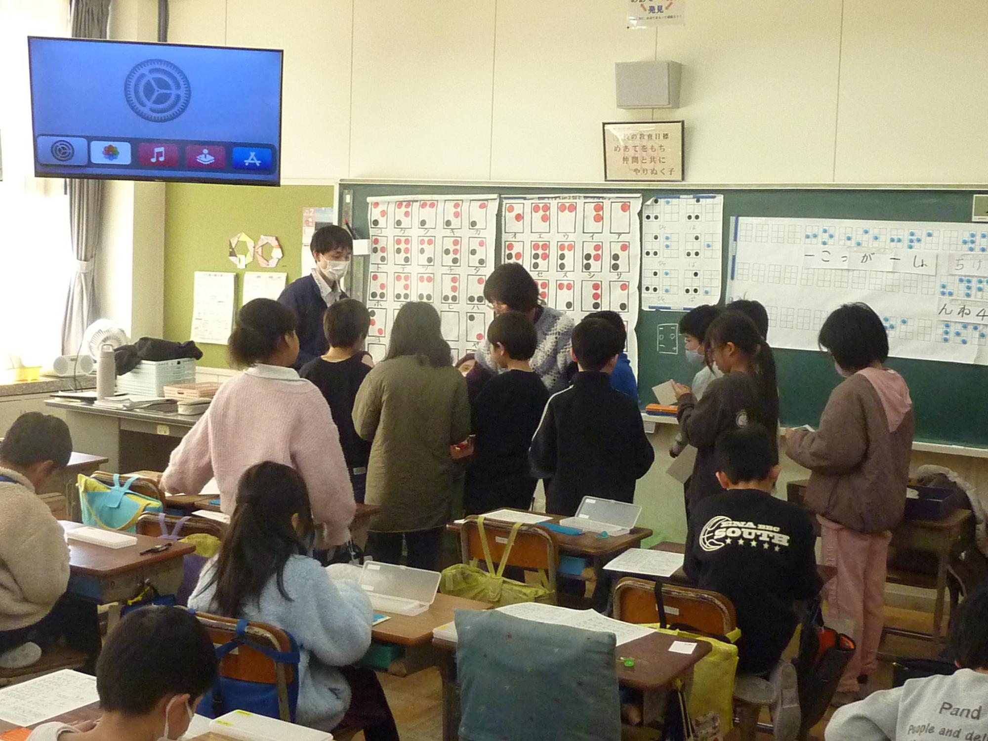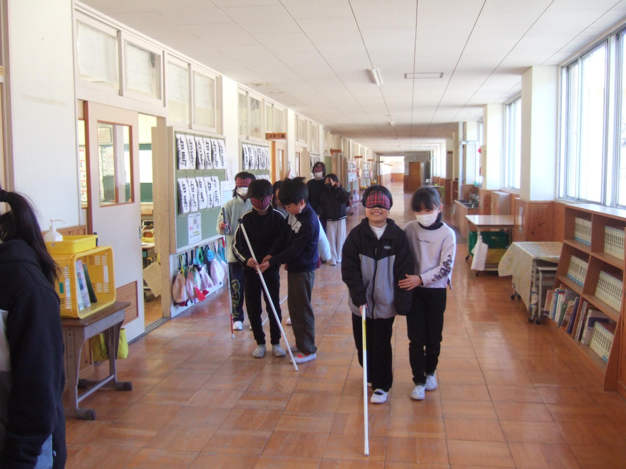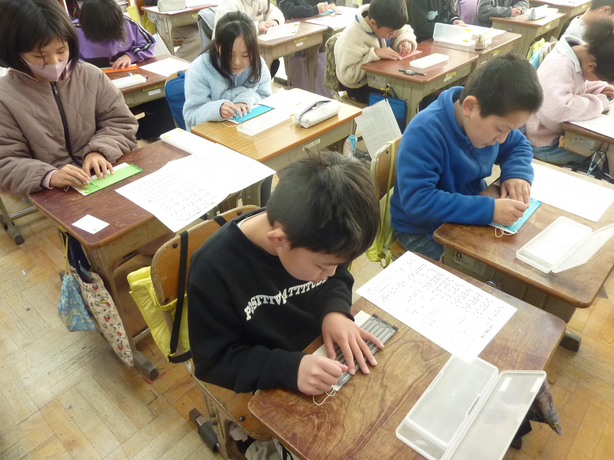 2月13日(金曜日)に4年生が見出しの学習を行いました。車椅子・高齢者体験に引き続き、福祉の学習の一環として実施しました。白杖体験では、上手な杖の使い方や補助の仕方を習ってから廊下や階段を歩いてみましたが、アイマスクをすると慣れた場所でも勝手が違うようで、こわごわ少しずつ進んでいました。また、点字の説明では、言葉と言葉の切れ目が分かるようにスペースをつくること、「昨日は」と打ちたいときは「きのうわ」にしないといけないことなどを習って、実際に点字を打ってみました。打ってみて指先で自分で触ってみたり、講師の先生に読めるか試していただいたりしました。