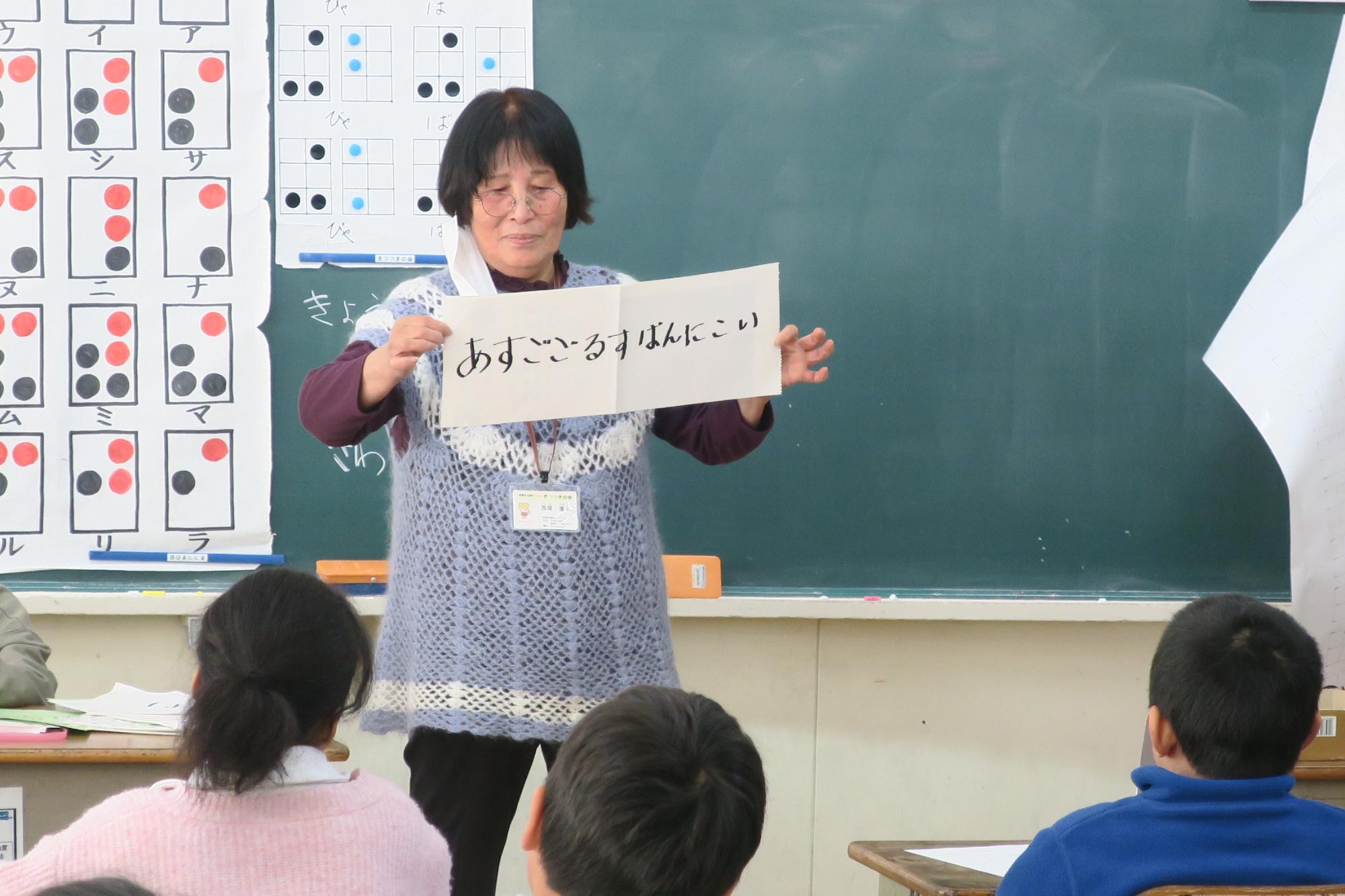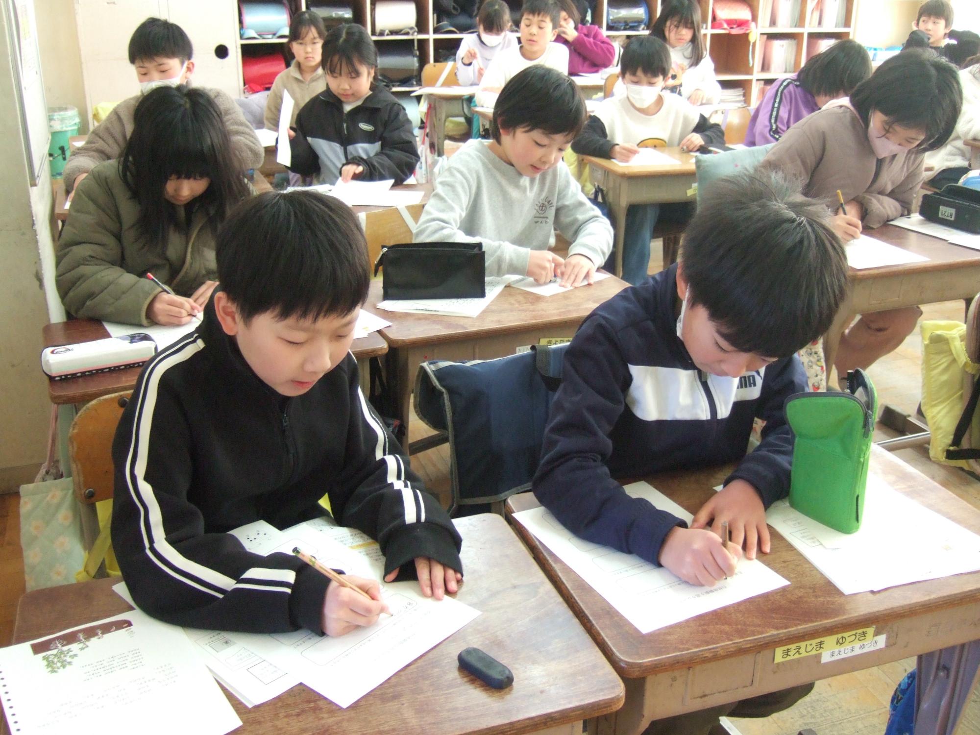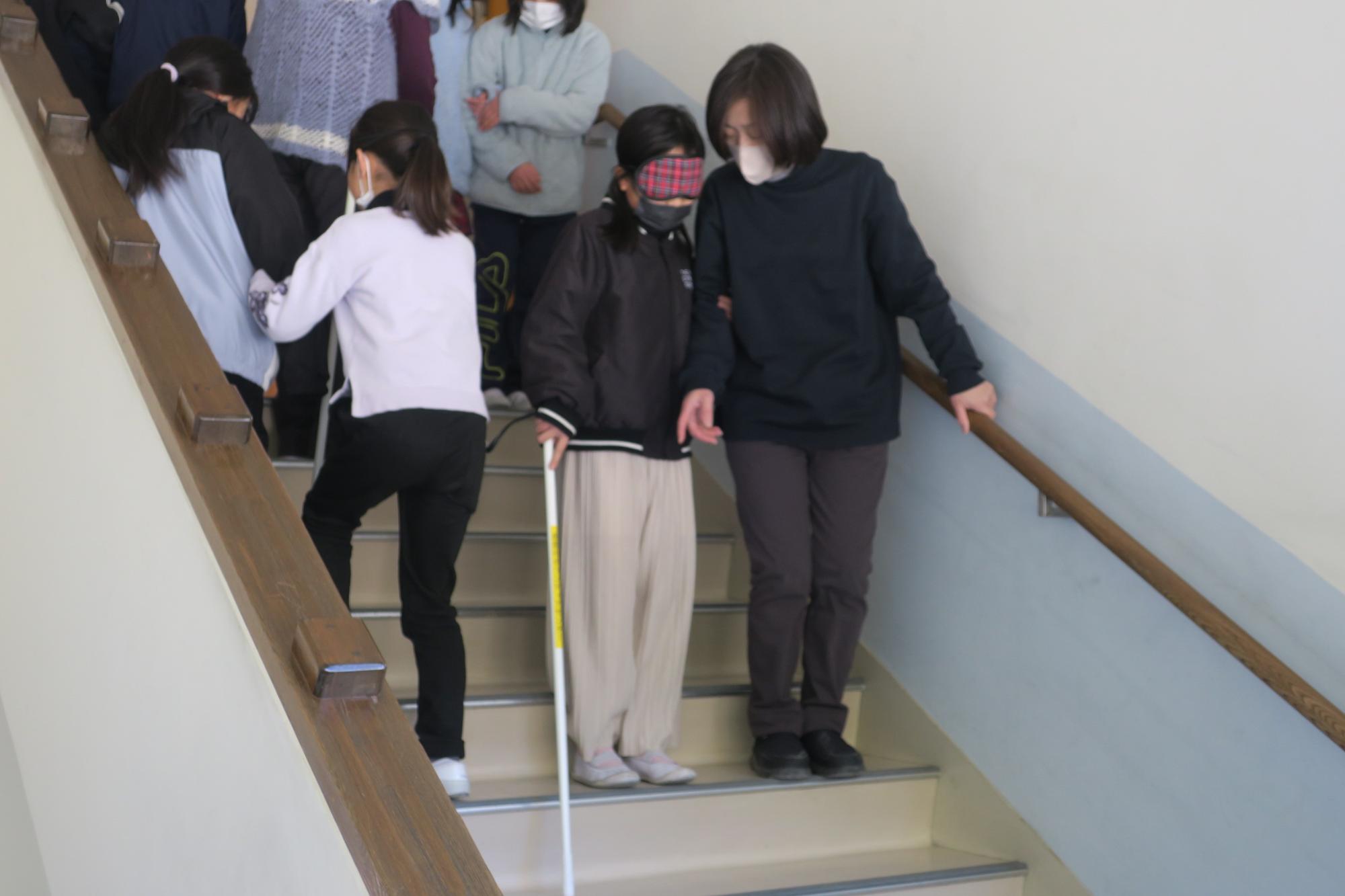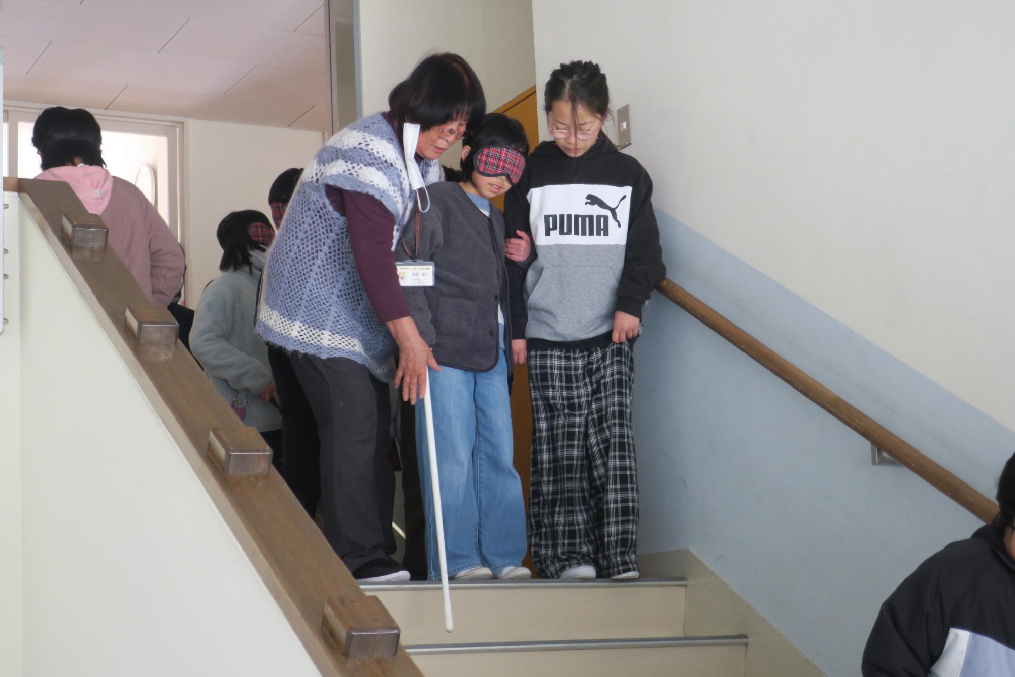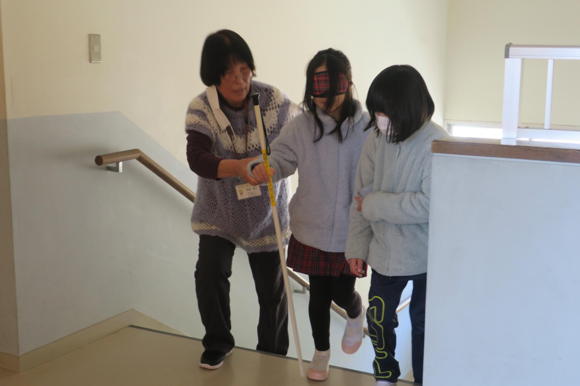 2月13日(金曜日)に4年生が見出しの学習を行いました。車椅子・高齢者体験に引き続き、福祉の学習の一環として実施しました。白杖体験では、上手な杖の使い方や補助の仕方を習ってから廊下や階段を歩いてみましたが、アイマスクをすると慣れた場所でも勝手が違うようで、こわごわ少しずつ進んでいました。また、点字の説明では、言葉と言葉の切れ目が分かるようにスペースをつくること、「昨日は」と打ちたいときは「きのうわ」にしないといけないことなどを習って、実際に点字を打ってみました。打ってみて指先で自分で触ってみたり、講師の先生に読めるか試していただいたりしました。