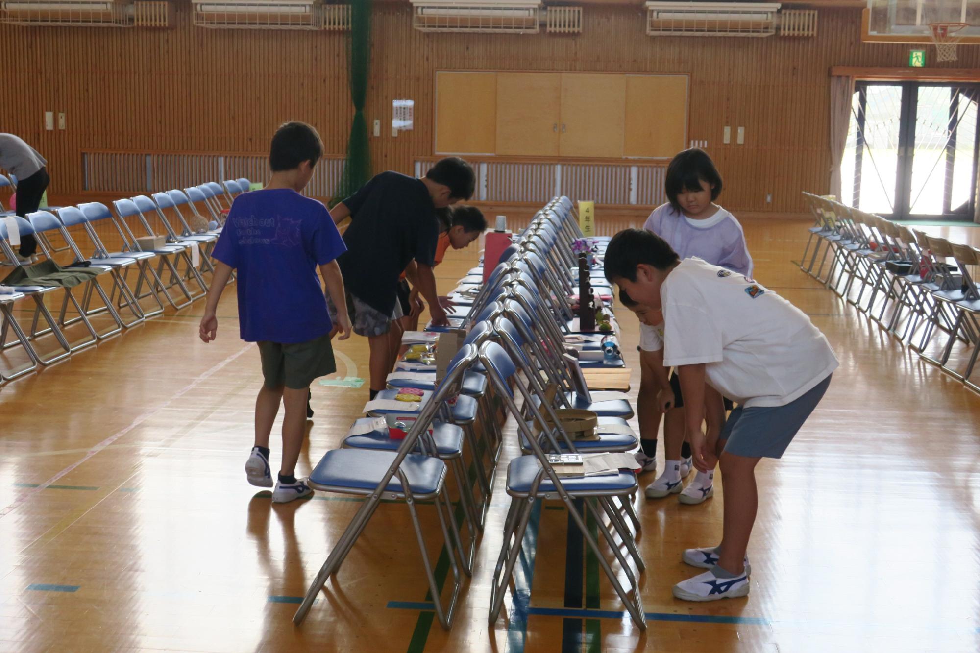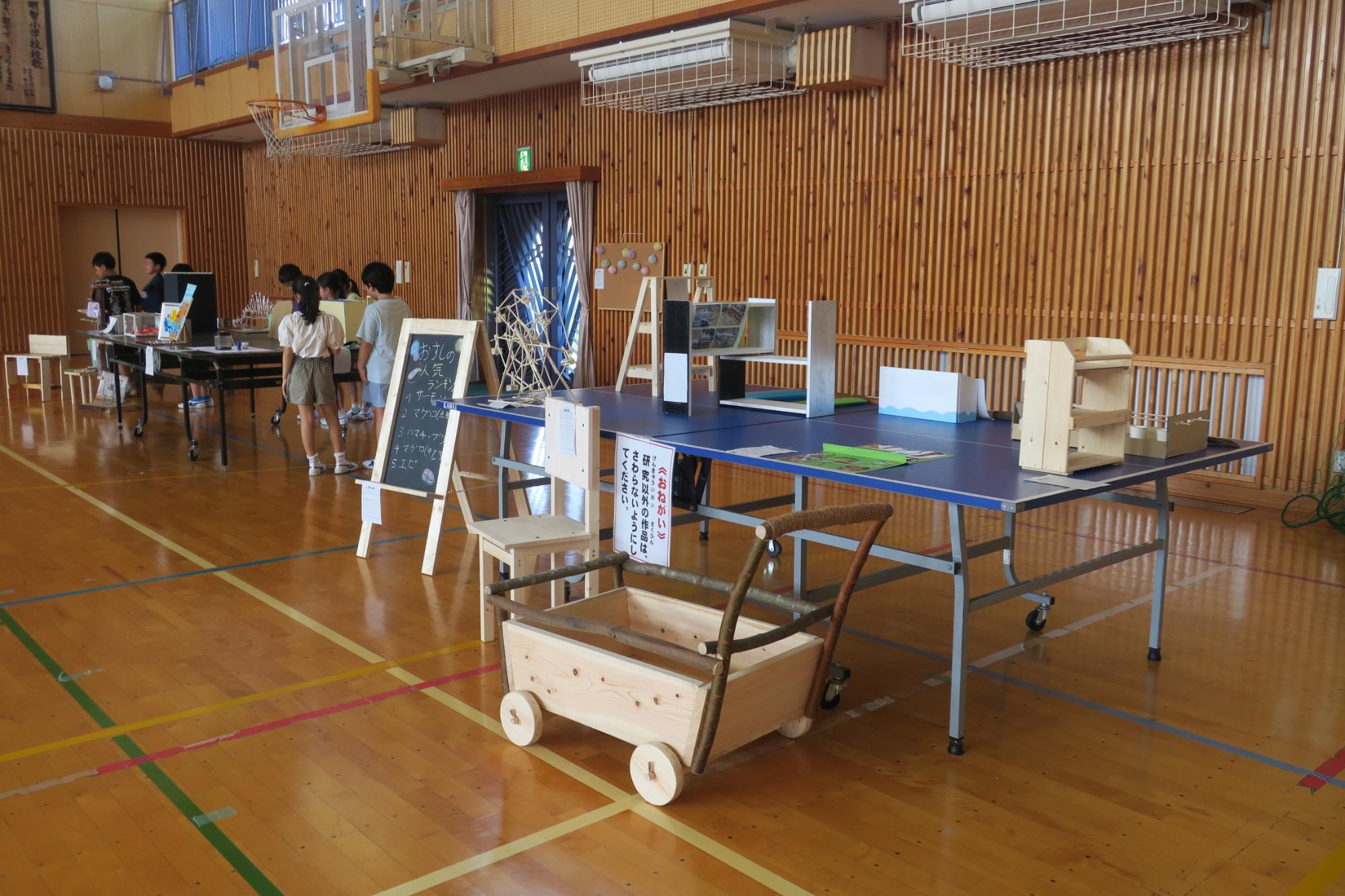 9月1日月曜日と2日火曜日は、夏休みの宝物展でした。全体的に木工作品や工作が多かったです。コンクールに応募することを意識して整えられたものもありました。「これ、ちょっと見て。」「これ、どうやって作ったのかな。」などと言いながら、学級ごとに作品を鑑賞していました。来年の参考にできるとよいです。見に来てくださった保護者の皆さん、地域の皆さん、ありがとうございました。