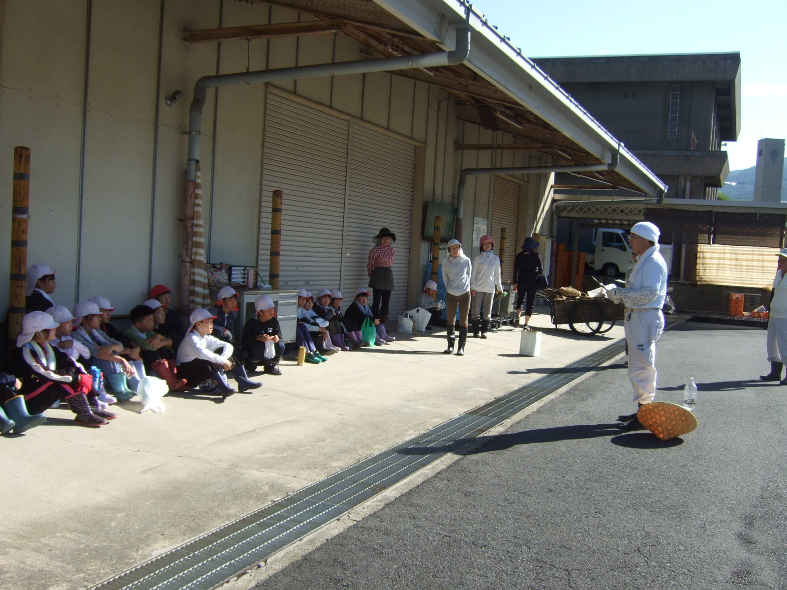 農協の前で、はじめの会です。5年生の司会で稲刈りの仕方を習いました。