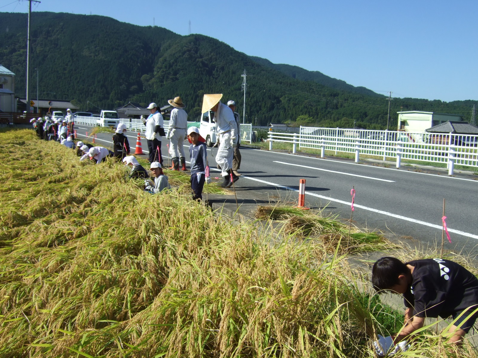 12日に予定されていた稲刈りでしたが、雨の関係で16日に行いました。早朝より、学校運営協議会の方々や農協の方々などが指導に来てくださって、学校田の稲刈りです。その様子を写真で紹介します。