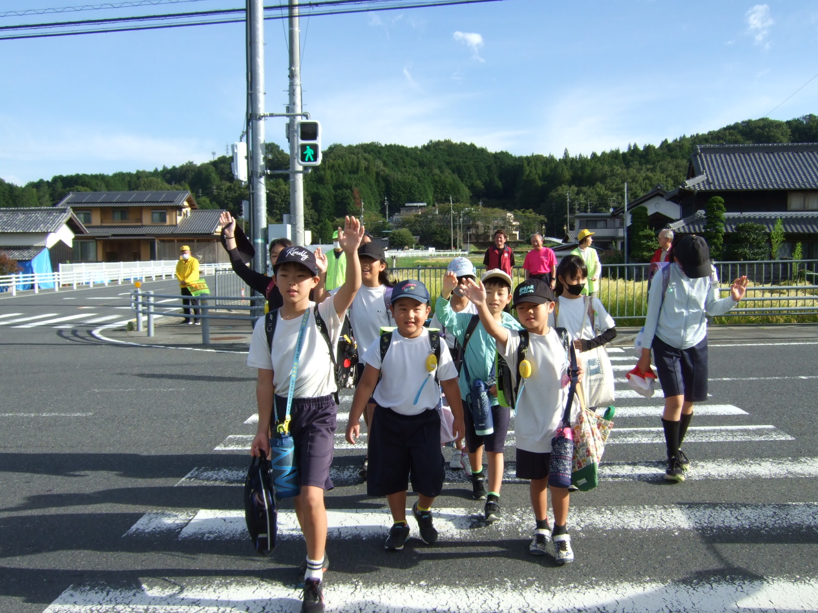 9月21日から秋の交通安全週間が始まりました。秋分の日を過ぎた頃から、秋の日はつるべ落としと言われるように、急に夕方暗くなるのが早くなります。そして、夕方も含めた交通事故が多くなる時期となります。今日は、東野のたくさんの人が交通当番で交差点に立ち、子供たちの通学を見守るとともに、通行する車へ交通安全を啓発してくださいました。