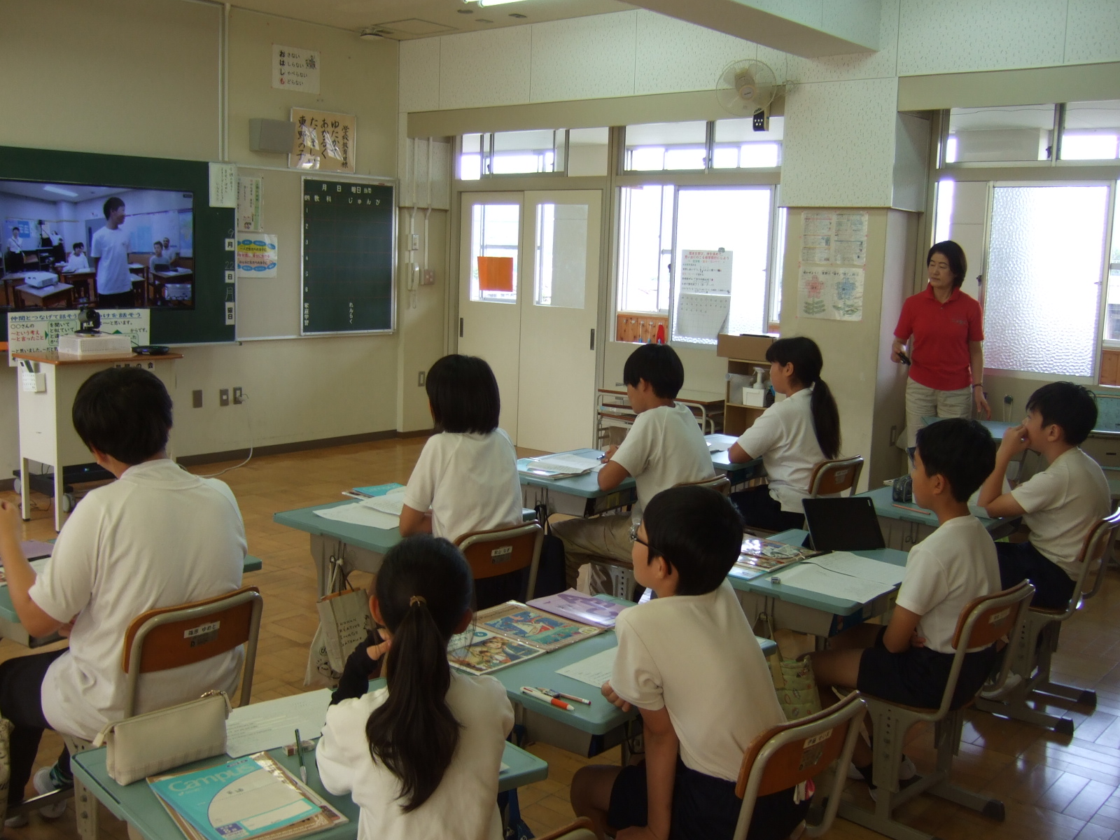 今日は、インターネットを介して、上矢作小学校の6年生と東野小の6年生が外国語で交流です。