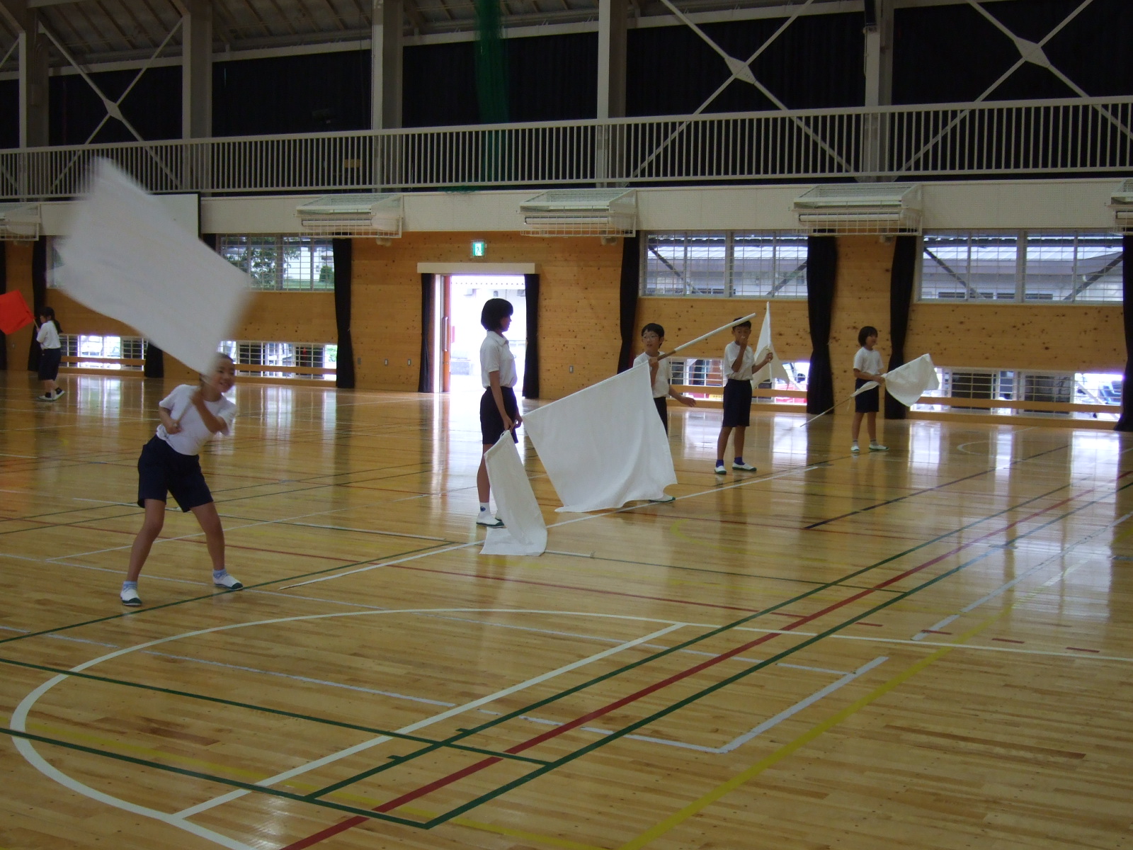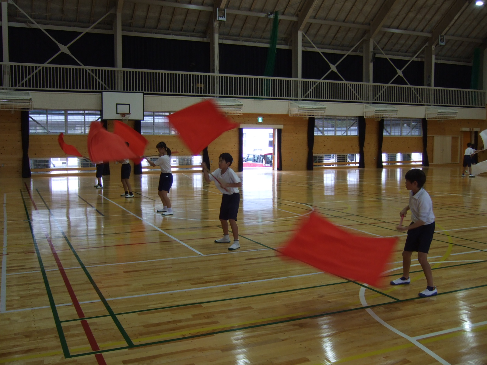 みんなでそろえて旗を振るのは難しいですね・・・旗の持ち方一つでもそろい加減が変わります。一生懸命練習して・・・次は運動場で・・・