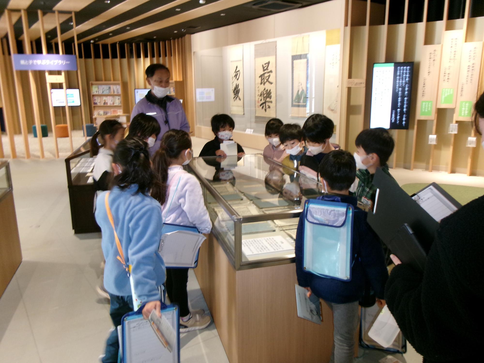 2年生は生活の勉強で、身の回りの公共施設を知ったり、そこで働く人との触れ合いを通してどうやって使うと良いかを勉強しています。今日は、岩村に新しくできた、佐藤一斎(恵那市の偉人)の記念館である「学びの広場」とそこに併設された、恵那市図書館岩村分館を見学しました。