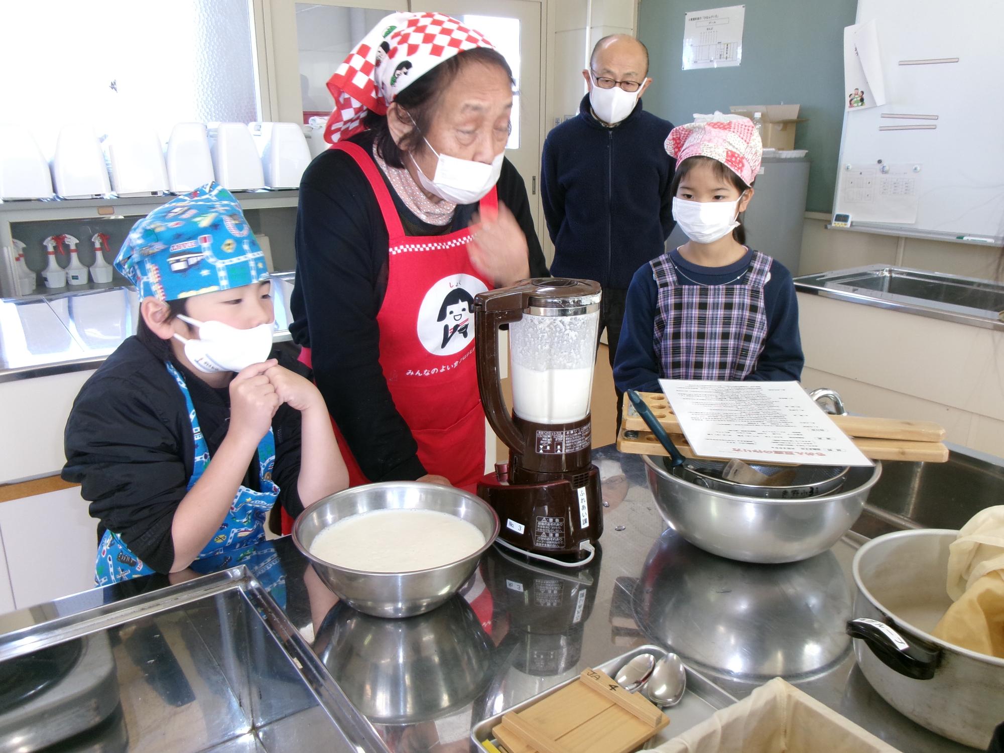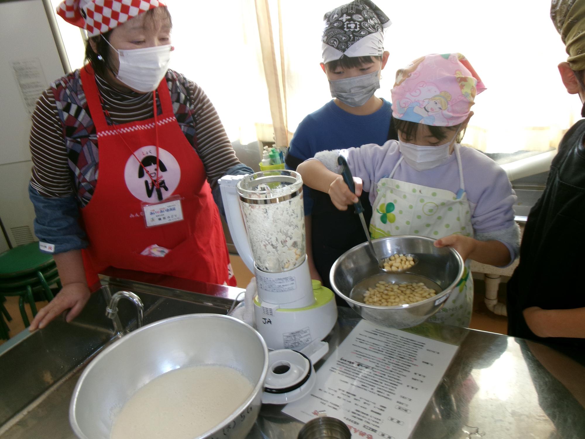 ミキサーに、柔らかくした大豆を入れて・・・