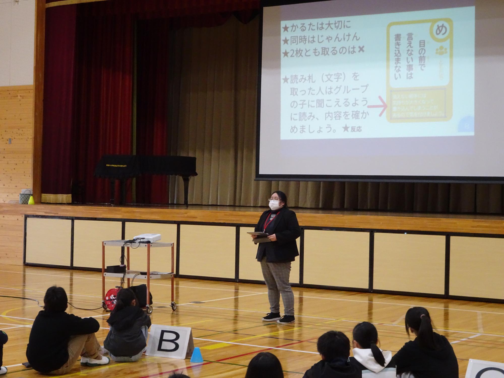 カルタに書かれている内容を詳しく先生と一緒に考えました。
