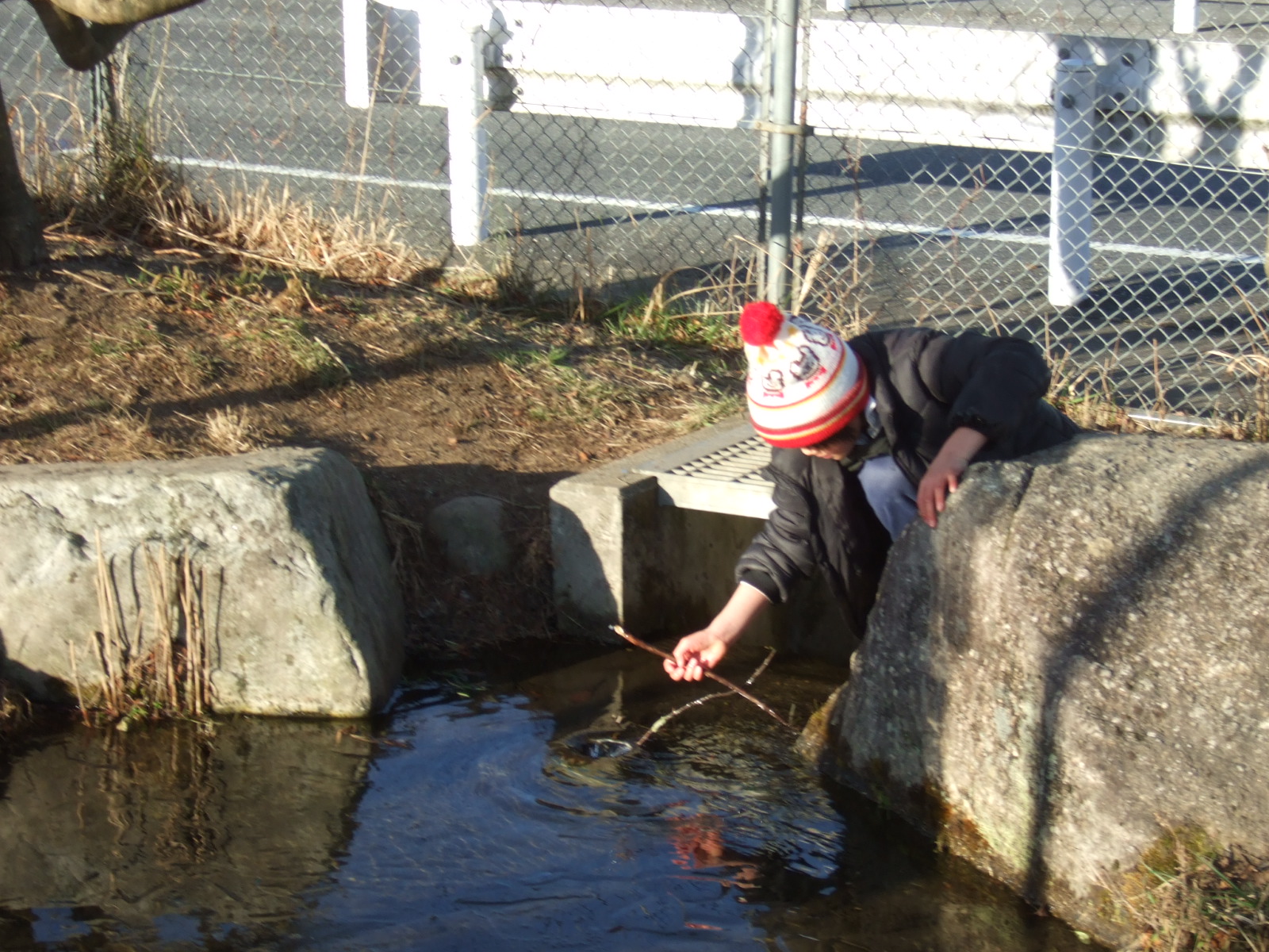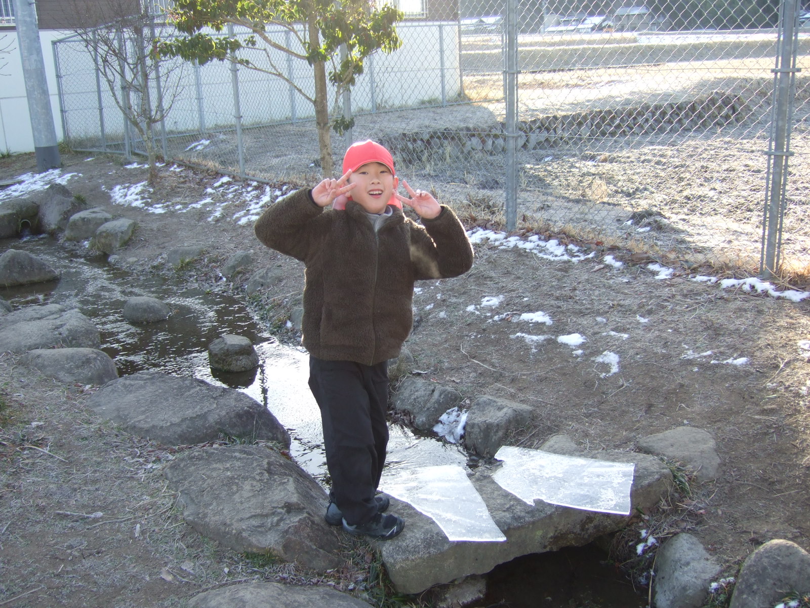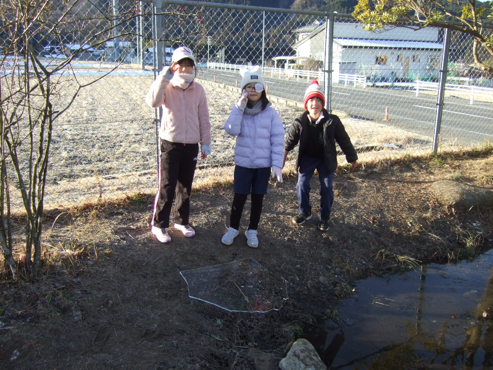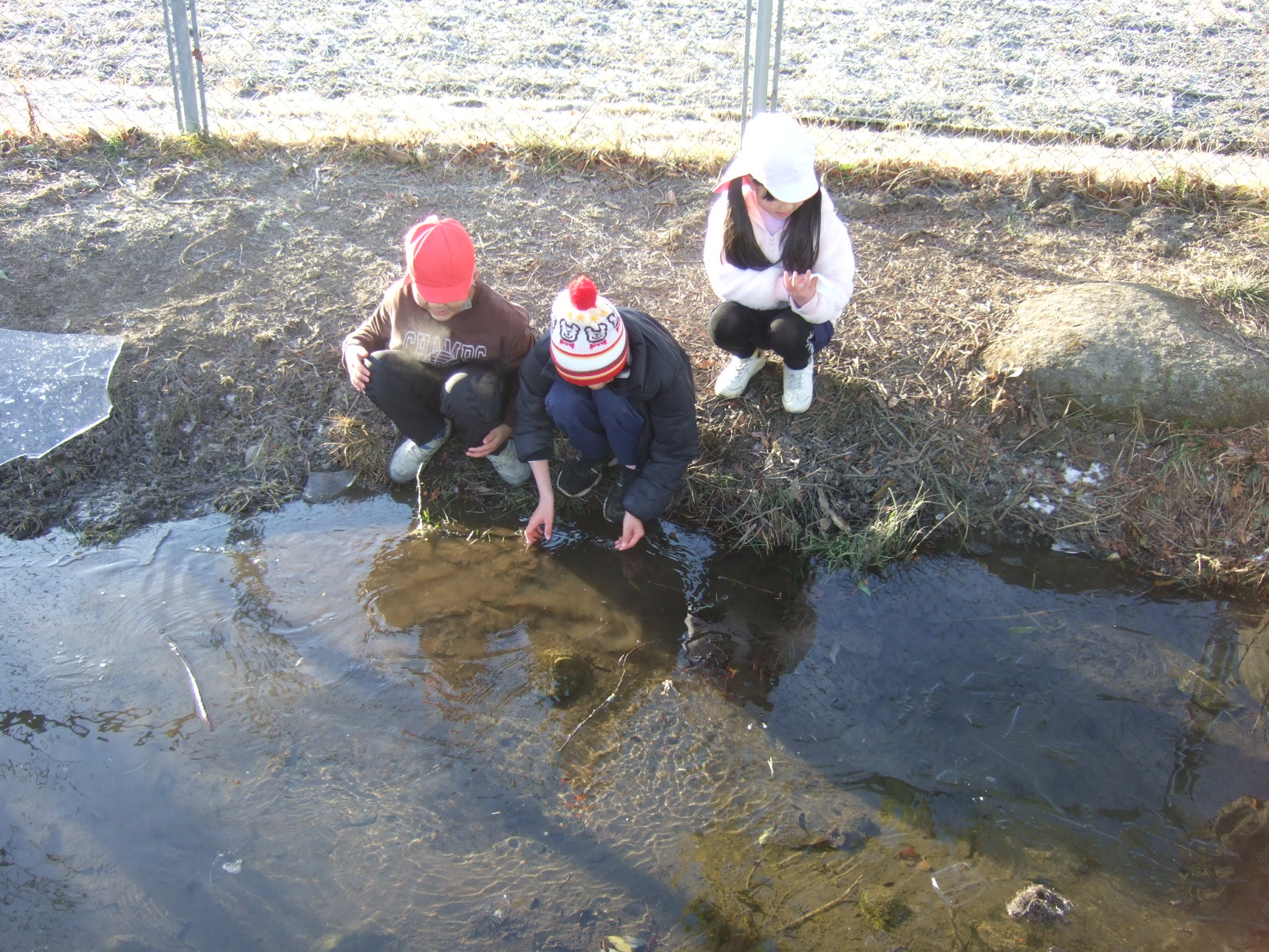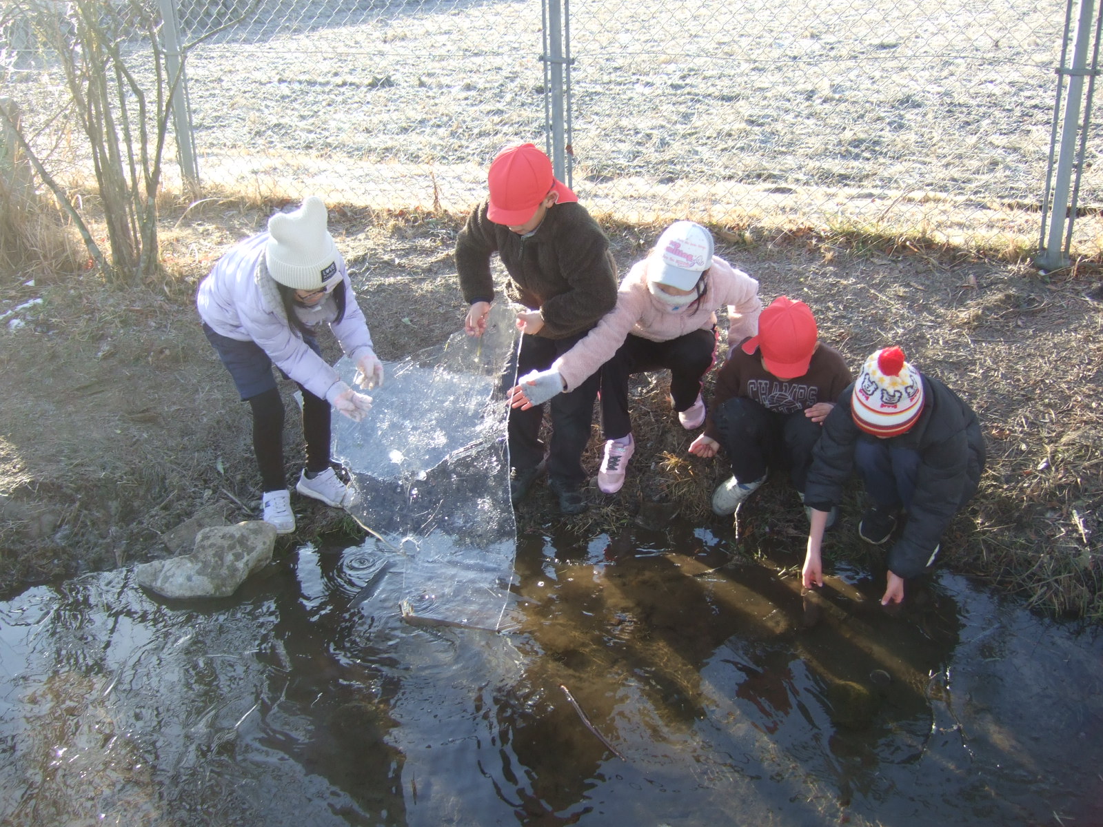 連日の冷え込みで、ビオトープの表面の氷が凍っていました。それをよく知っている子供たちが、あさ、ランドセルを片付けると、ビオトープに集まってきました。