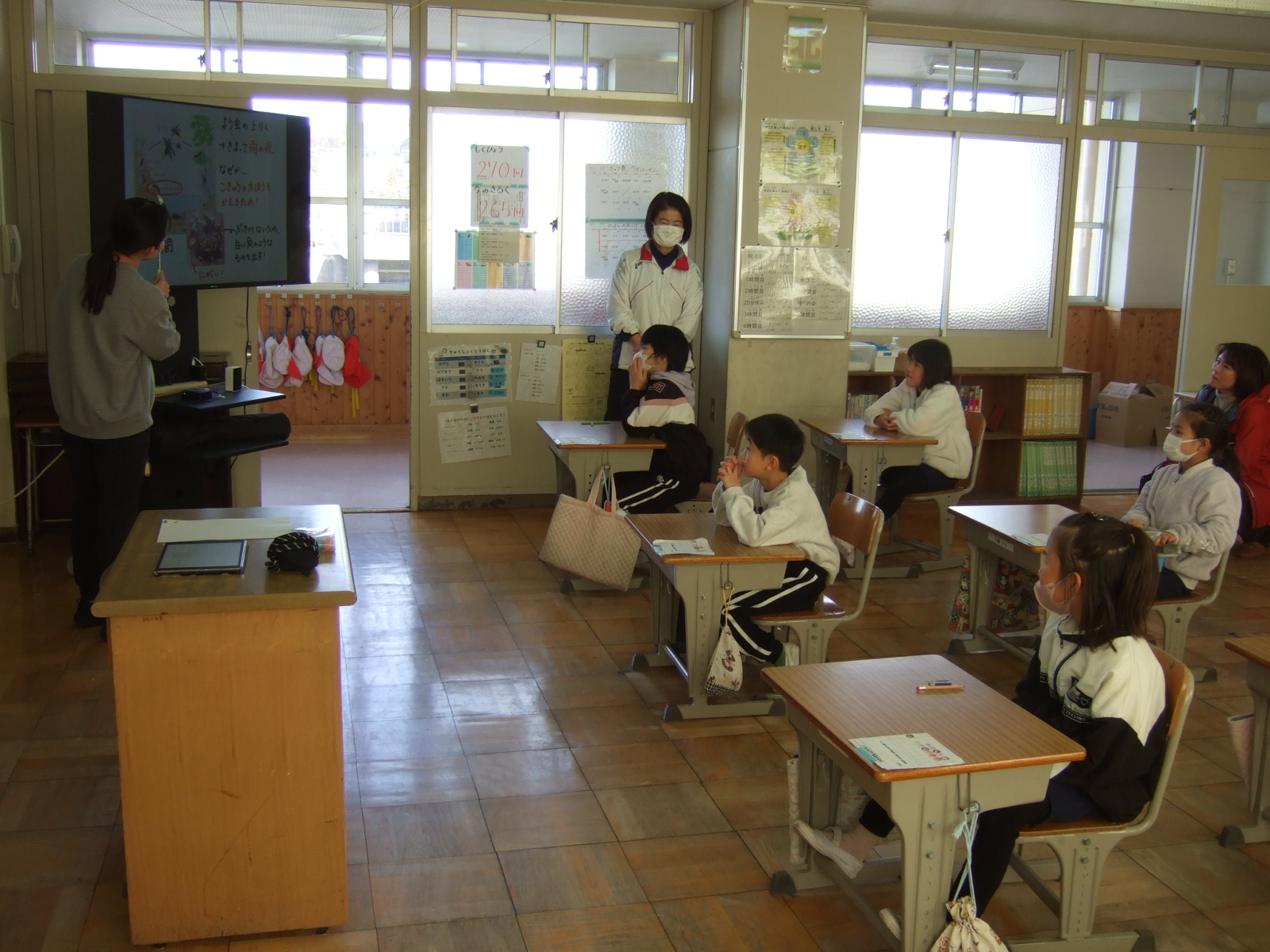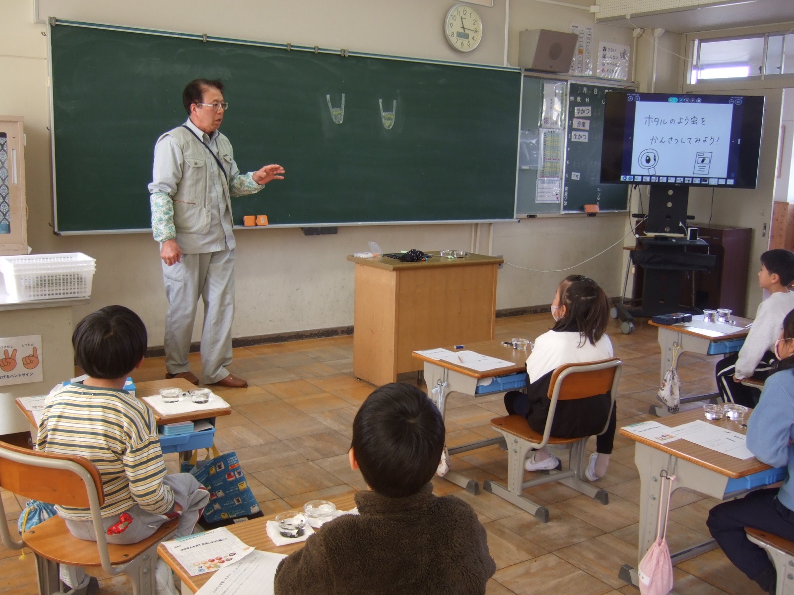 特別に、学校運営協議会の推進員さんが、成虫となったオスとメスの光り方の違いを説明してくださいました。6月のホタル祭が今から楽しみになってきました。