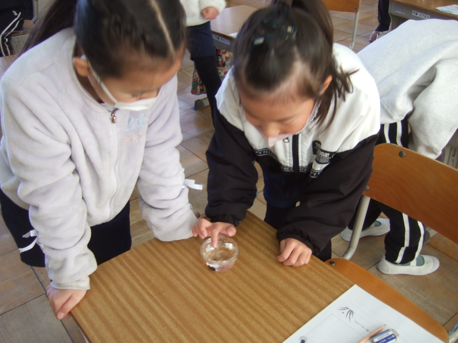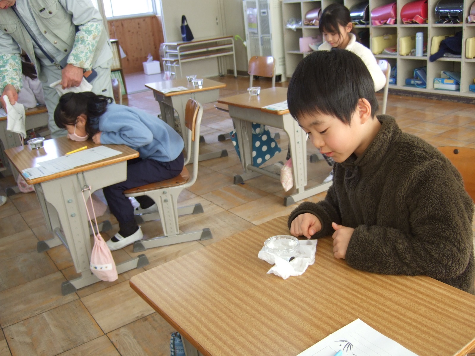 早速、幼虫の観察です。最初は、「気持ち悪い」と言っていた子もいましたが、じっくり観察すると、6本の足や小さな頭が分かってきます。