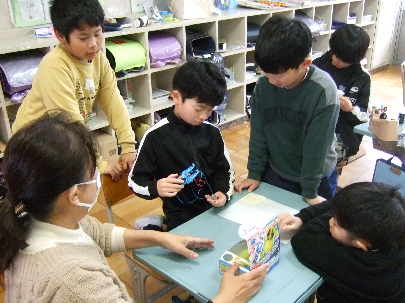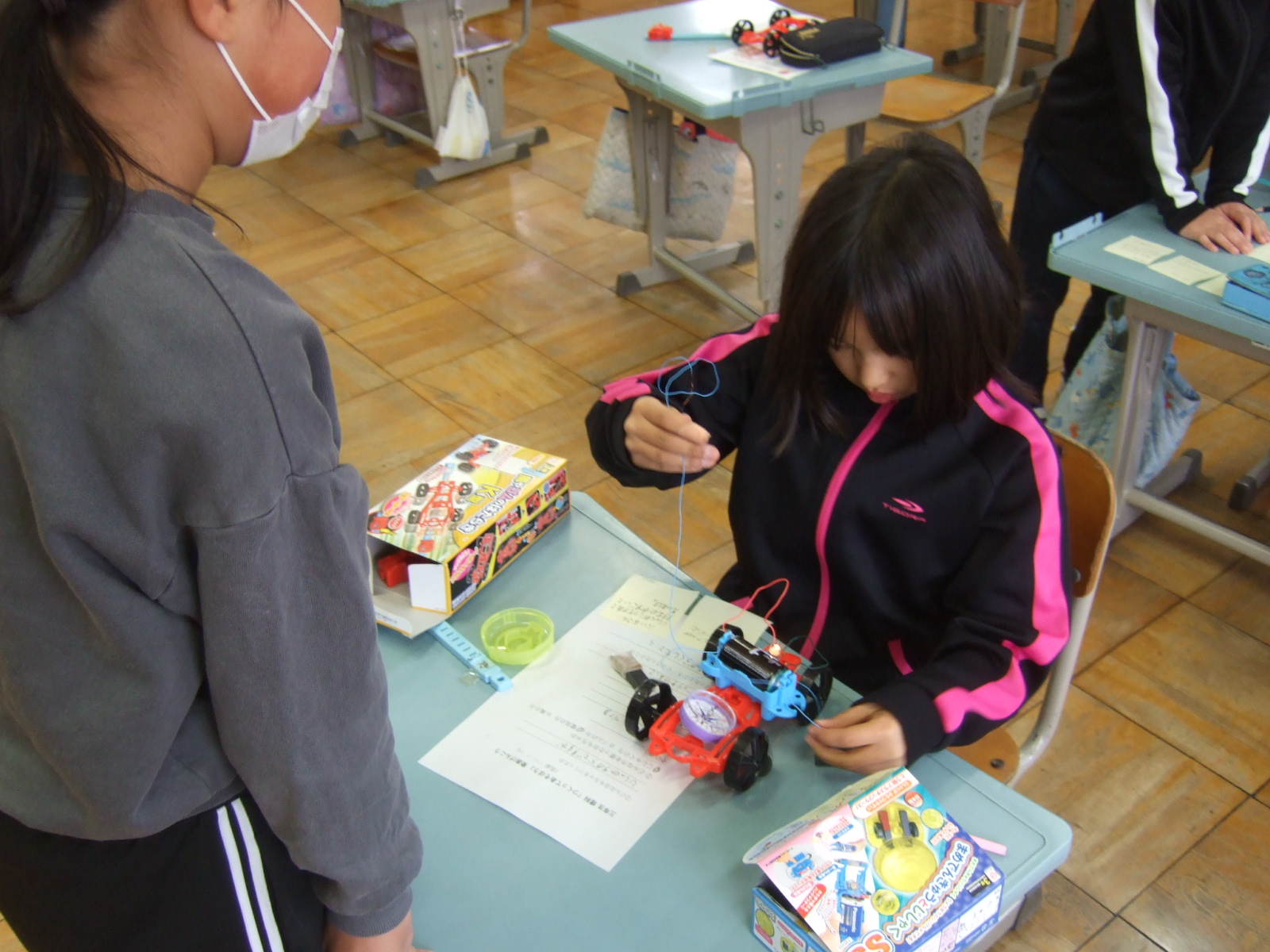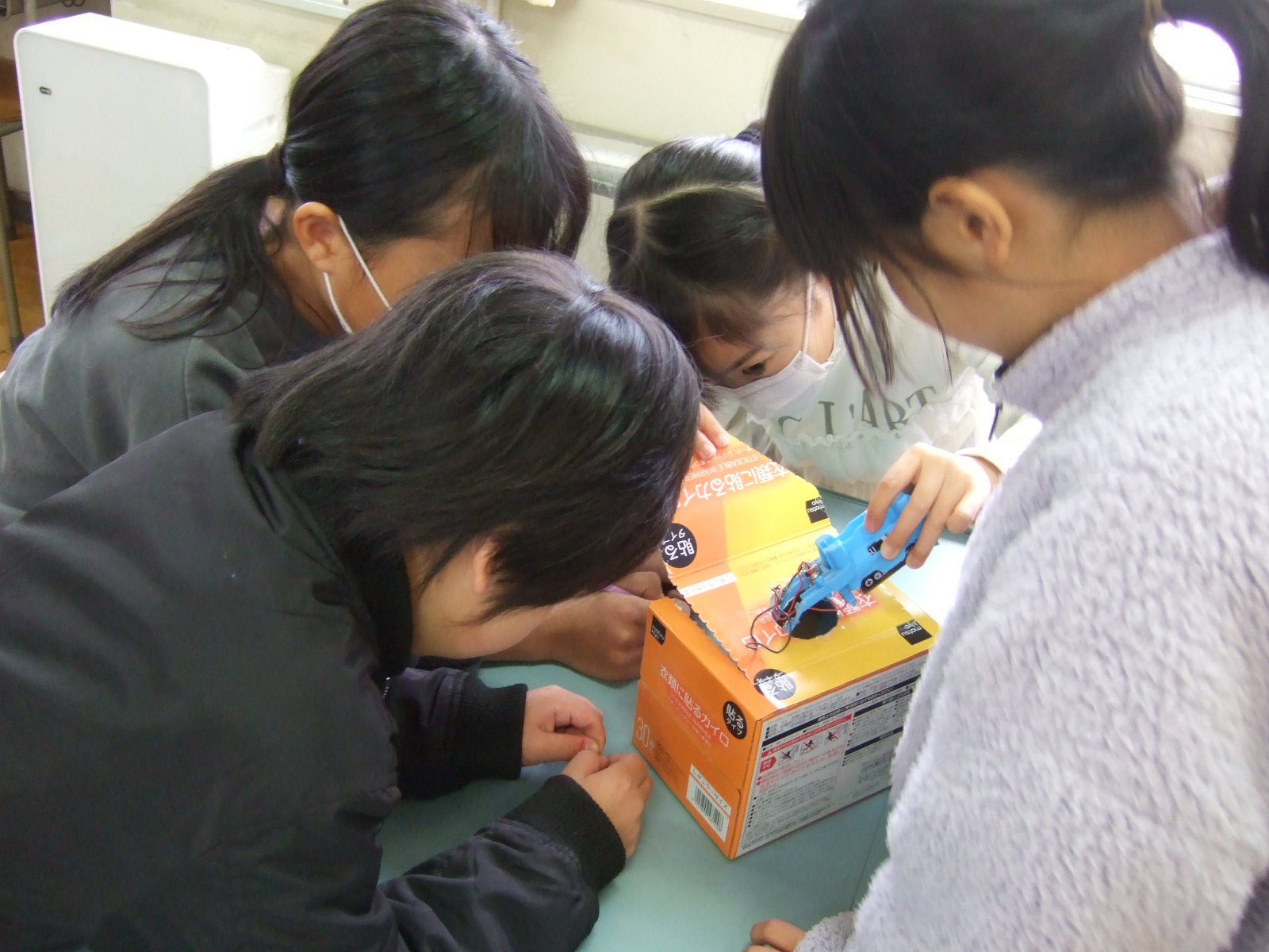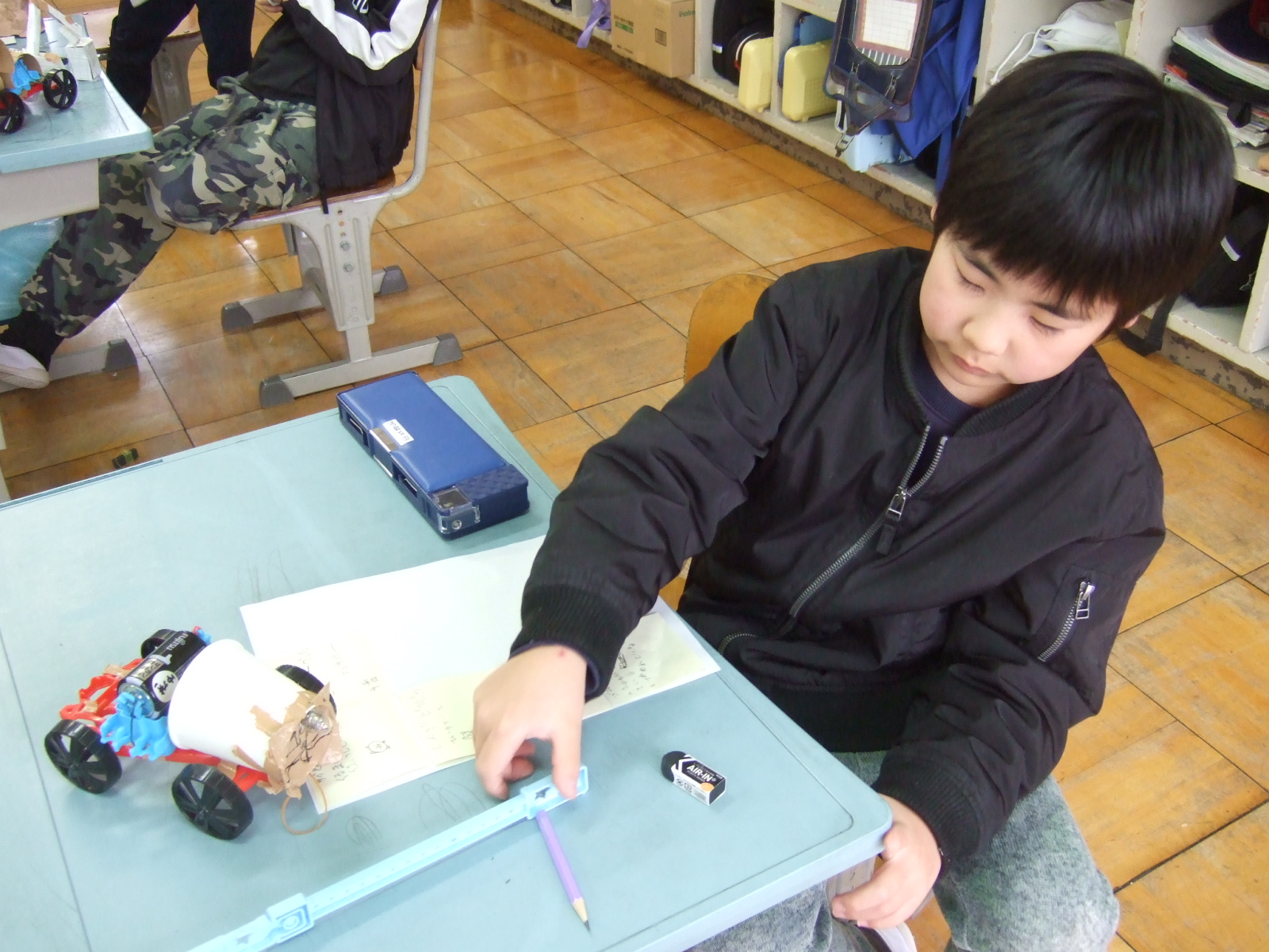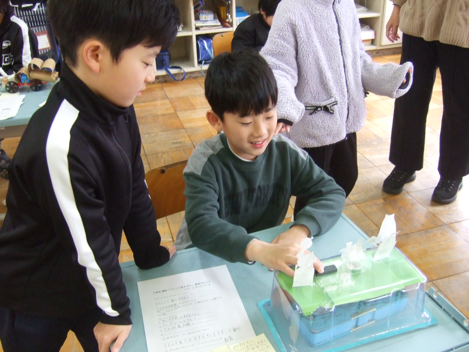 3年生は理科で、磁石のはたらきと電気を勉強してきました。磁石が鉄を引き寄せること、S極とN極が引き寄せ合い、同じ極だと退け合うこと、電気は、金属だと流れることを勉強してきました。今日は、そんな原理を利用して(工夫して)おもちゃ作りです。