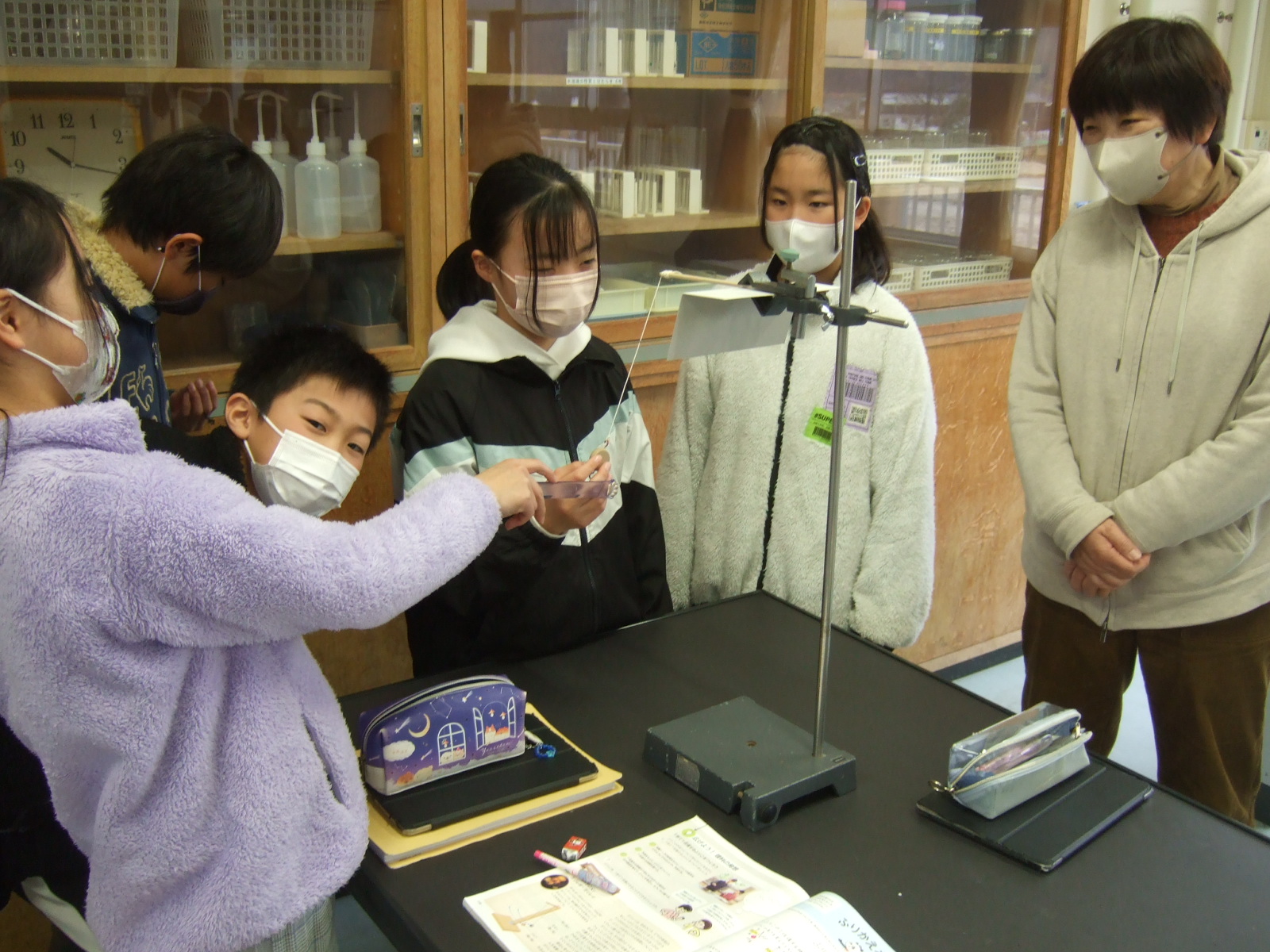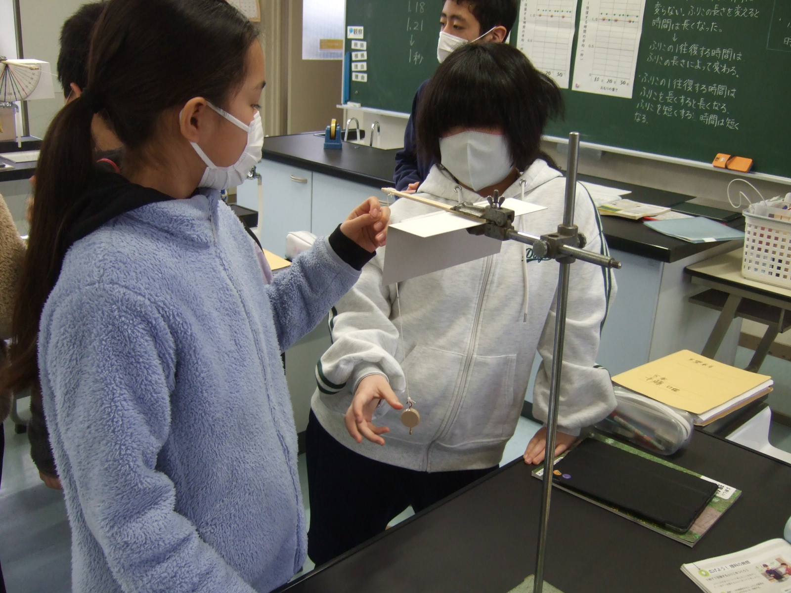 5年生は理科でふりこのきまりを見つけています。日常生活の中でも、学校のブランコや、ひもにぶら下がってターザン遊びなどで、ふりこがゆれる感覚は体験しているかと思いますが、そこにどんなきまりがあるのかを勉強しています。ちなみに、柱時計の中にあるふりこも、その原理を利用して時を刻んでいます。