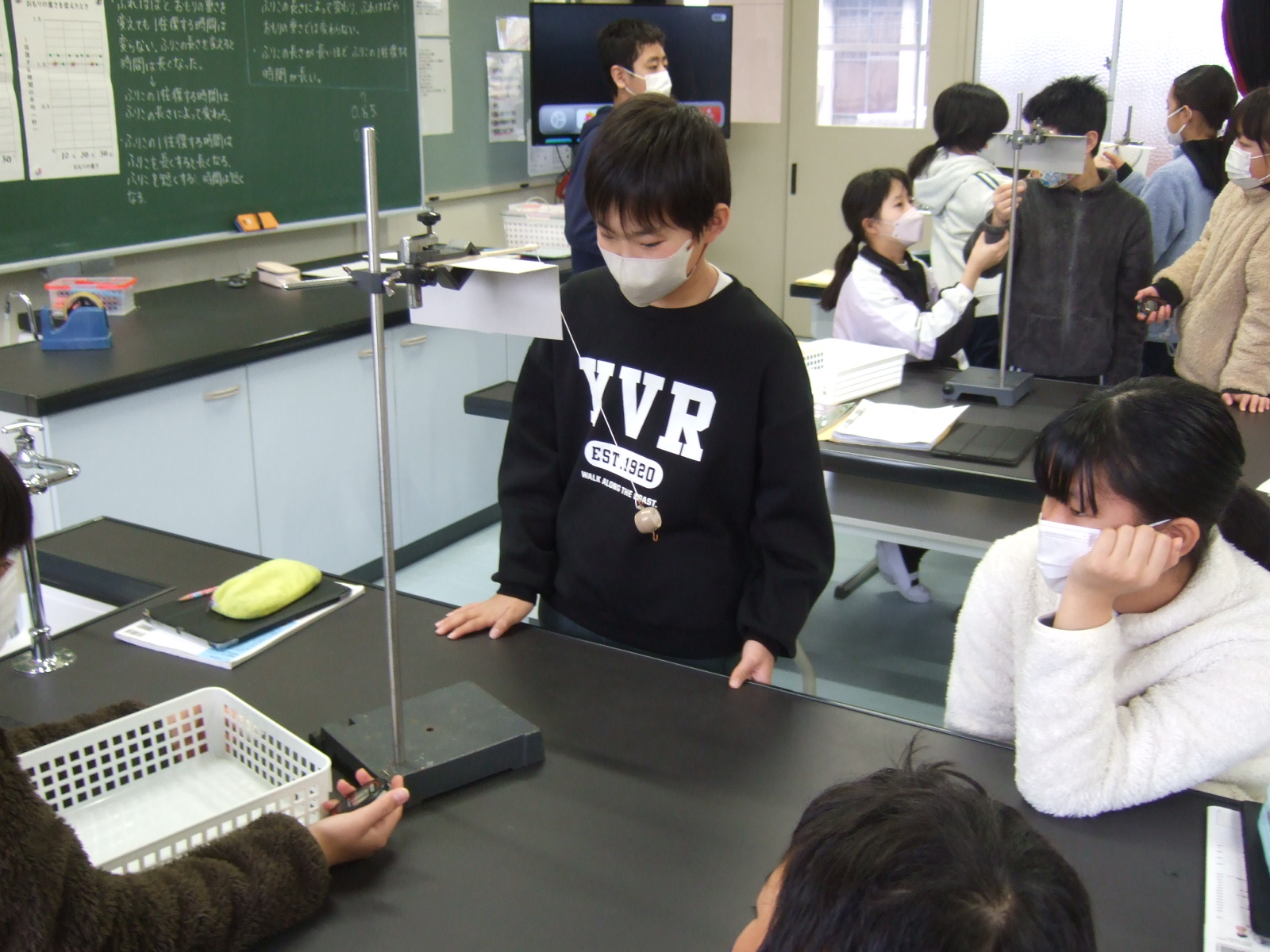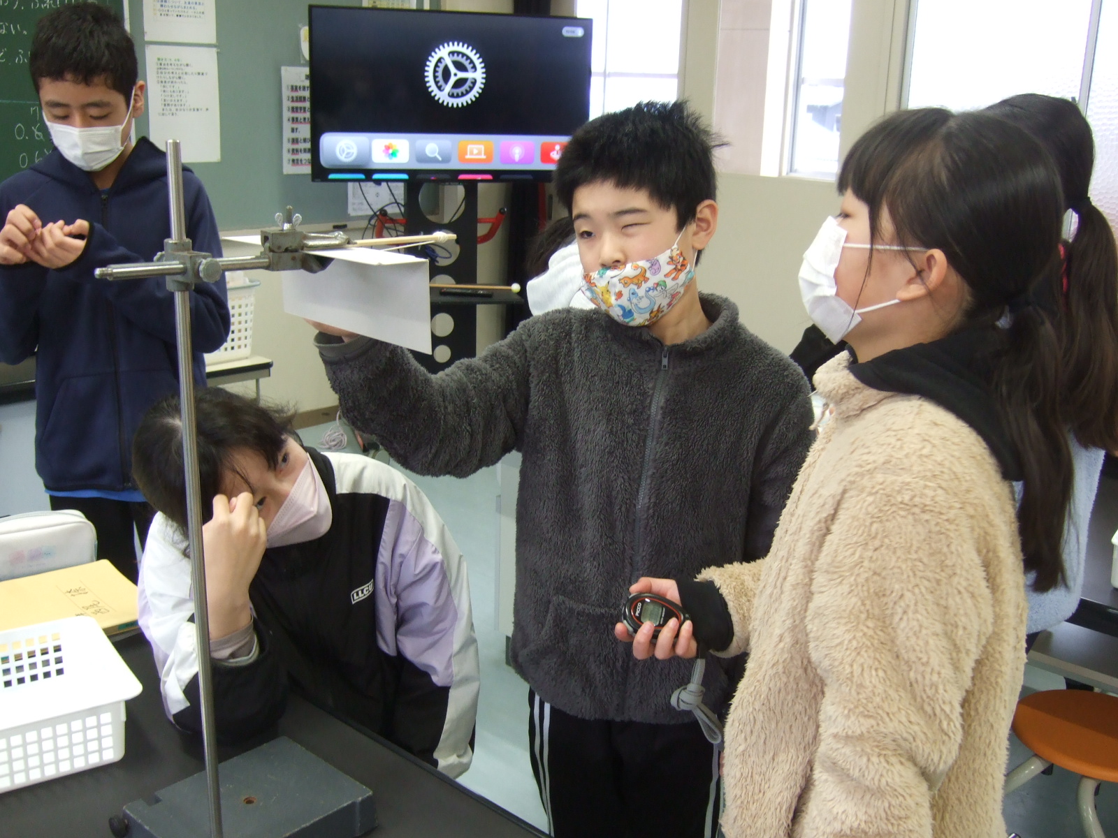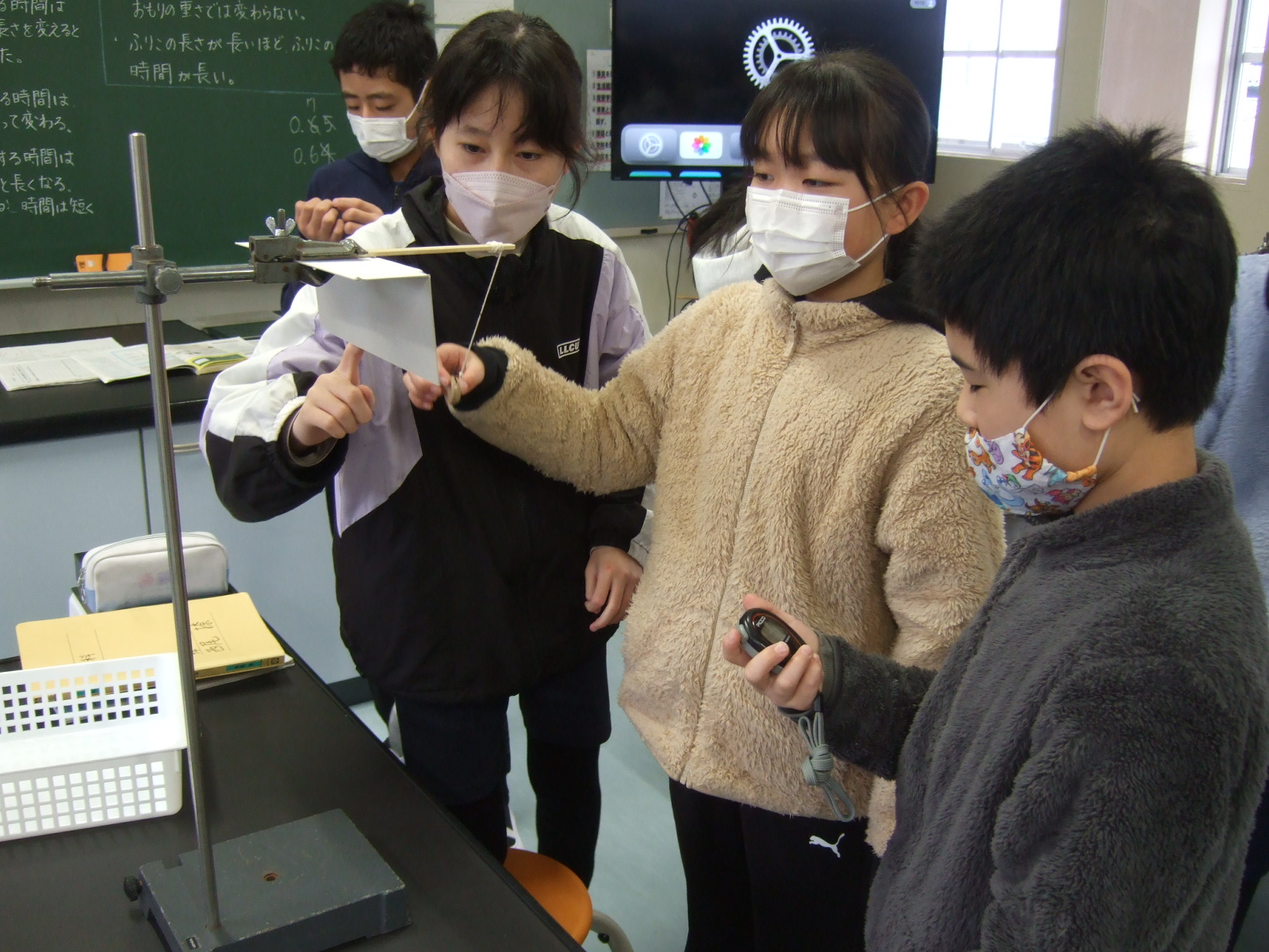 今日は、1報復で約1秒になるようにするには、ふりこの糸の長さをどれだけにすればよいかを、何度も実験しながら調査中です。