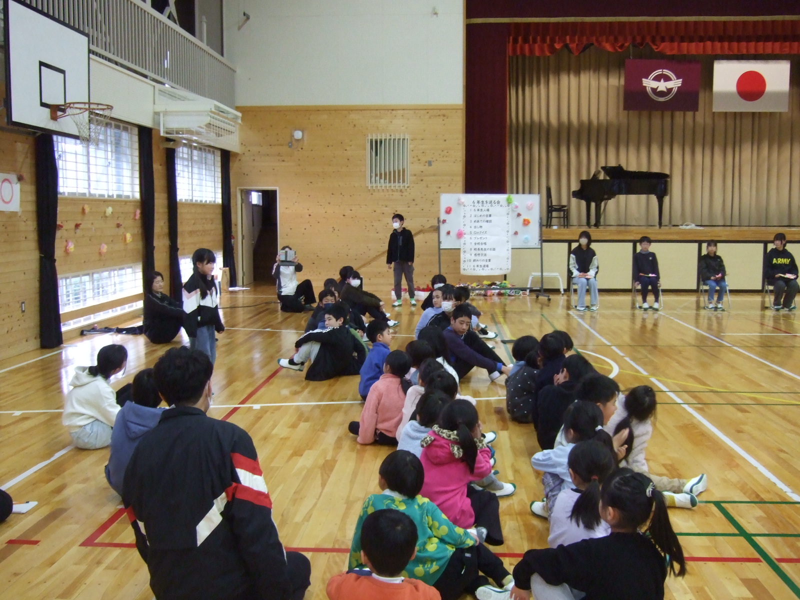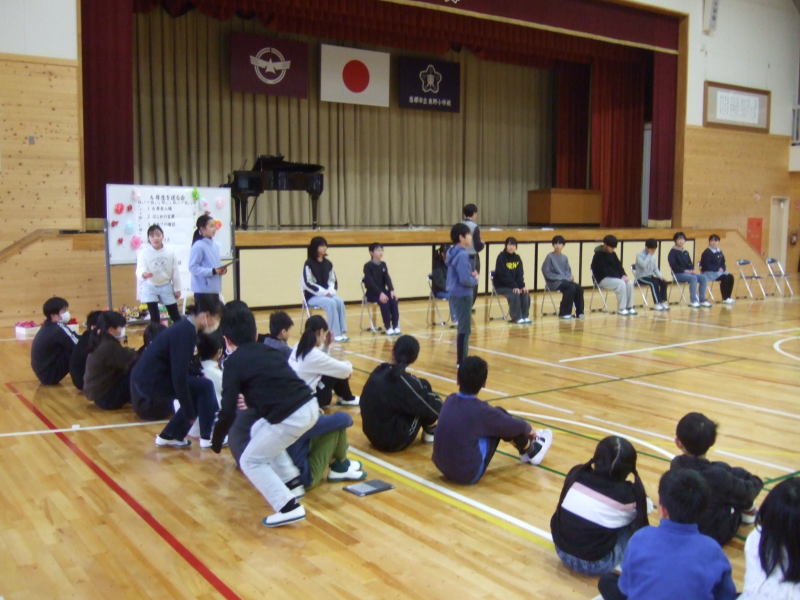 会が始まる前に、5年生のリーダーが、「全校で6年生に感謝の気持ちを伝えられるように、みんなで、頑張りましょう。」と伝え、いよいよ「6年生を送る会」のスタートです。