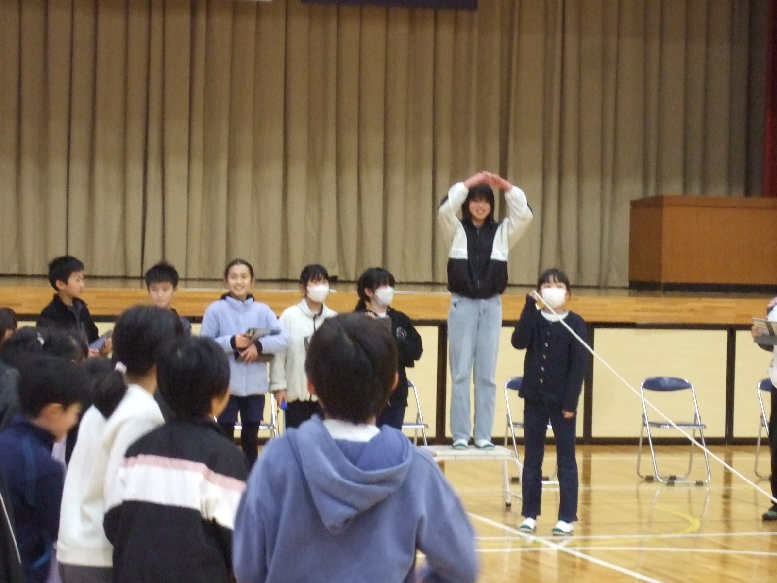 ◯×で全校が考えました。見ていると、全校の児童は6年生のことをよく知っていて、いつも正解の方が人数が多かったです。クイズを楽しみながら、6年生と楽しく過ごしました。