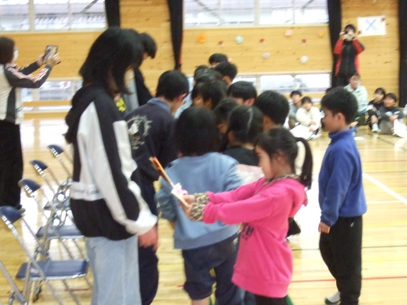 次は、プレゼント渡しです。裏方の5年生がサッと、準備して1年生にメッセージカードを渡して・・・