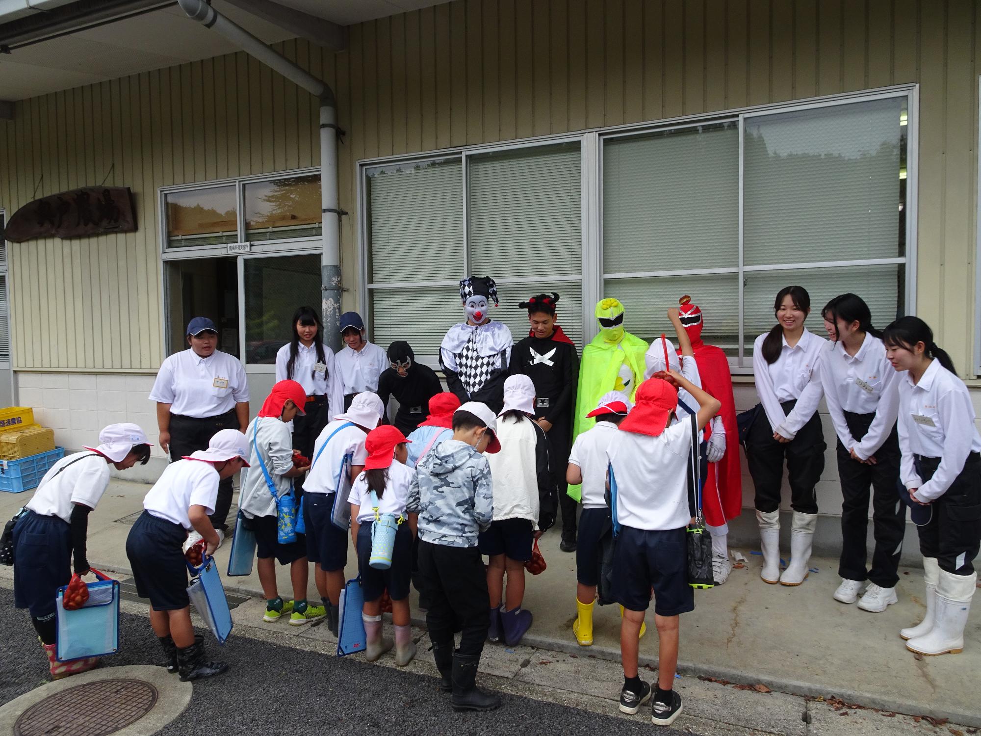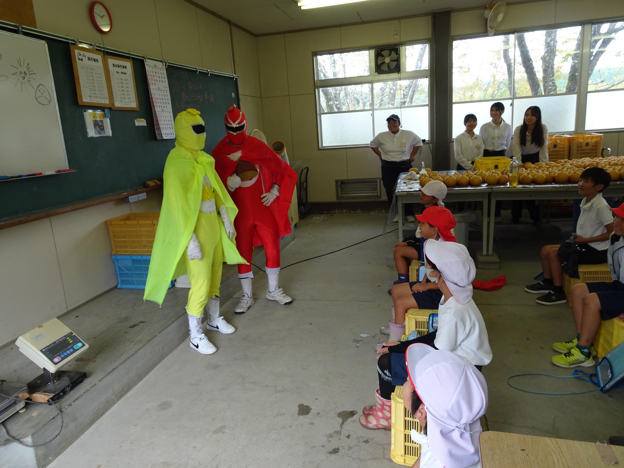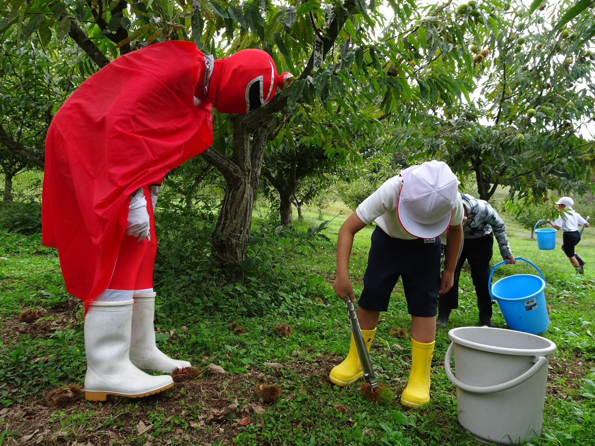 すると、今回も、小学生を楽しませながら教えようと、栗のヒーローさんが登場して、栗の拾い方を教えてくださいました。