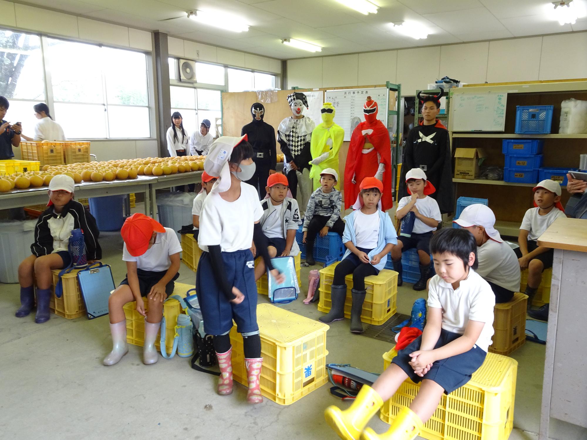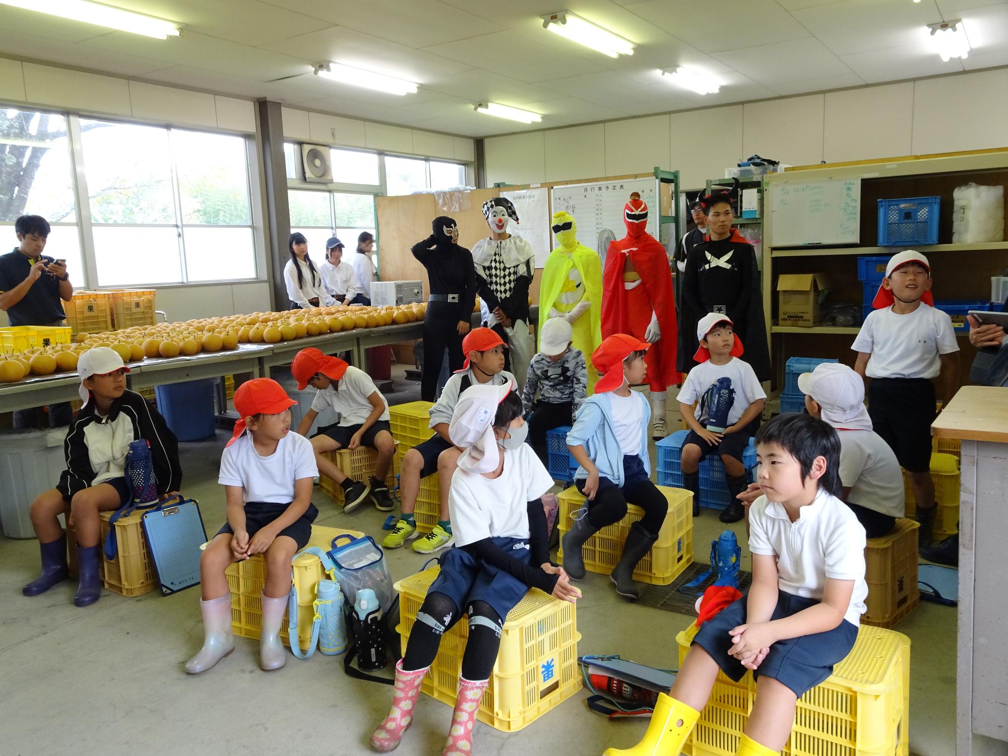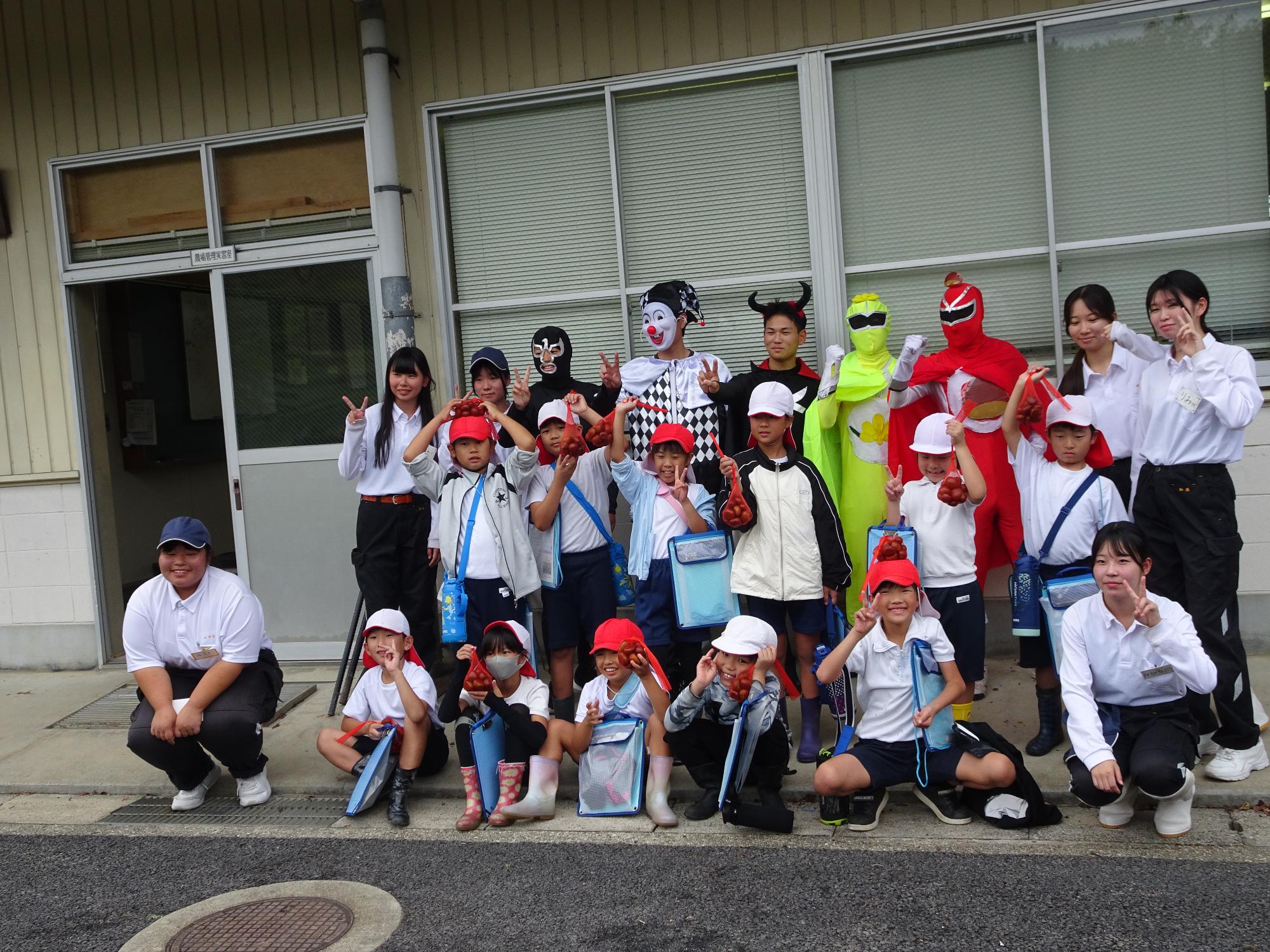 すると、今回も、小学生を楽しませながら教えようと、栗のヒーローさんが登場して、栗の拾い方を教えてくださいました。