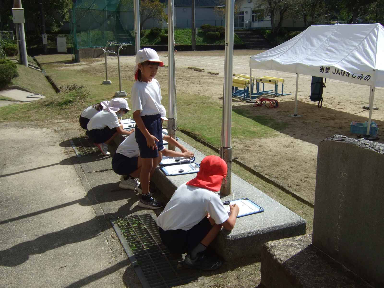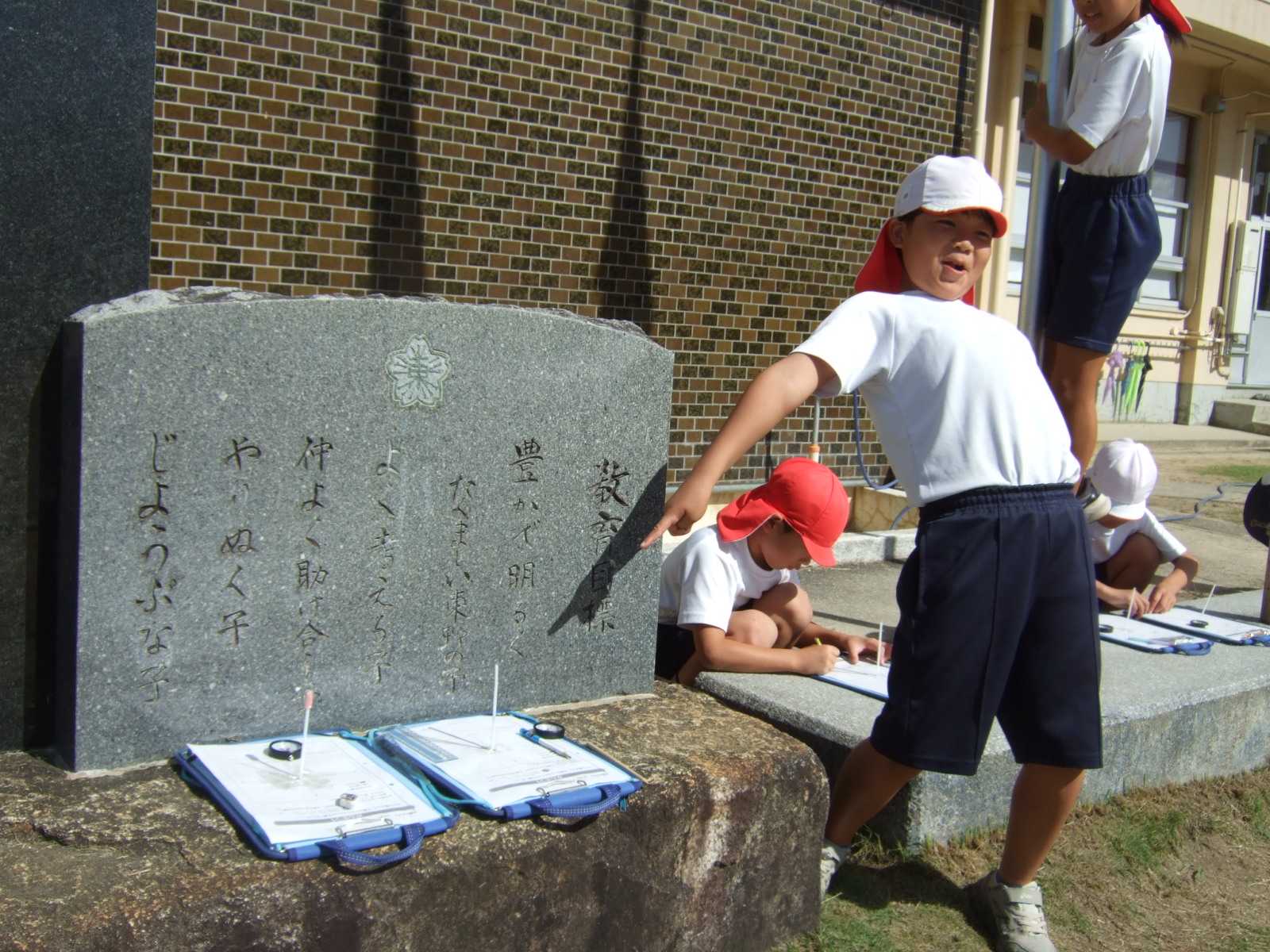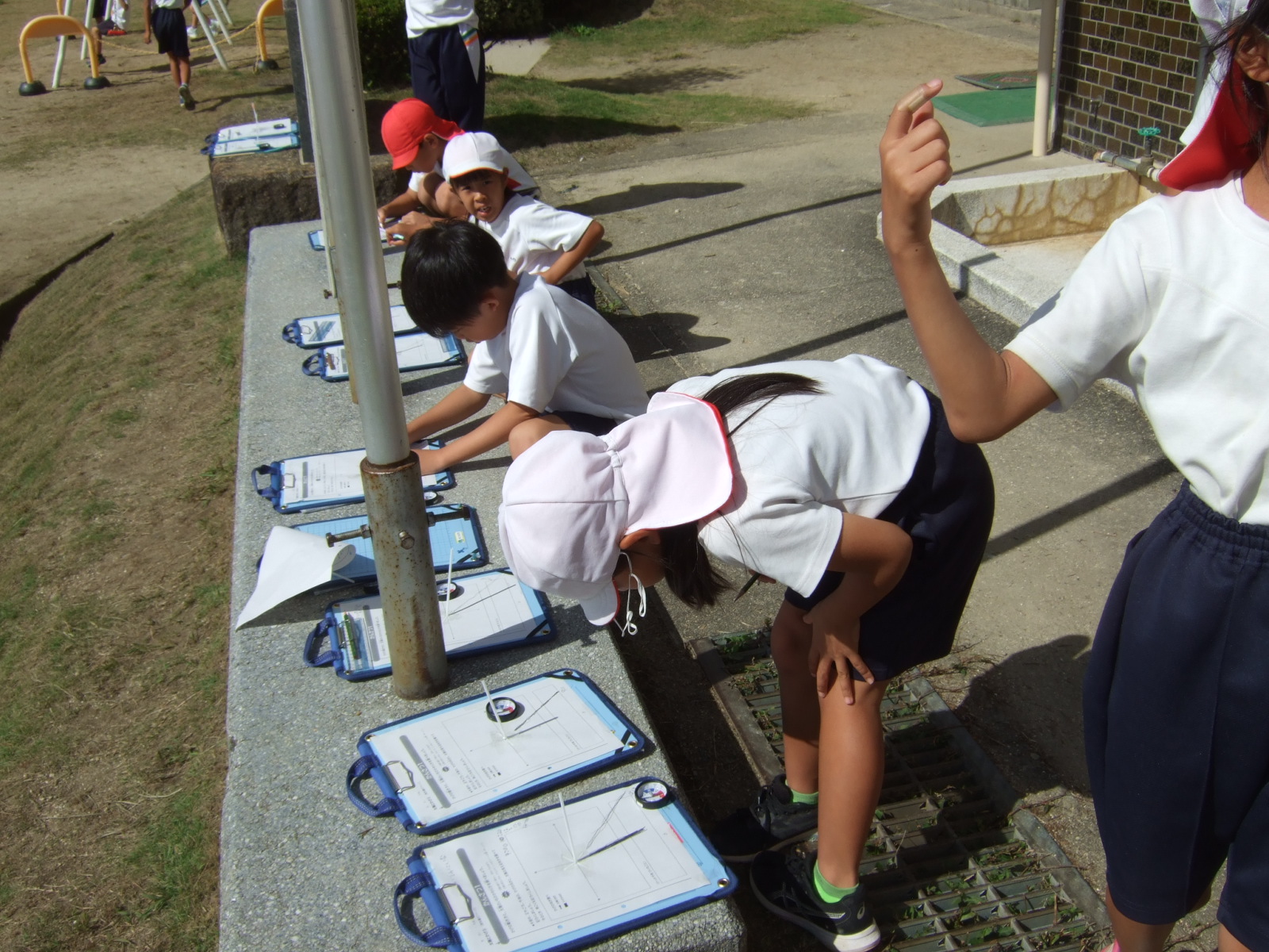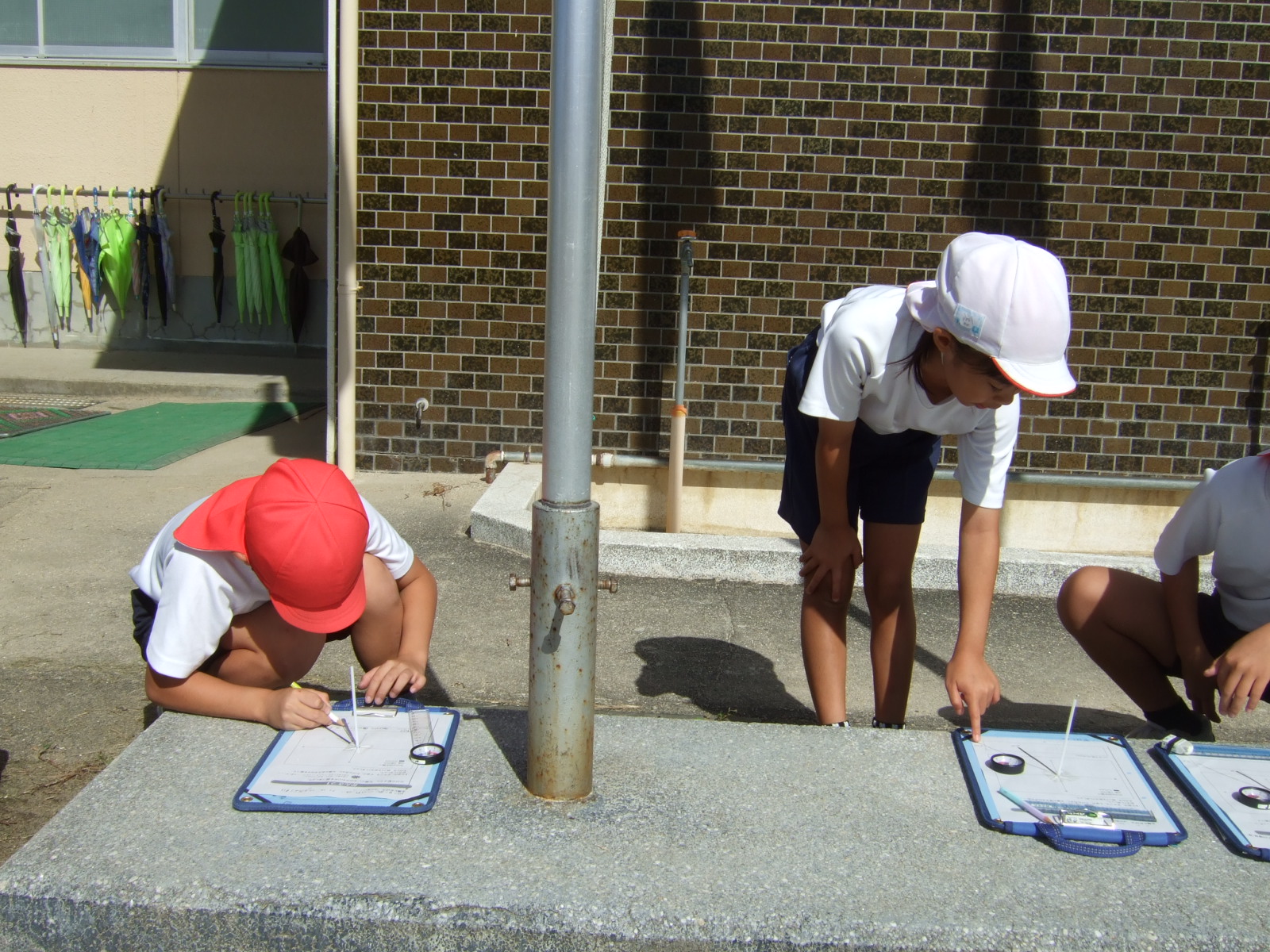 秋分の日を過ぎて、太陽高度が低くなってきた10月、3年生は太陽の動き(影のでき方)を実際に調査中。