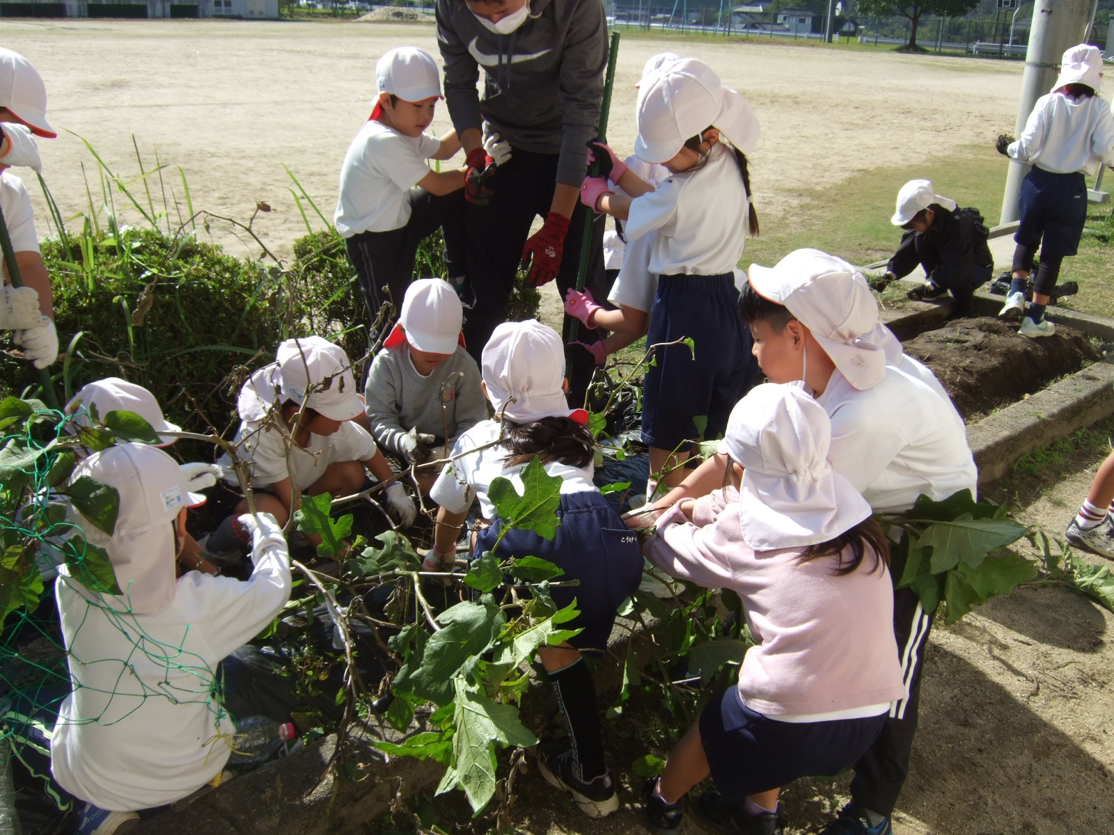 春に植えた、ナス、キュウリ、ピーマン、オクラ、トマトなどが涼しくなってきて枯れてしまっているので、今日は学級の畑のお片付けをしました。