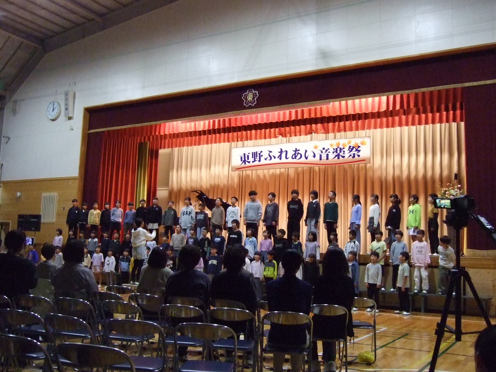 満員御礼の東野小学校の体育館で、今日はいよいよ東野ふれあい音楽祭。これまで練習してきた成果を発揮しようと・・・子供たちは少し緊張気味でした。