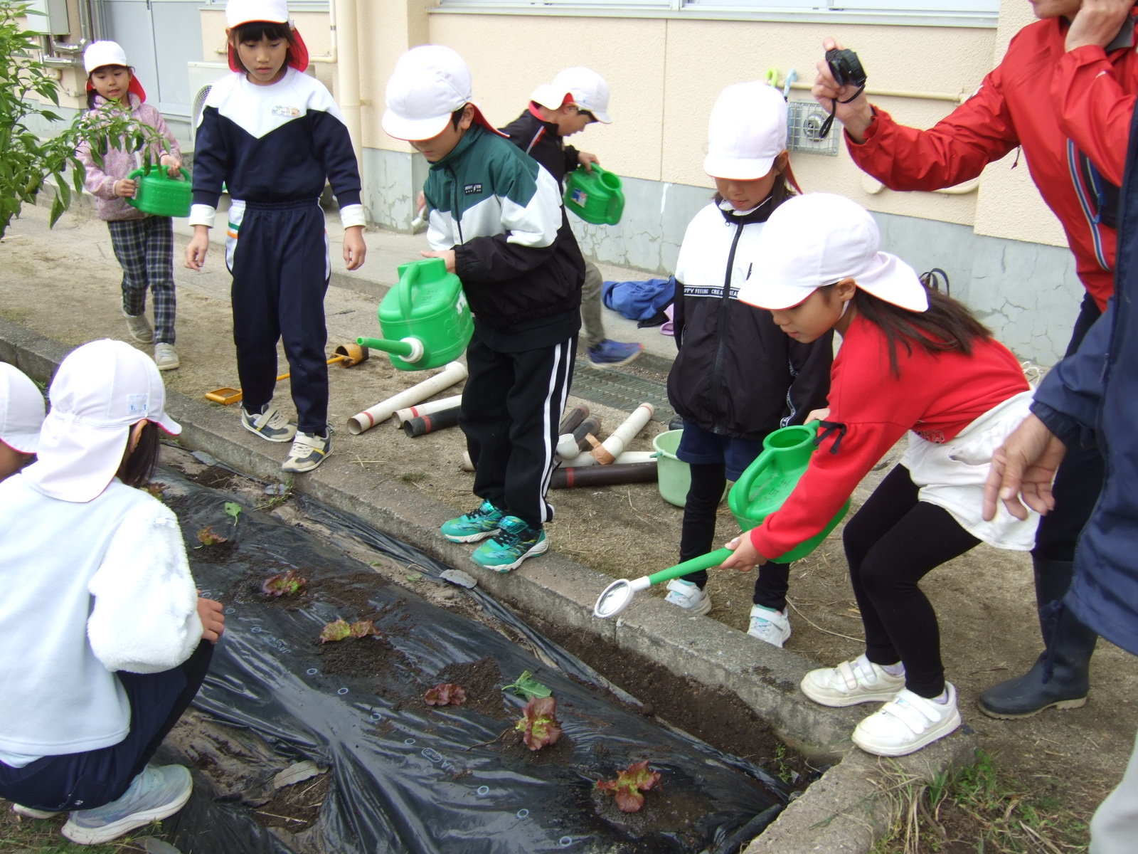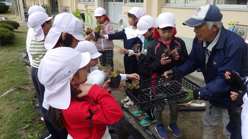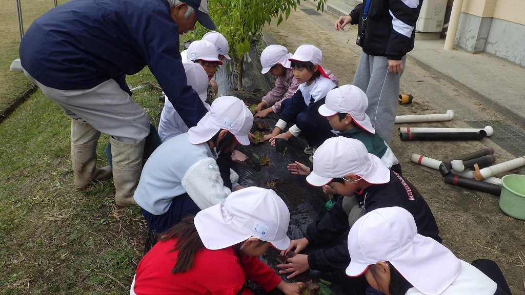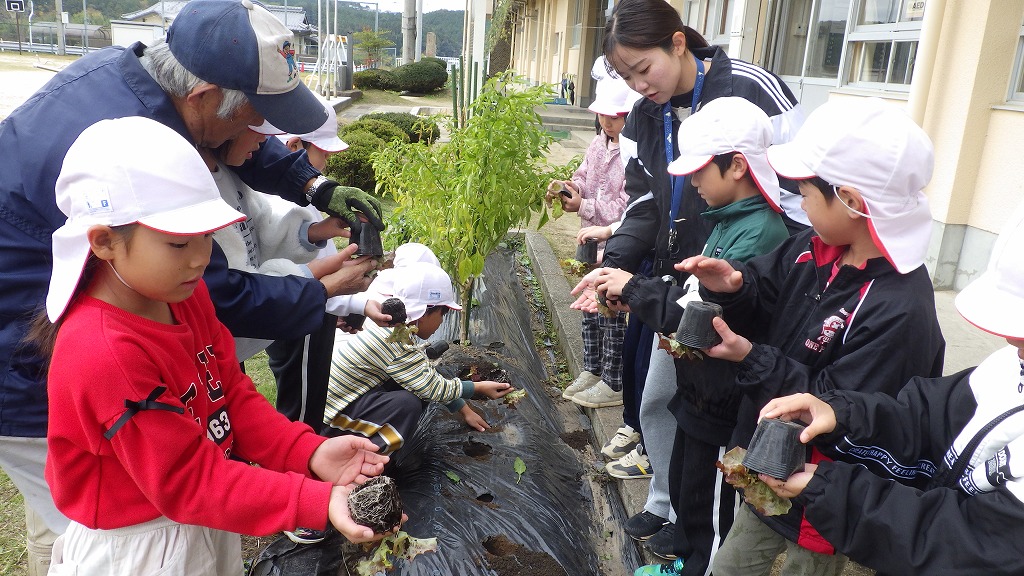 2年生も1年生に続き、地域の方から分けていただいたサニーレタスを地域の方々に教えていただいて学年の畑に植えました。