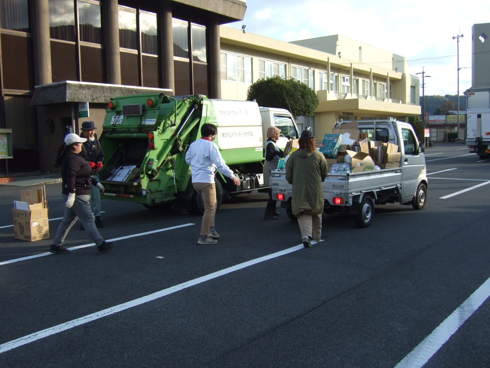 8時を過ぎると、各地域から公民館の駐車場へ続々と新聞紙などが集まってきました。