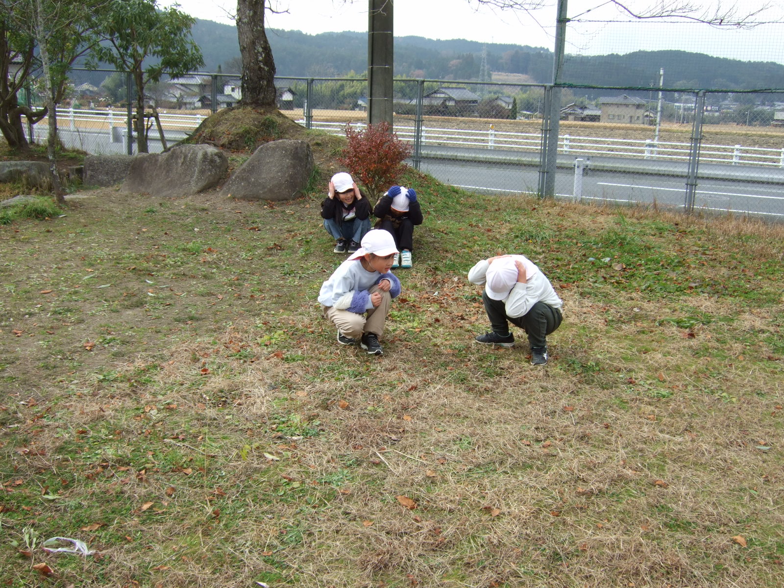 緊急の放送が鳴ると、ビオトープで遊んでいた子たちは、しゃがんで頭を守りました。