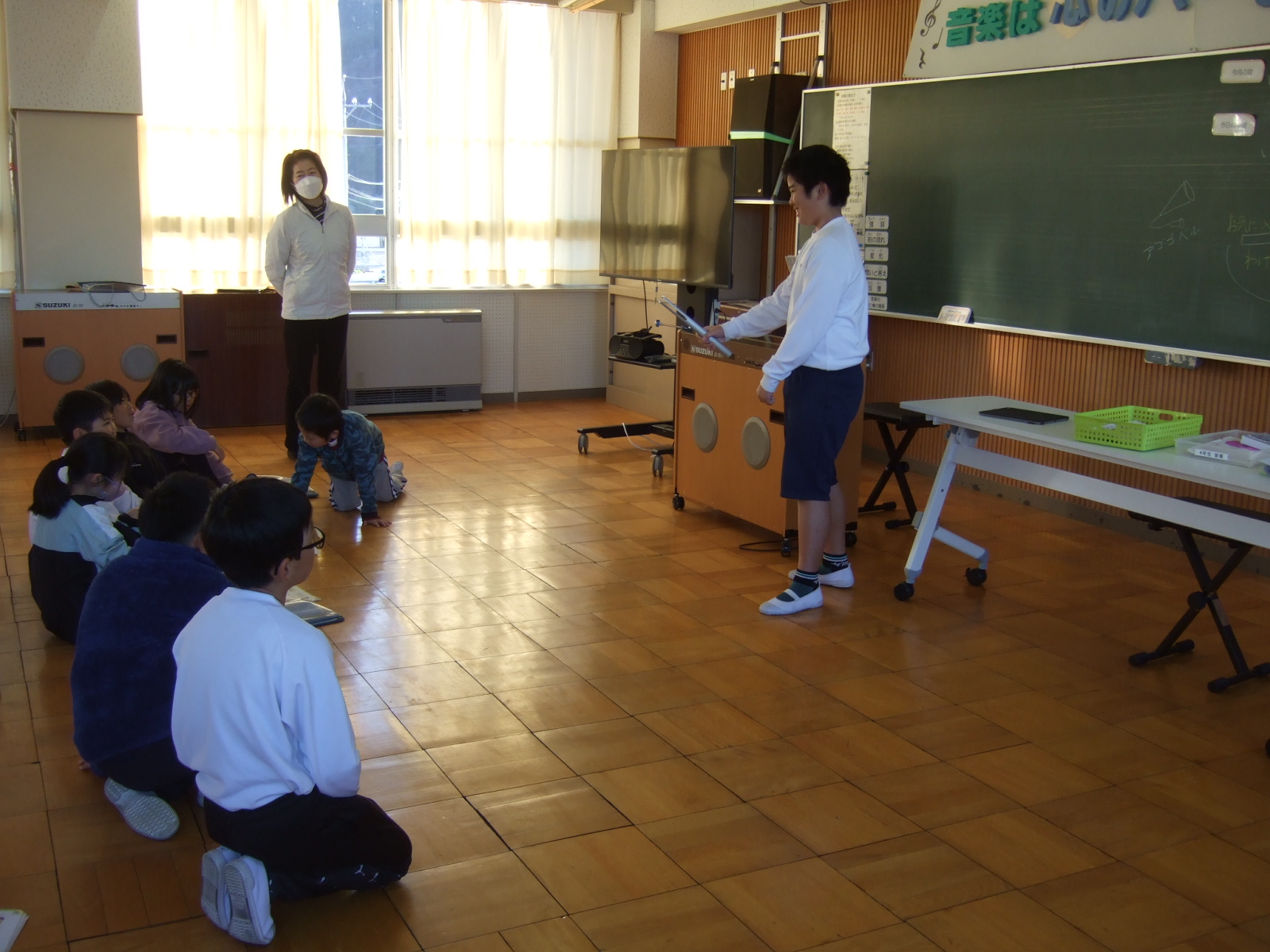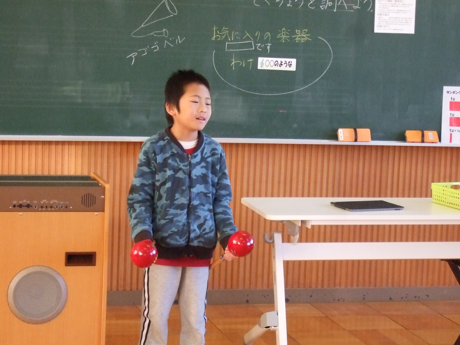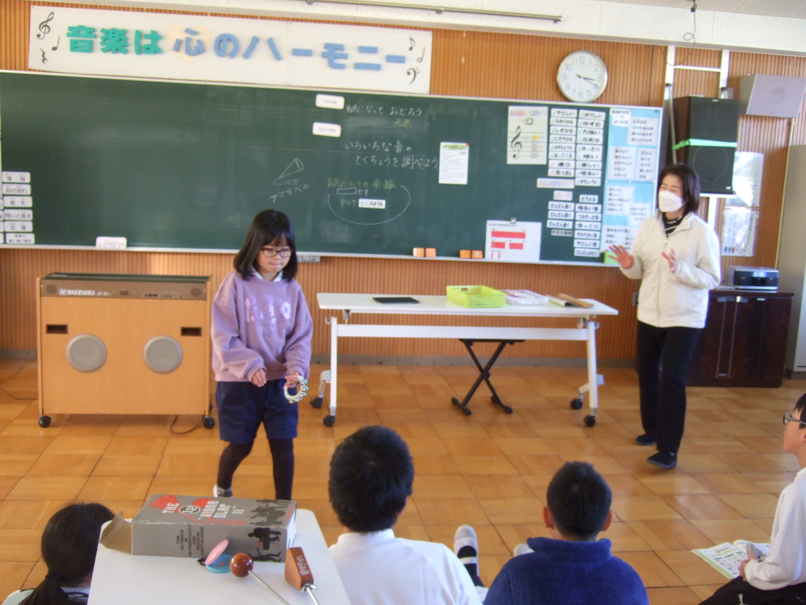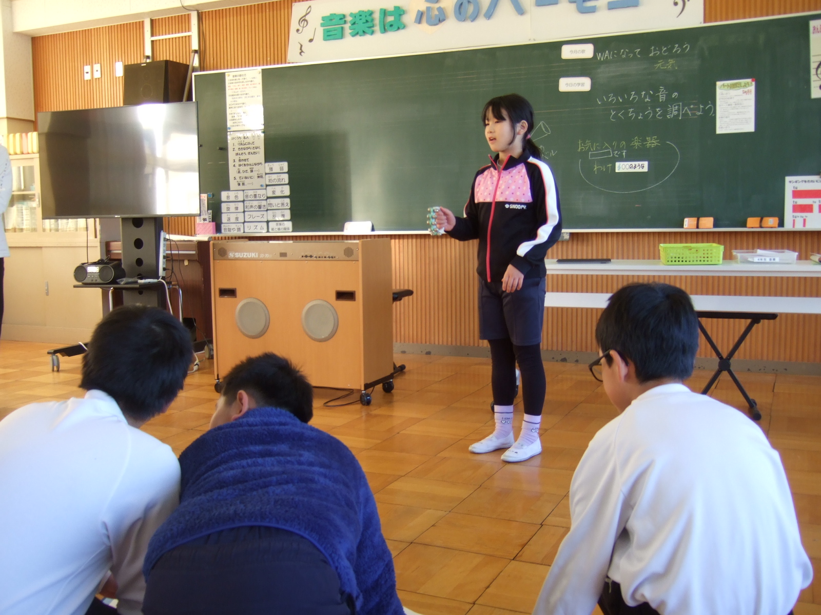 4年生は、音楽の時間に、いろんな楽器に触れて、音を楽しんでいます。今日は、自分のお気に入りの楽器を選んで、どうして選んだかをみんなの前で発表しました。