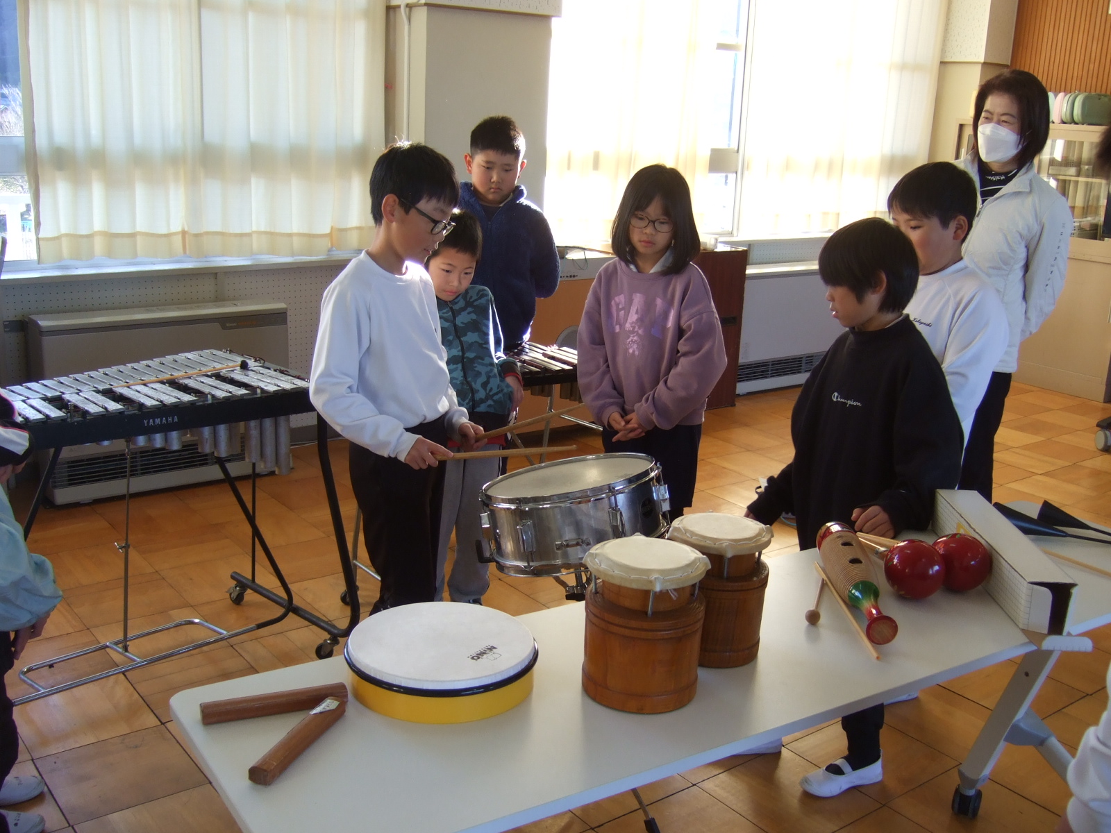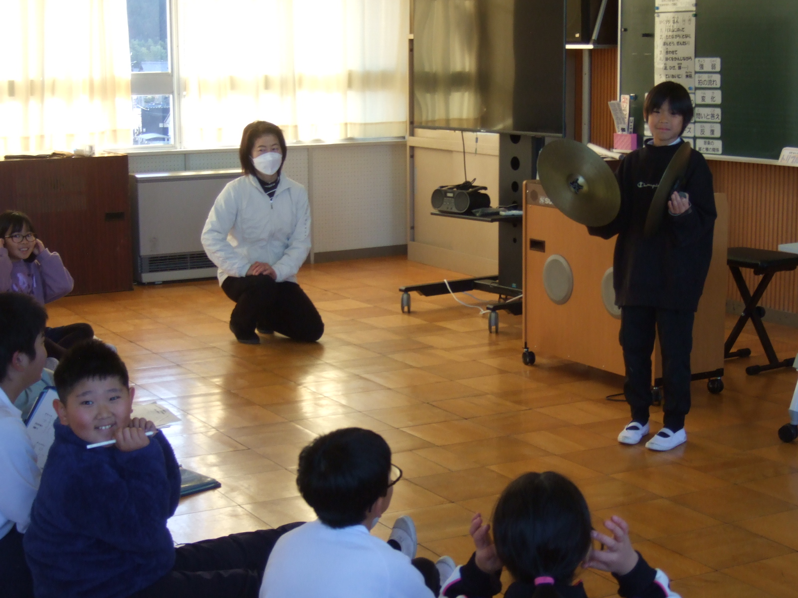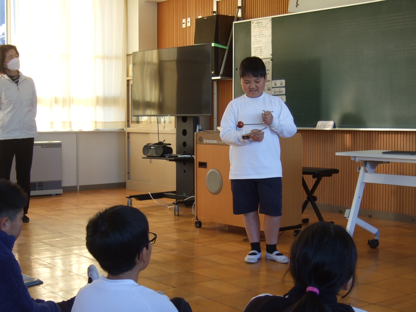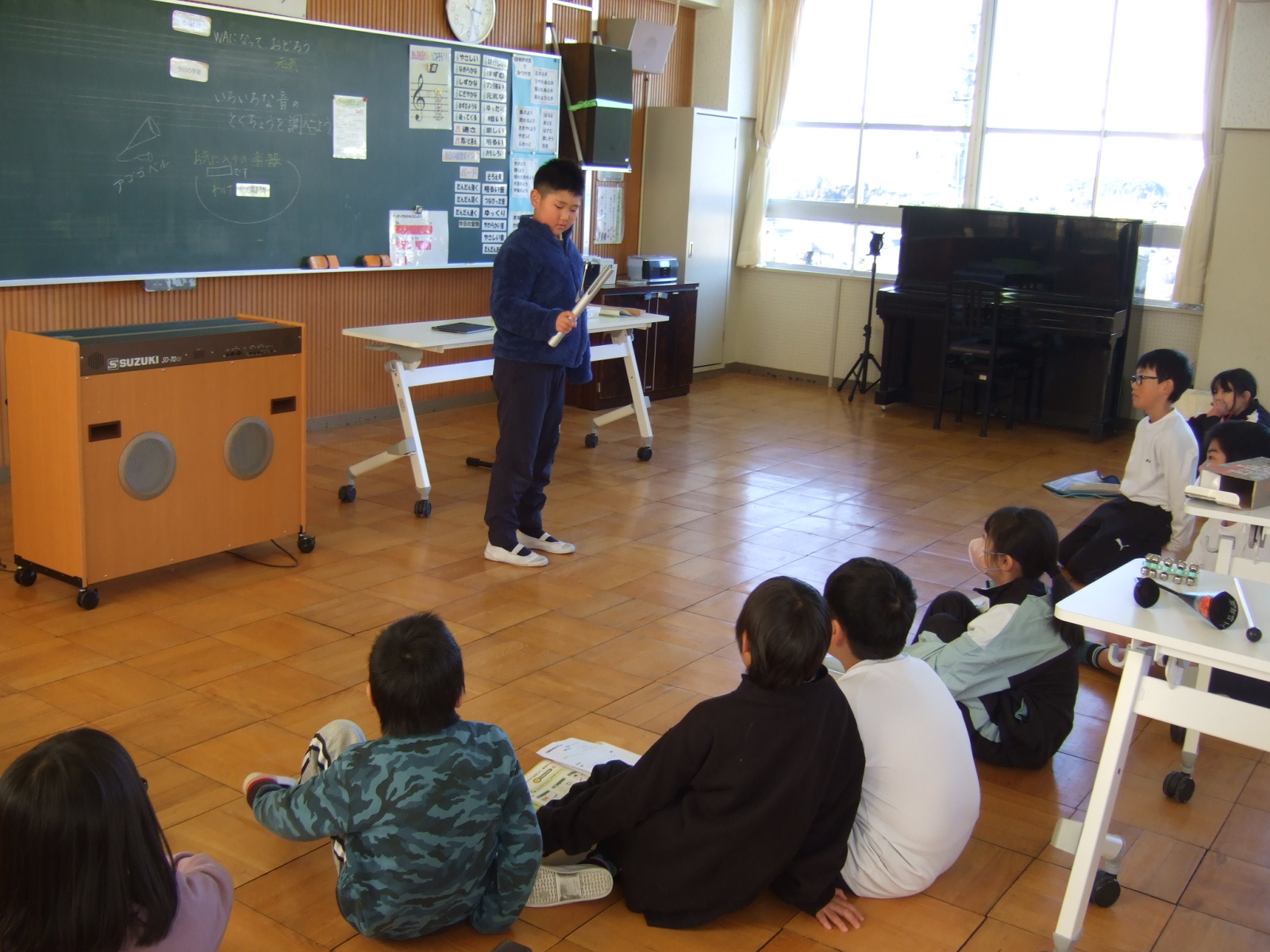 4年生は、音楽の時間に、いろんな楽器に触れて、音を楽しんでいます。今日は、自分のお気に入りの楽器を選んで、どうして選んだかをみんなの前で発表しました。