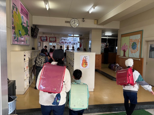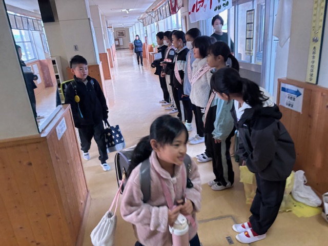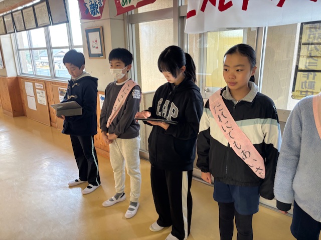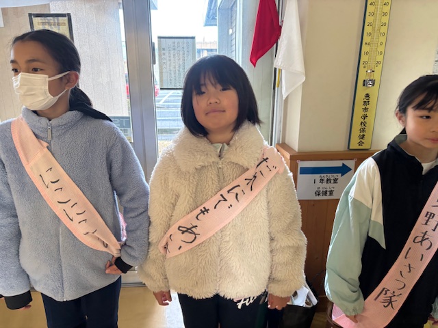 今朝は、児童会の挨拶運動、たすきをかけた児童会のメンバーが児童玄関に集合して、全校に挨拶を呼びかけました。