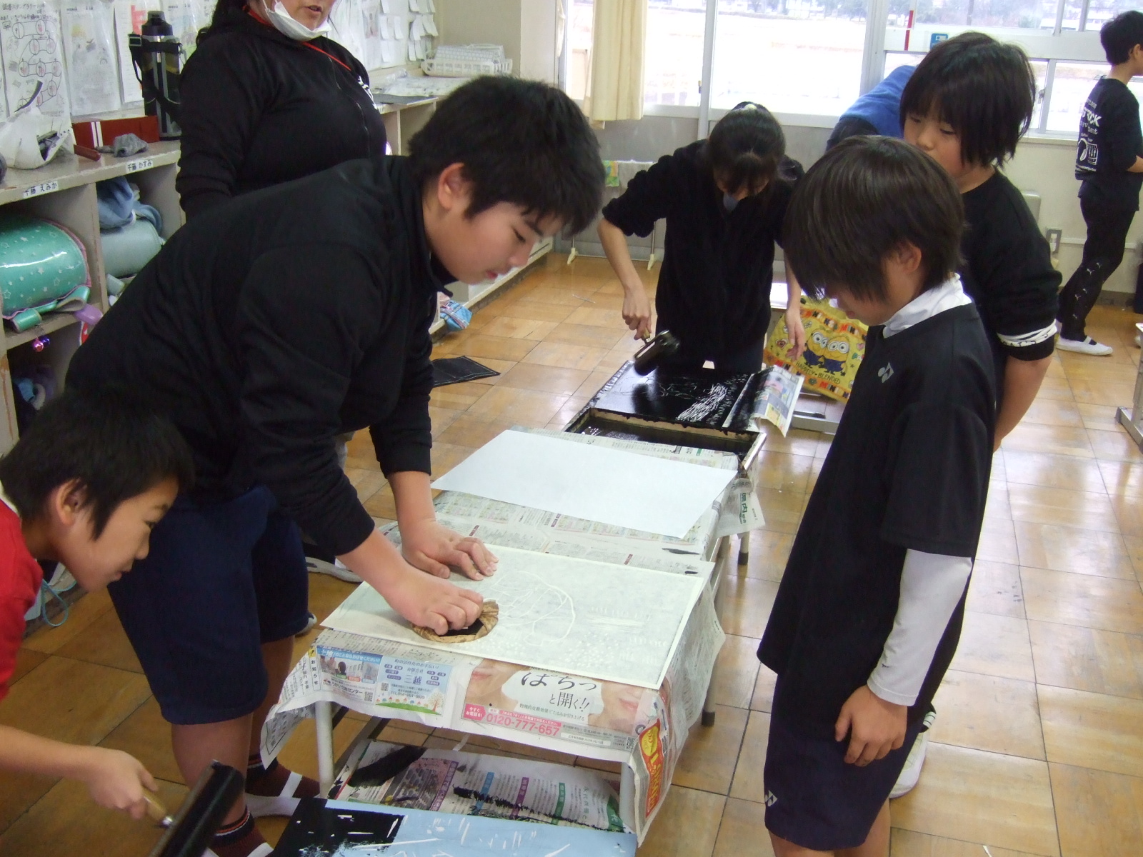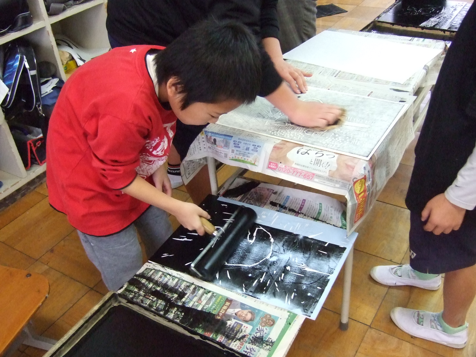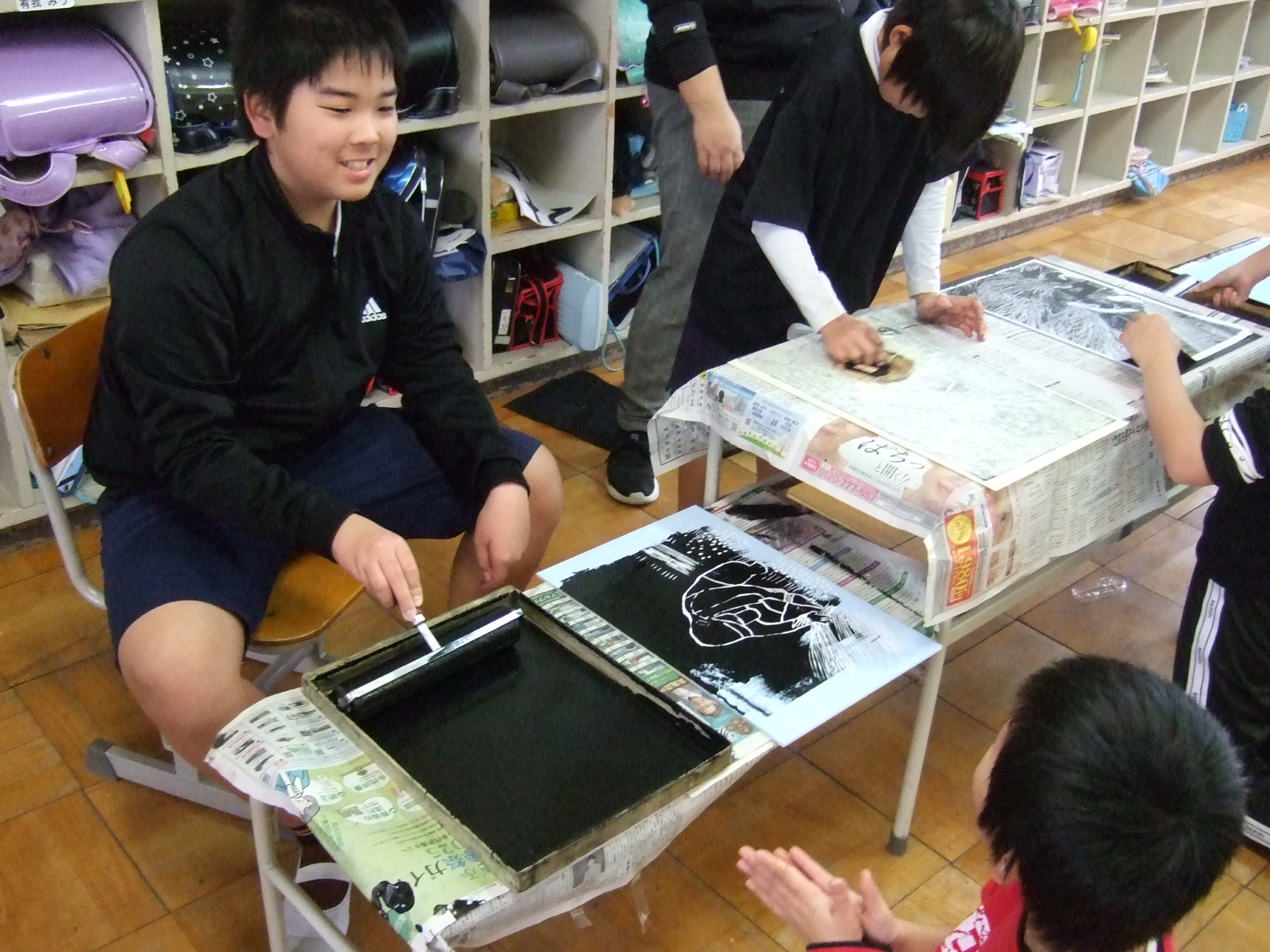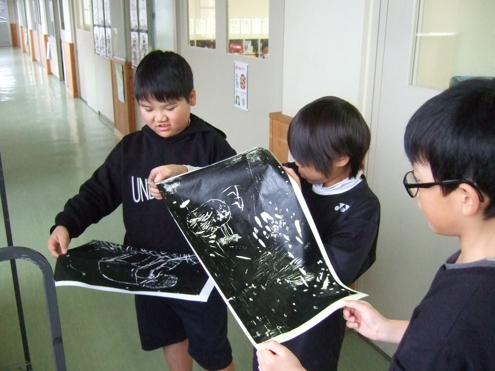 昨日、4年生は、5・6時間目に図工で3回目の版画を学習しました。少しだけ彫ってから印刷をしました。早く終わった人は、まだできていない人のお手伝いをしました・◯◯◯さんと◯◯◯さんが、印刷のためのインクをねったり、版の上に紙を置くのを手伝ってくれました。最初はあまり上手に彫れなかったけど、最後に上手に彫れるようになったので良かったです。
