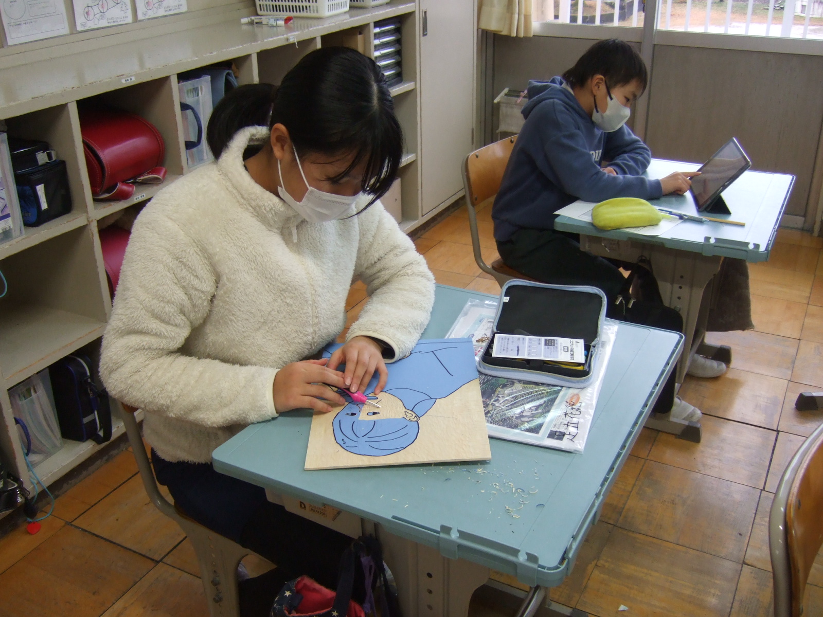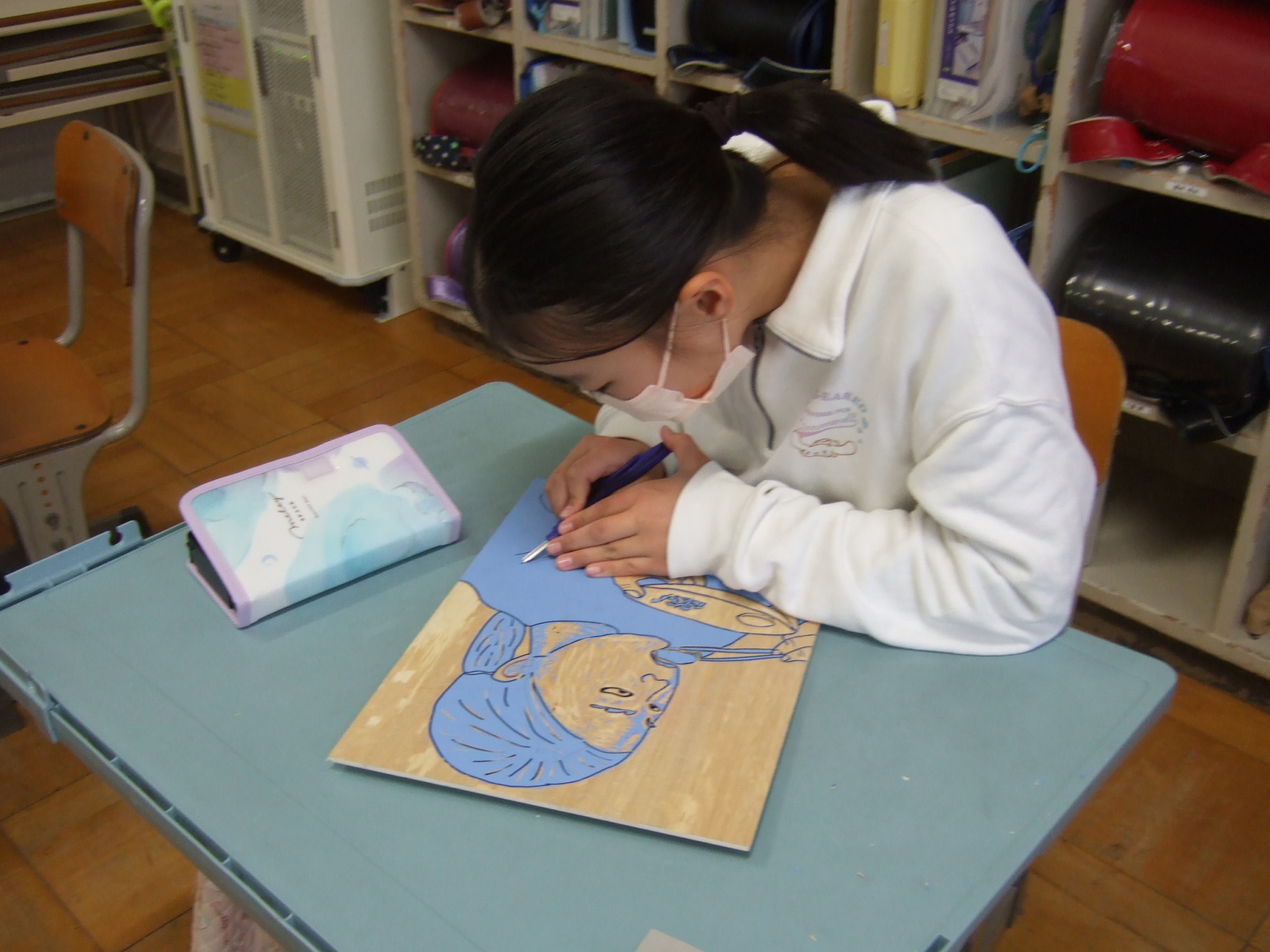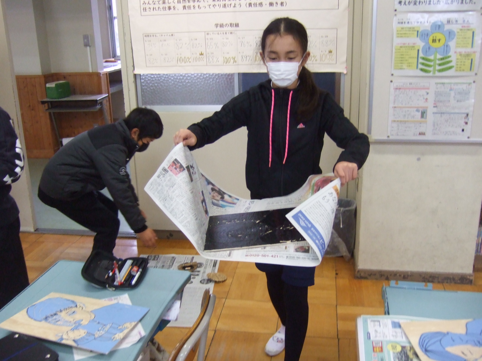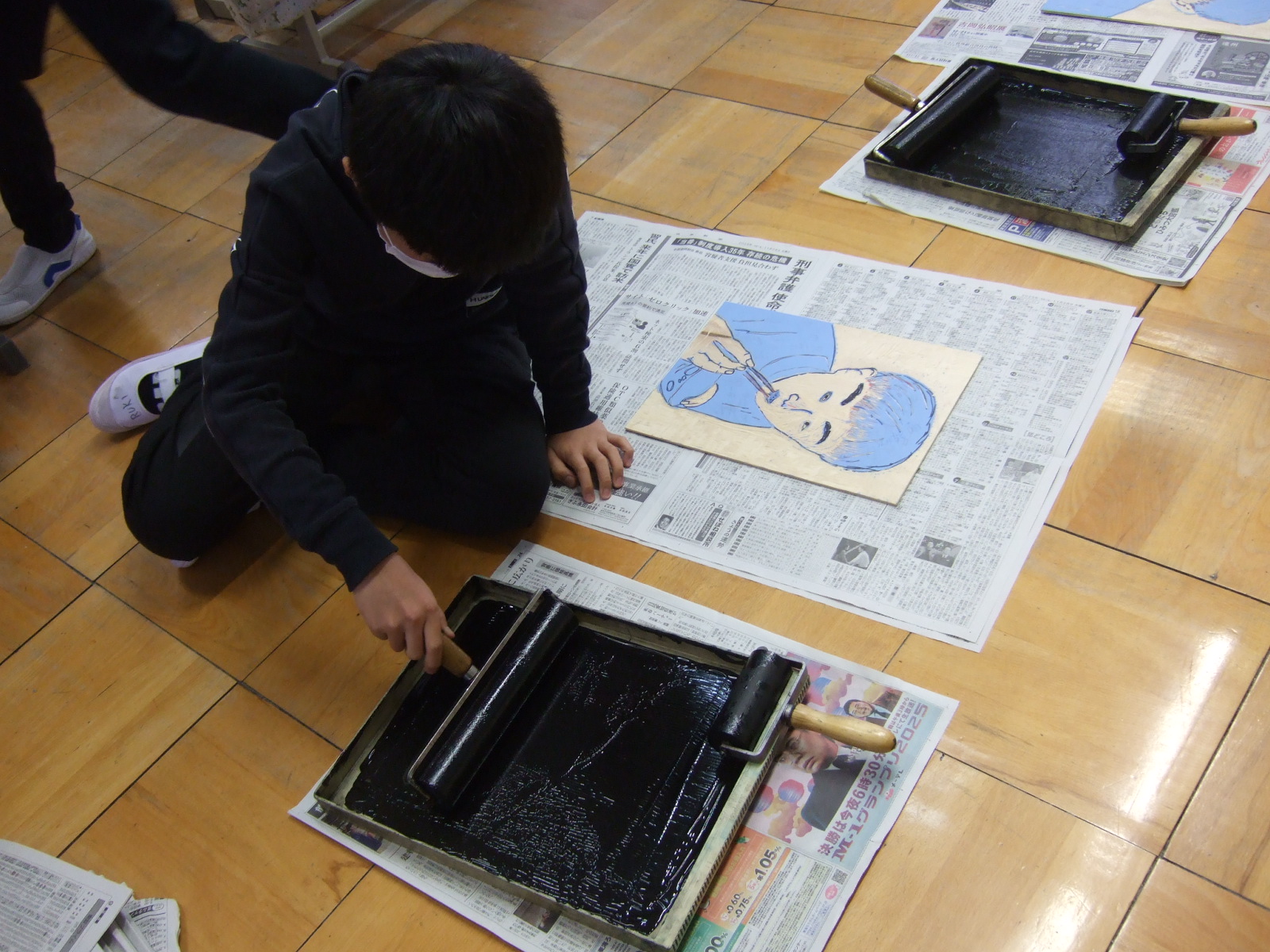 5年生は、給食で出た恵那のメニューをおいしそうに食べる自分の様子を版画に表しました。5年生は、1つレベルが上がって、面彫りです。すごい迫力の版画が刷りあがってきました。