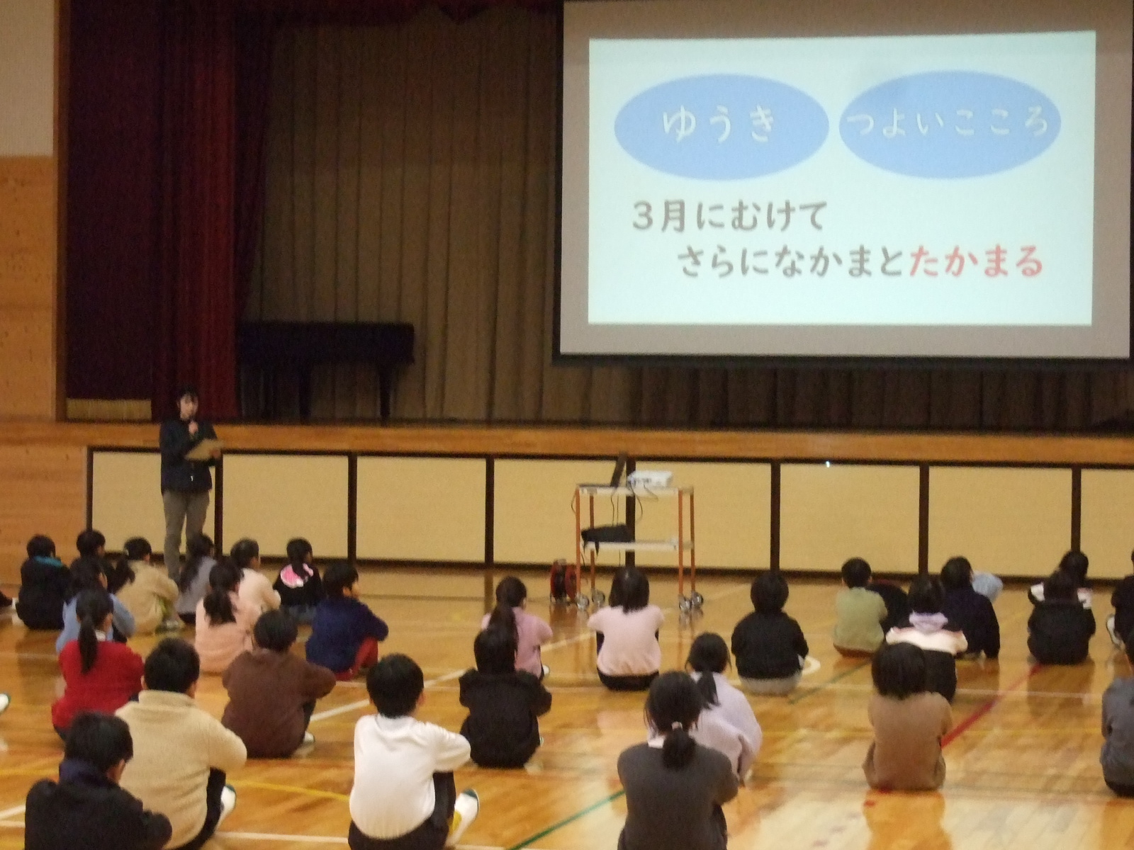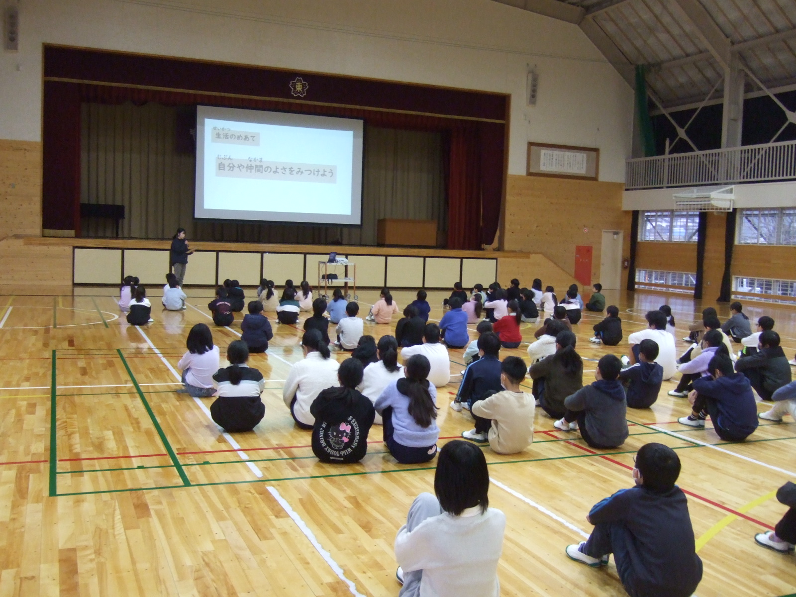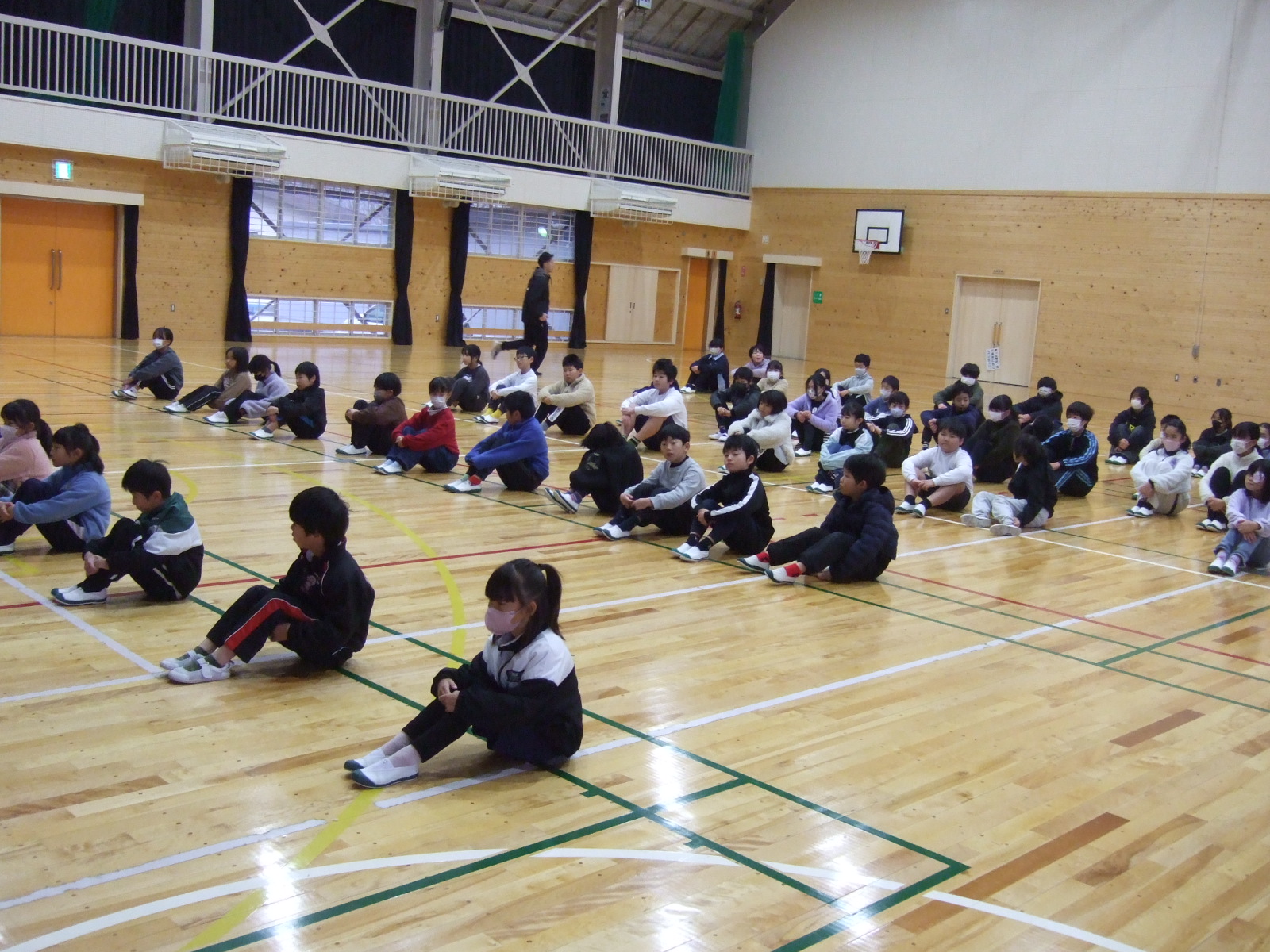 新年の集会です。一番に体育館に入場したのは2年生でした。さすがです。みんなのお手本となるように静かに体操座りをして待っていました。