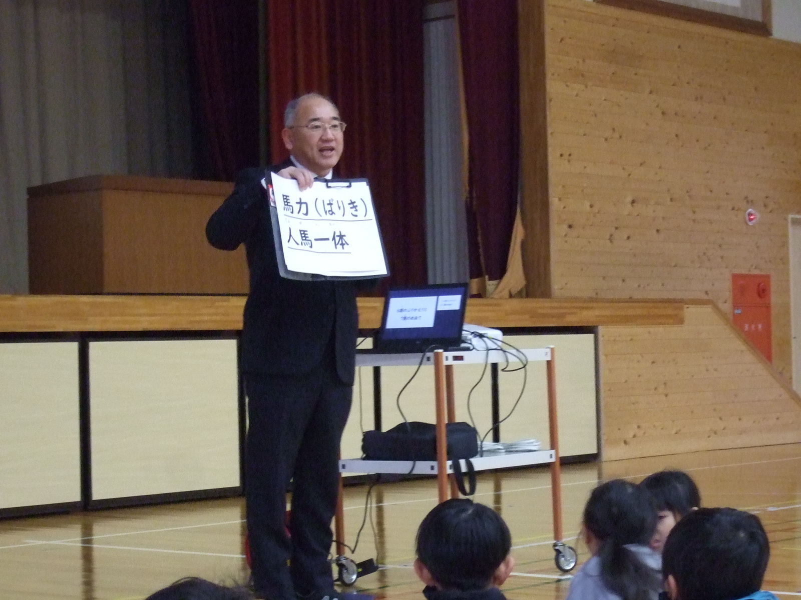 校長先生から、『今年はウマ年。馬と言えば、足が速くて、力強くて仲間と一緒に走る動物ですね。馬の文字を使った言葉「馬力」「人馬一体」などは、どれも人の思いが込められています。