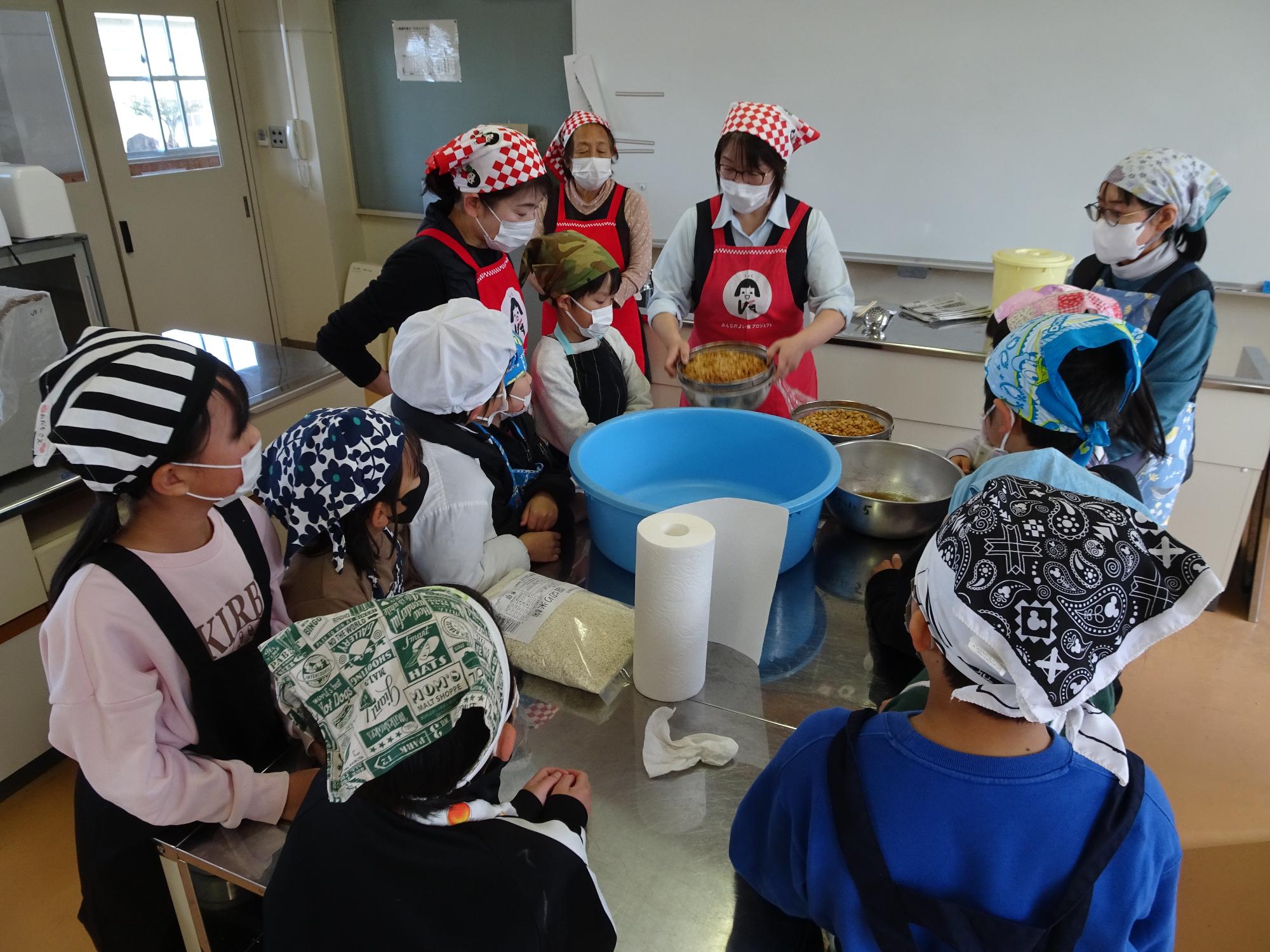 3年生は総合的な学習の時間に大豆を育ててきて先日収穫しました。(詳しくは過去のHPでご覧ください。)その収穫した大豆を使って、今日は味噌作りをしました。大豆は、若いうちにゆでて食べれば、枝豆に、収穫した大豆を炒って食べれば節分の豆に・・と実に様々なものに姿を変えて食べることができます。今日は、味噌とげんこつ飴に変わりました。